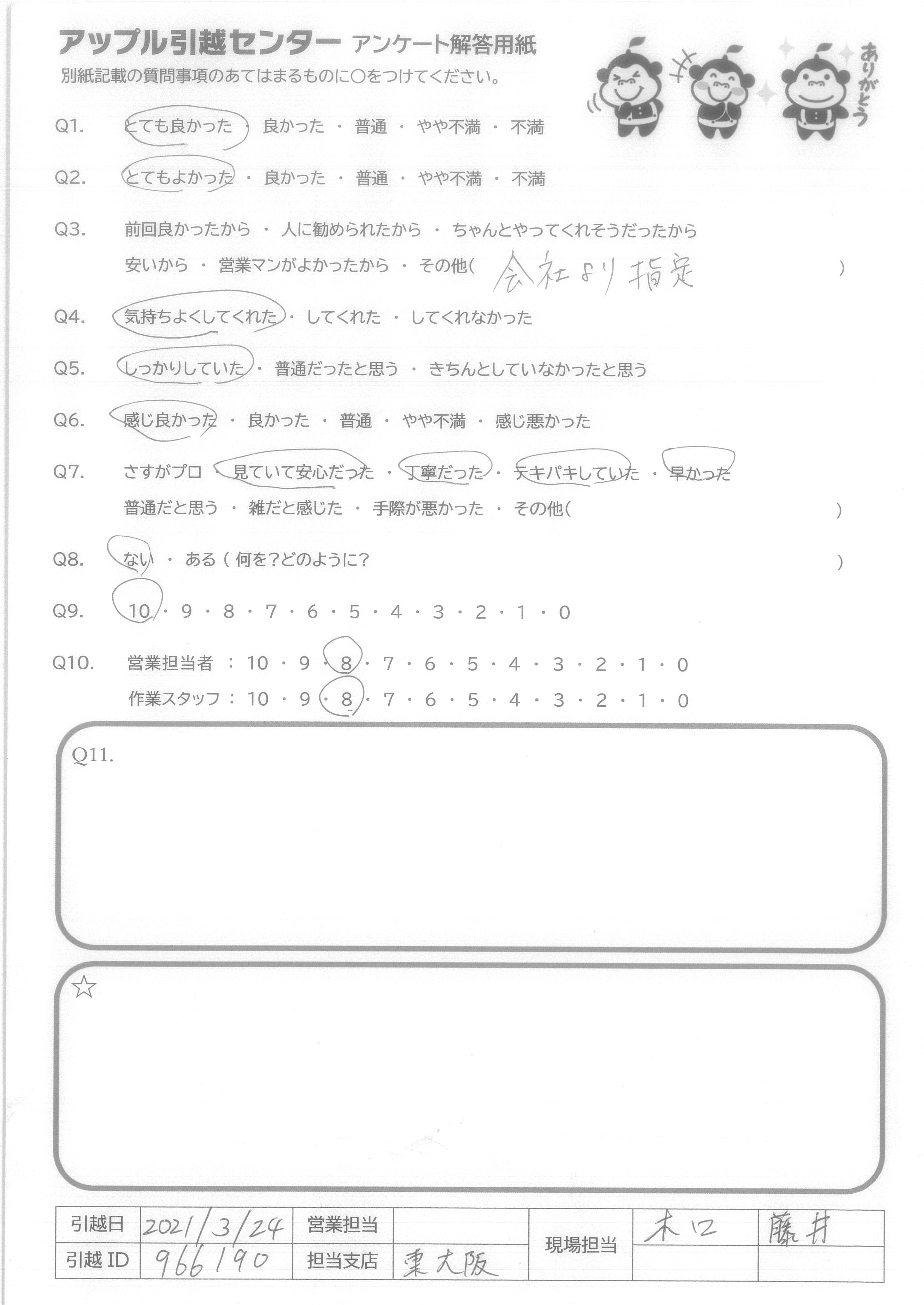 引越し日:2021年03月24日 エリア:大阪府大阪市東成区