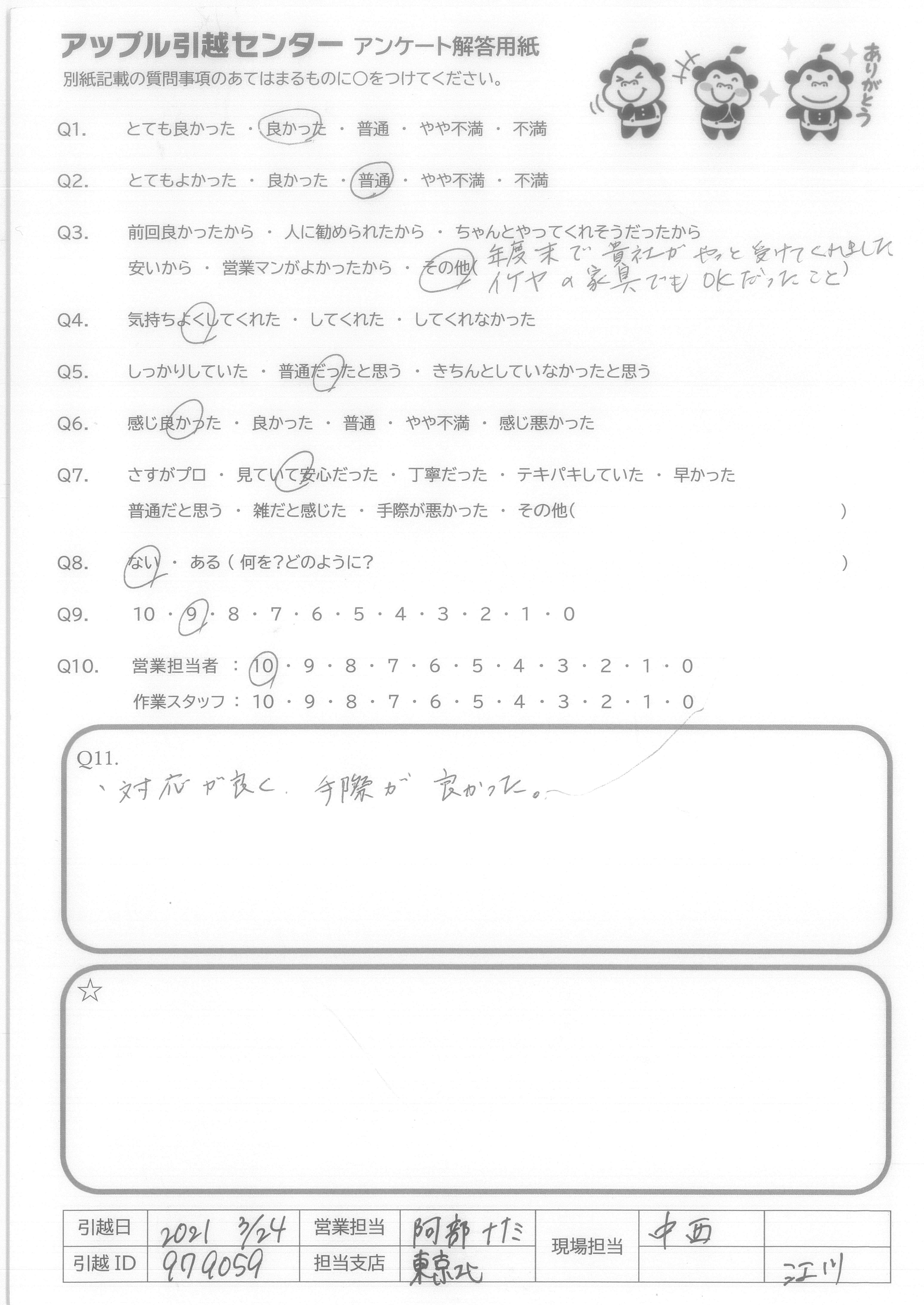 A.丁寧にテキパキとして頂きありがとうございます。無事、引っ越しできて安心しました。