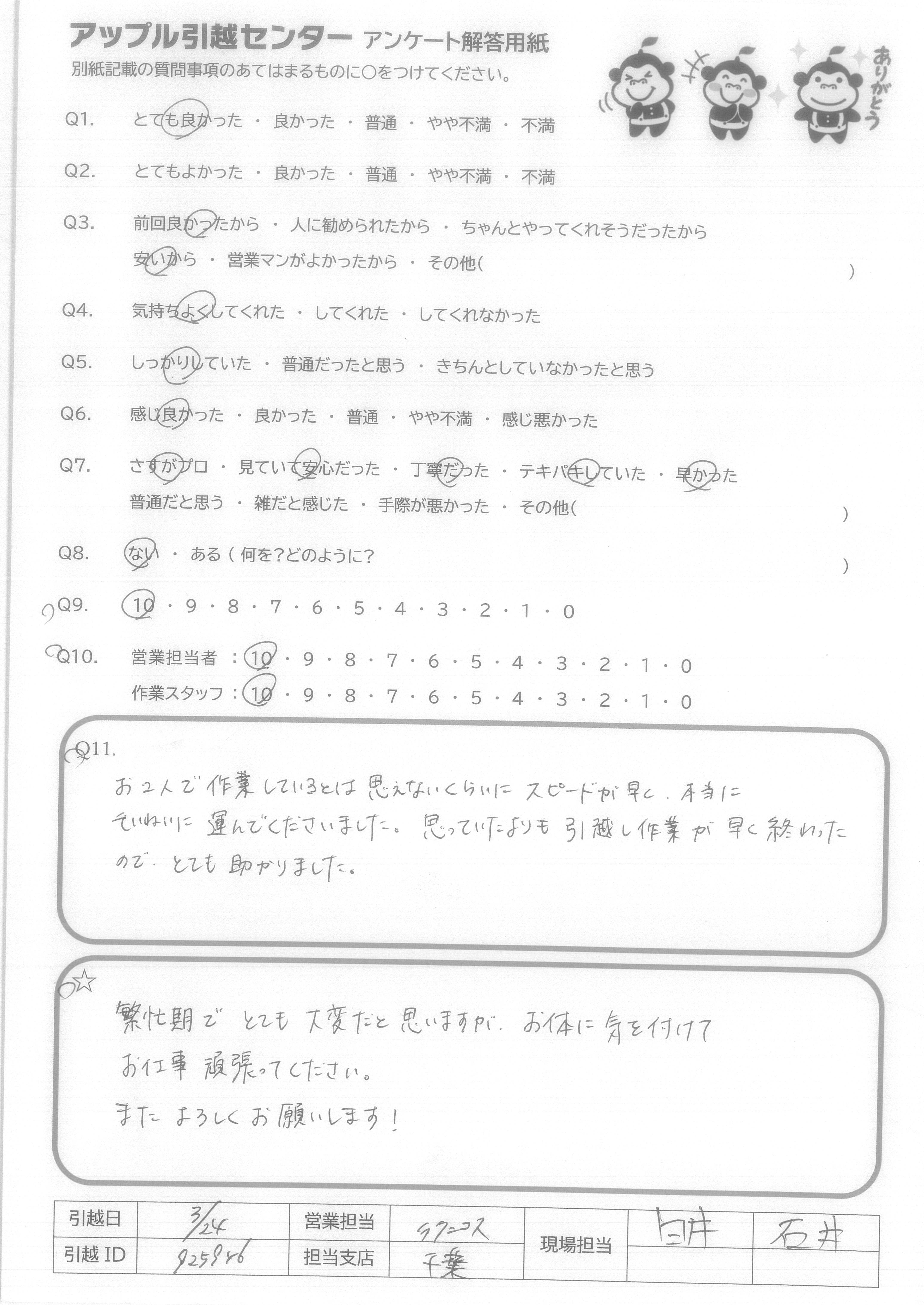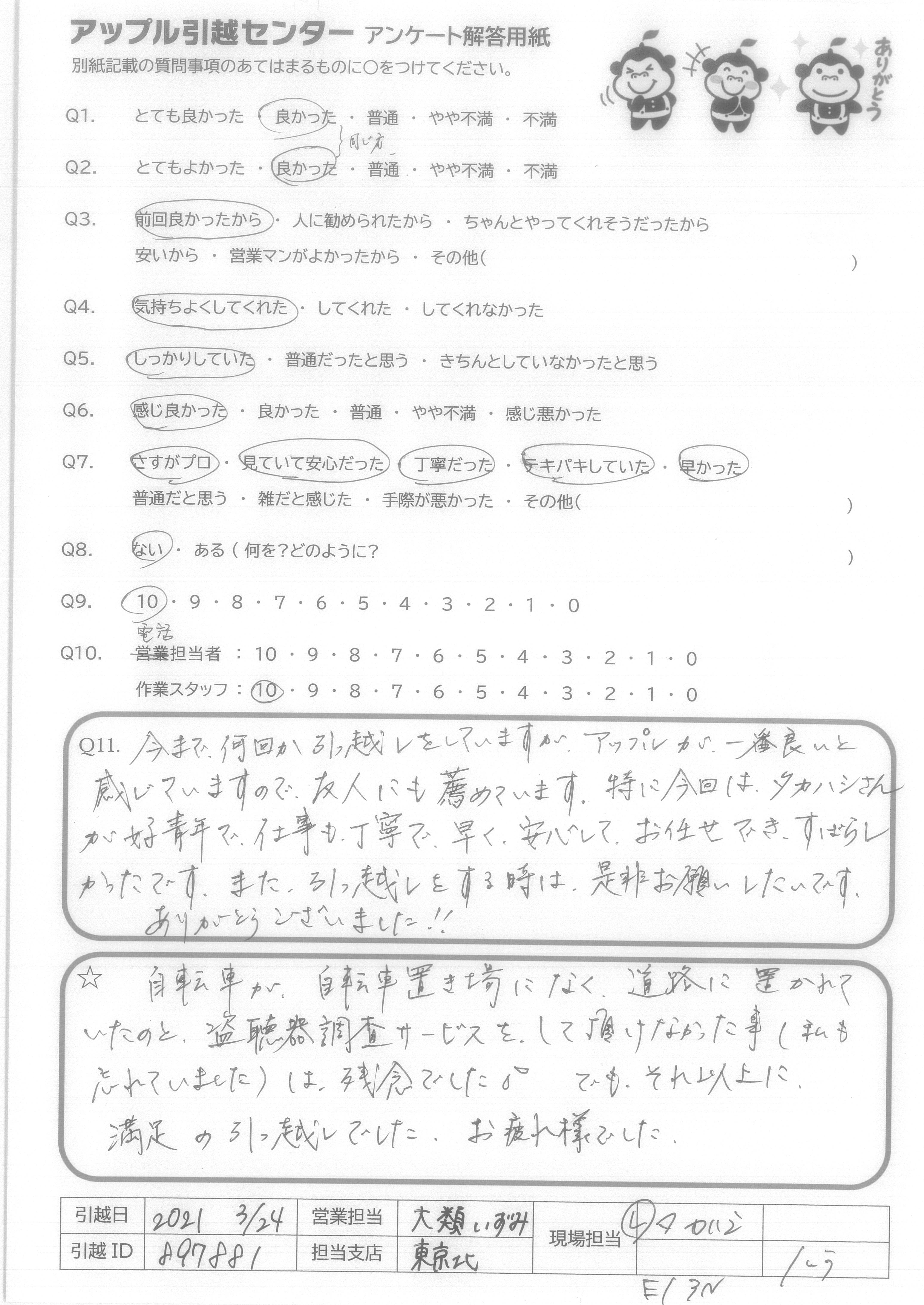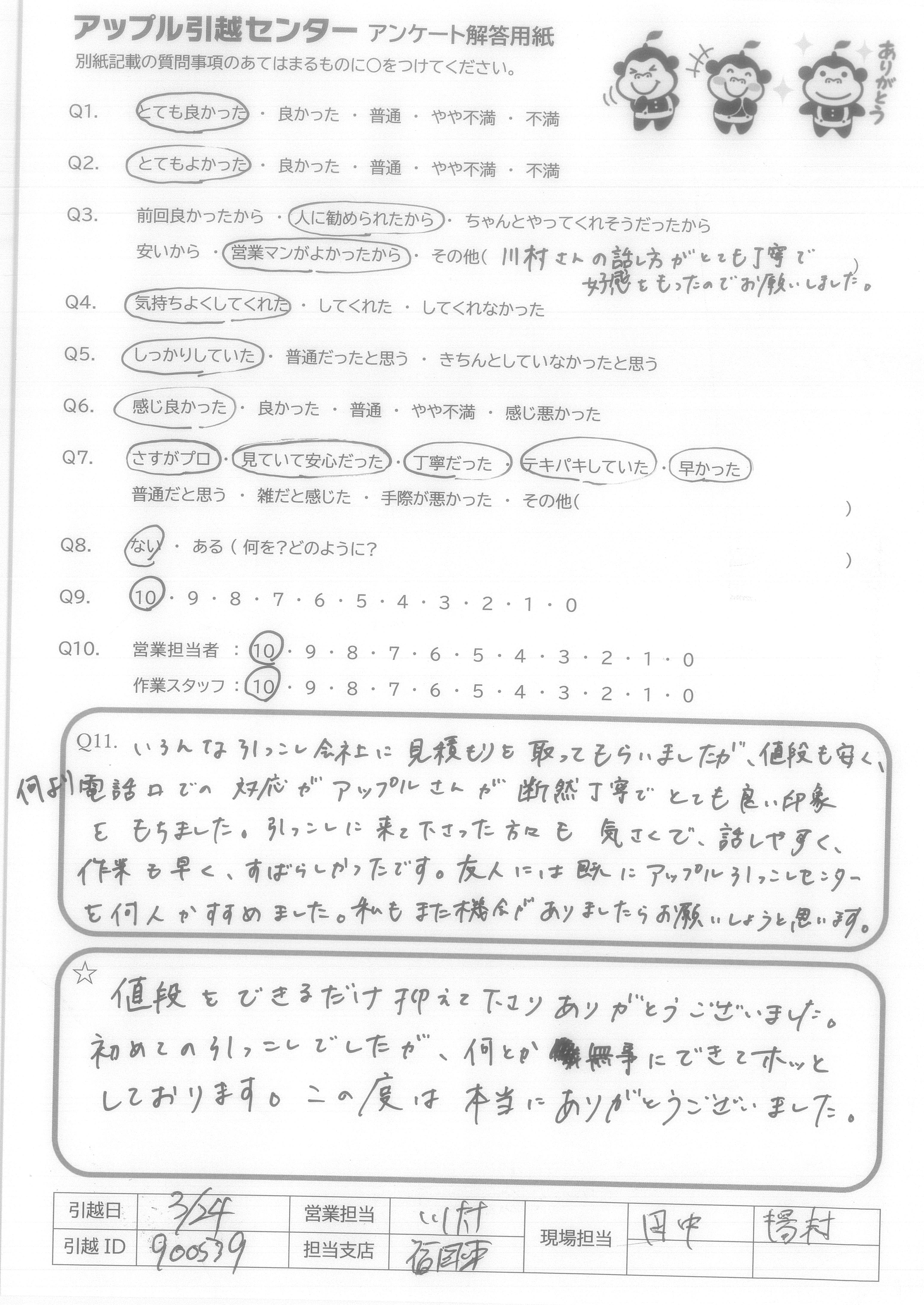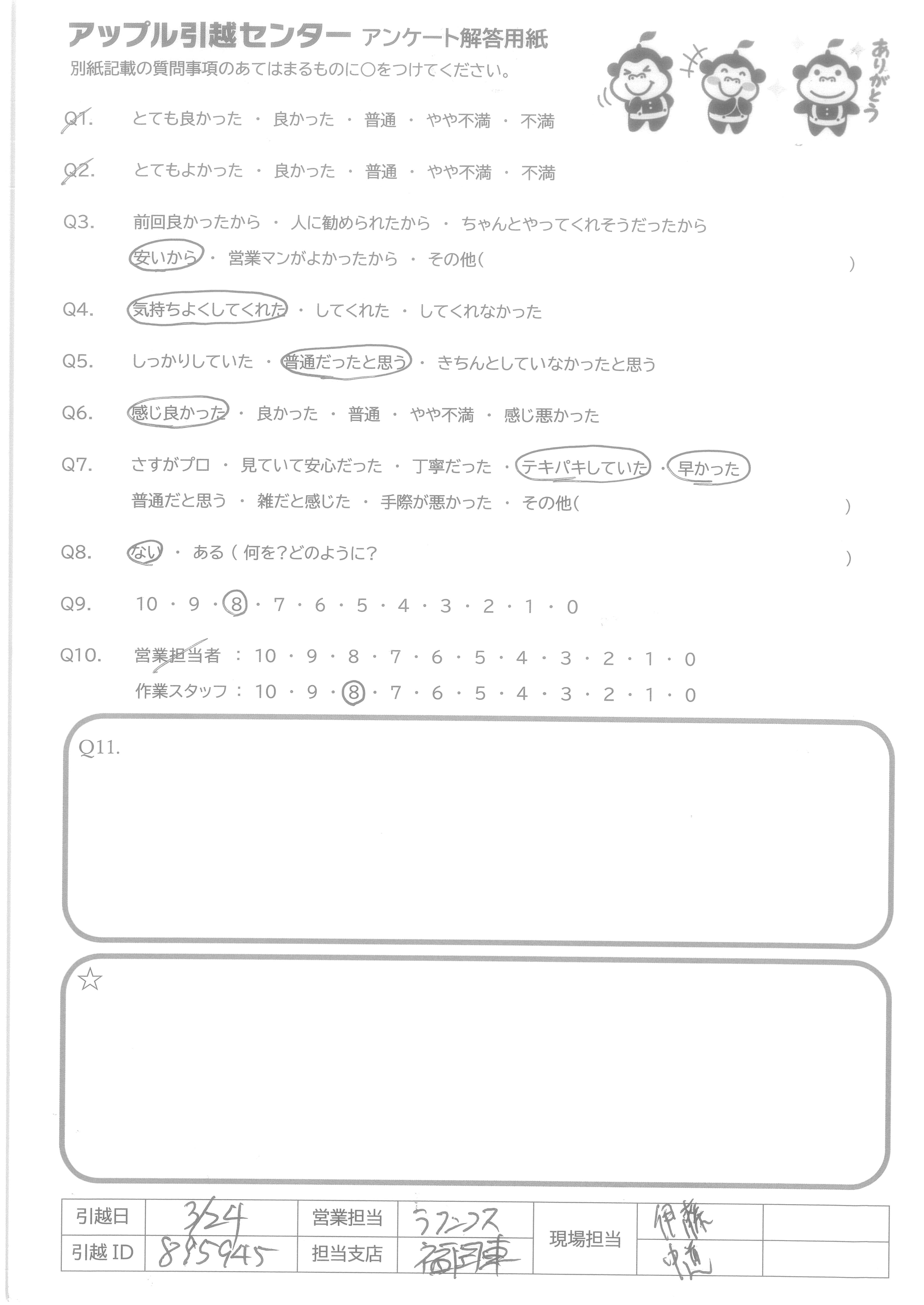 A.今まで何回か引っ越しをしていますが、アップルが一番良いと感じていますので、友人にも薦めています。特に今回はタカハシさんが好青年で仕事も丁寧で、早く、安心してお任せでき、すばらしかったです。また、引っ越しをする時は是非お願いしたいです。 ありがとうございました!!