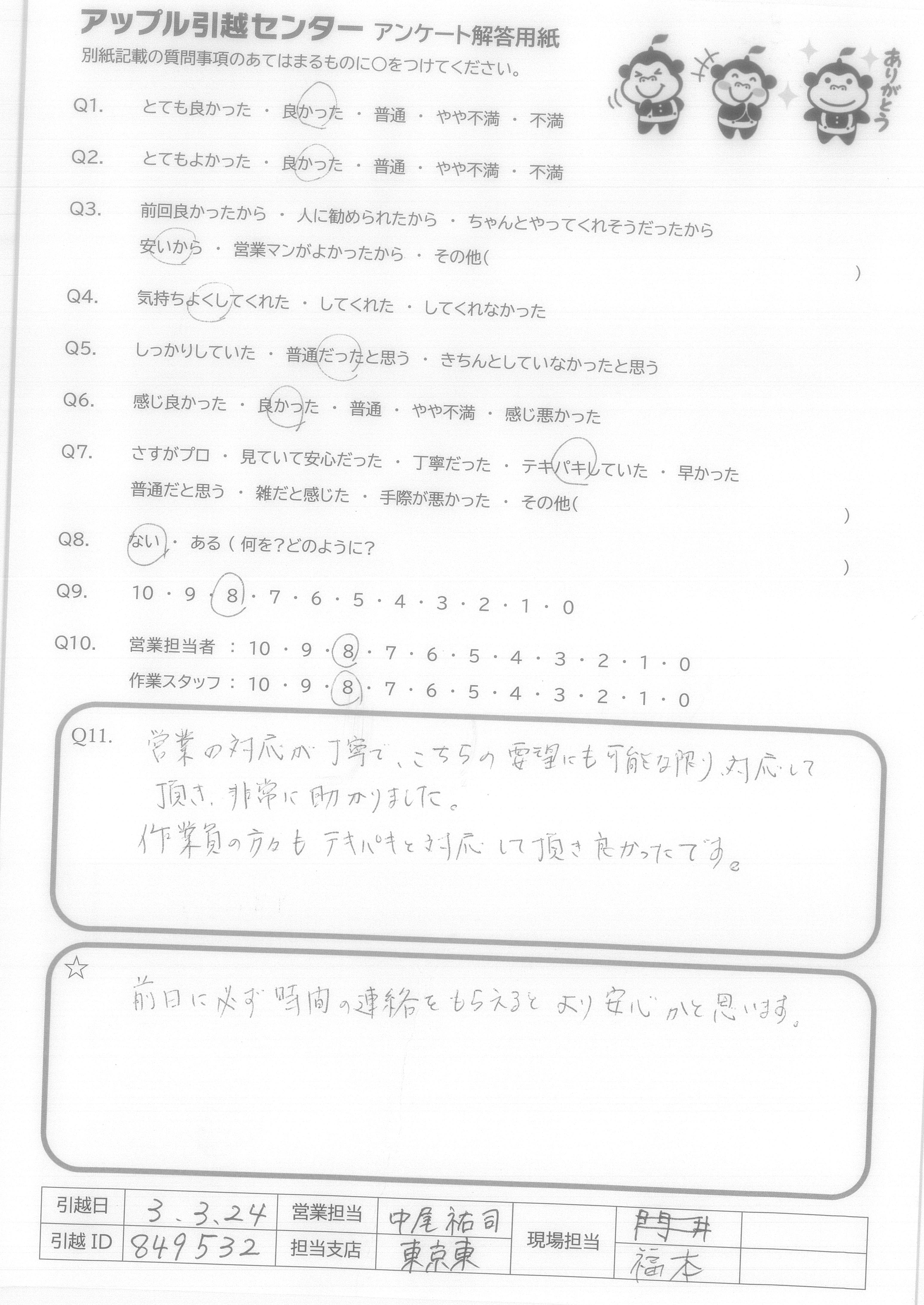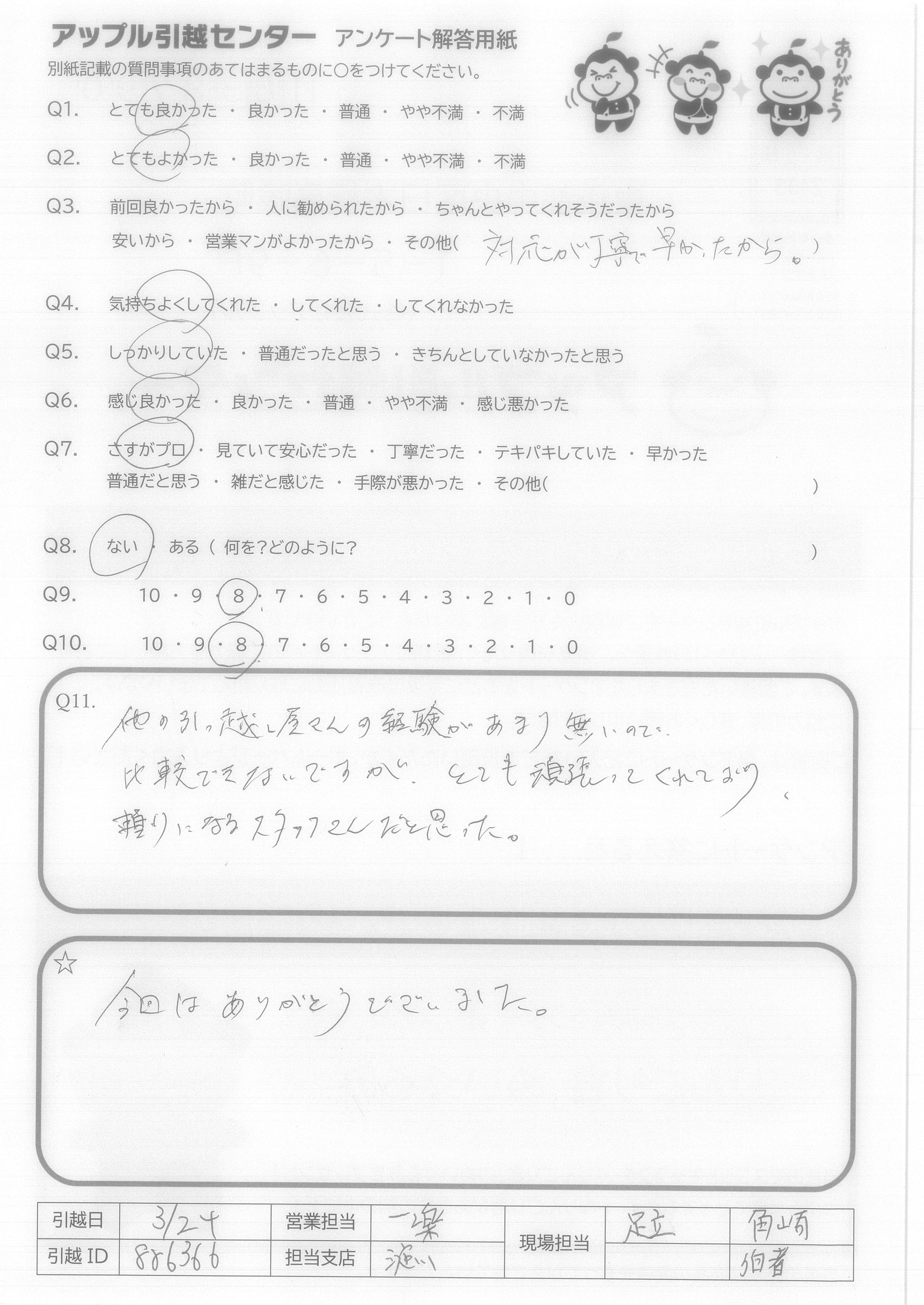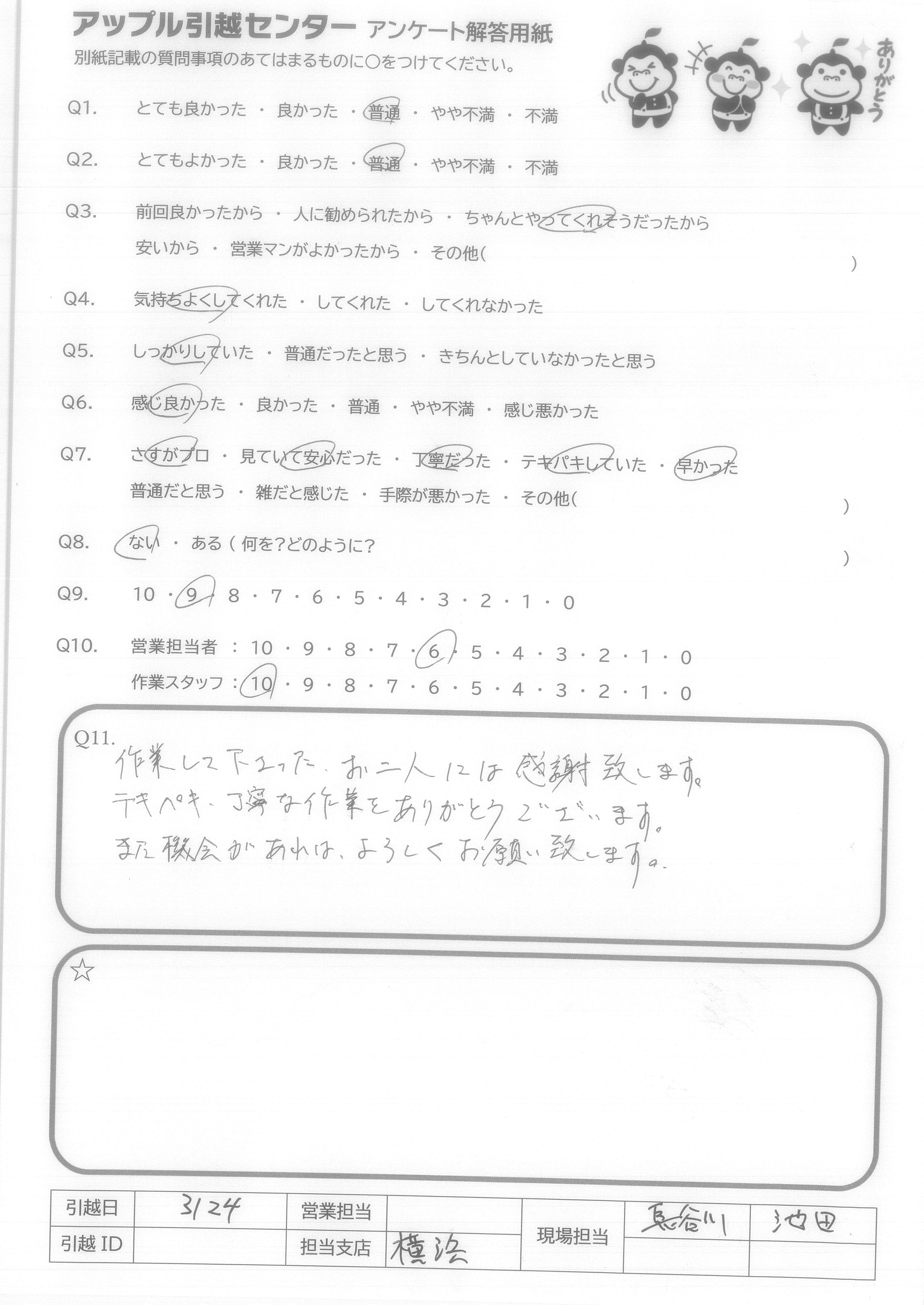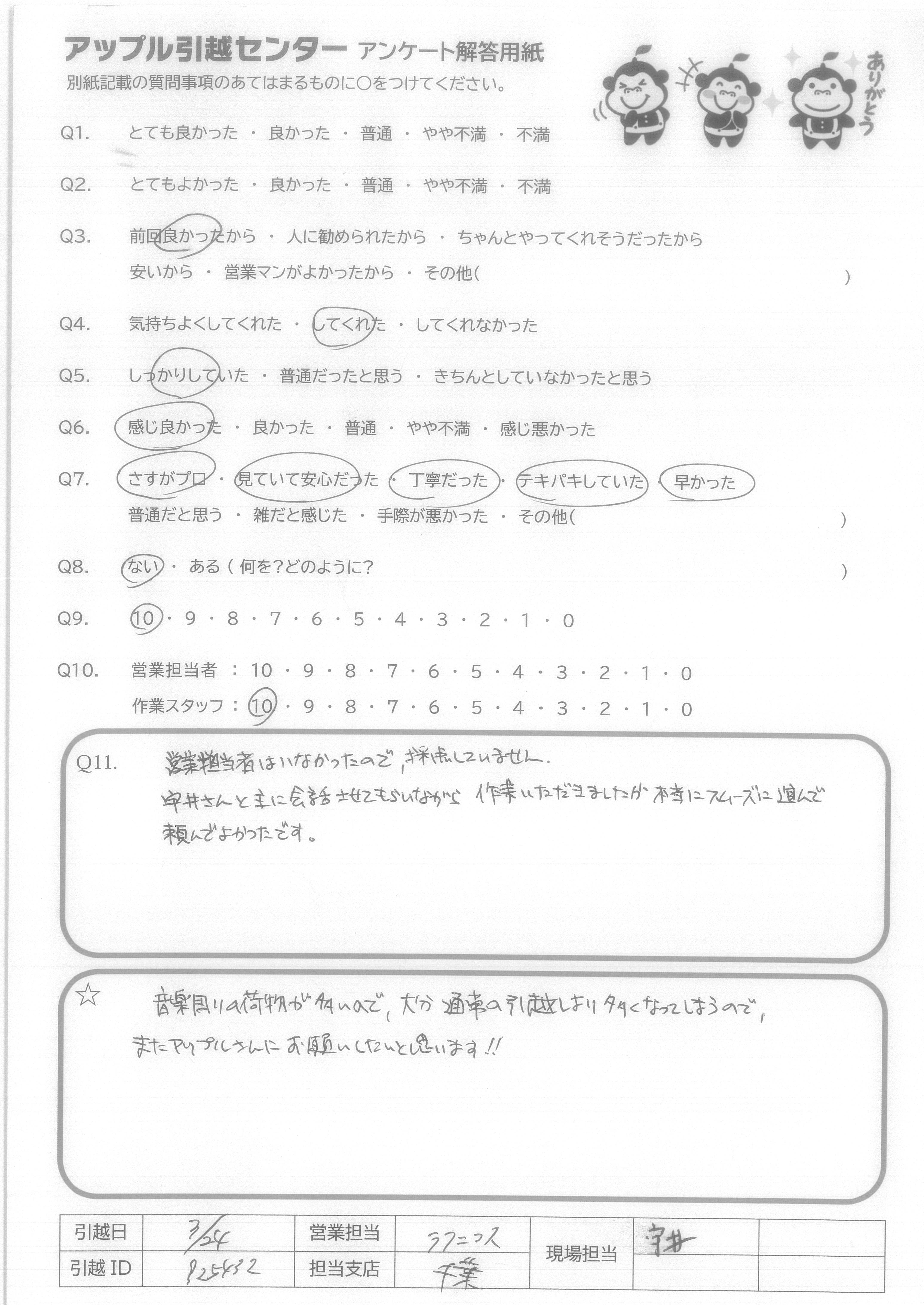 A.今まで何回か引っ越しをしていますが、アップルが一番良いと感じていますので、友人にも薦めています。特に今回はタカハシさんが好青年で仕事も丁寧で、早く、安心してお任せでき、すばらしかったです。また、引っ越しをする時は是非お願いしたいです。 ありがとうございました!!