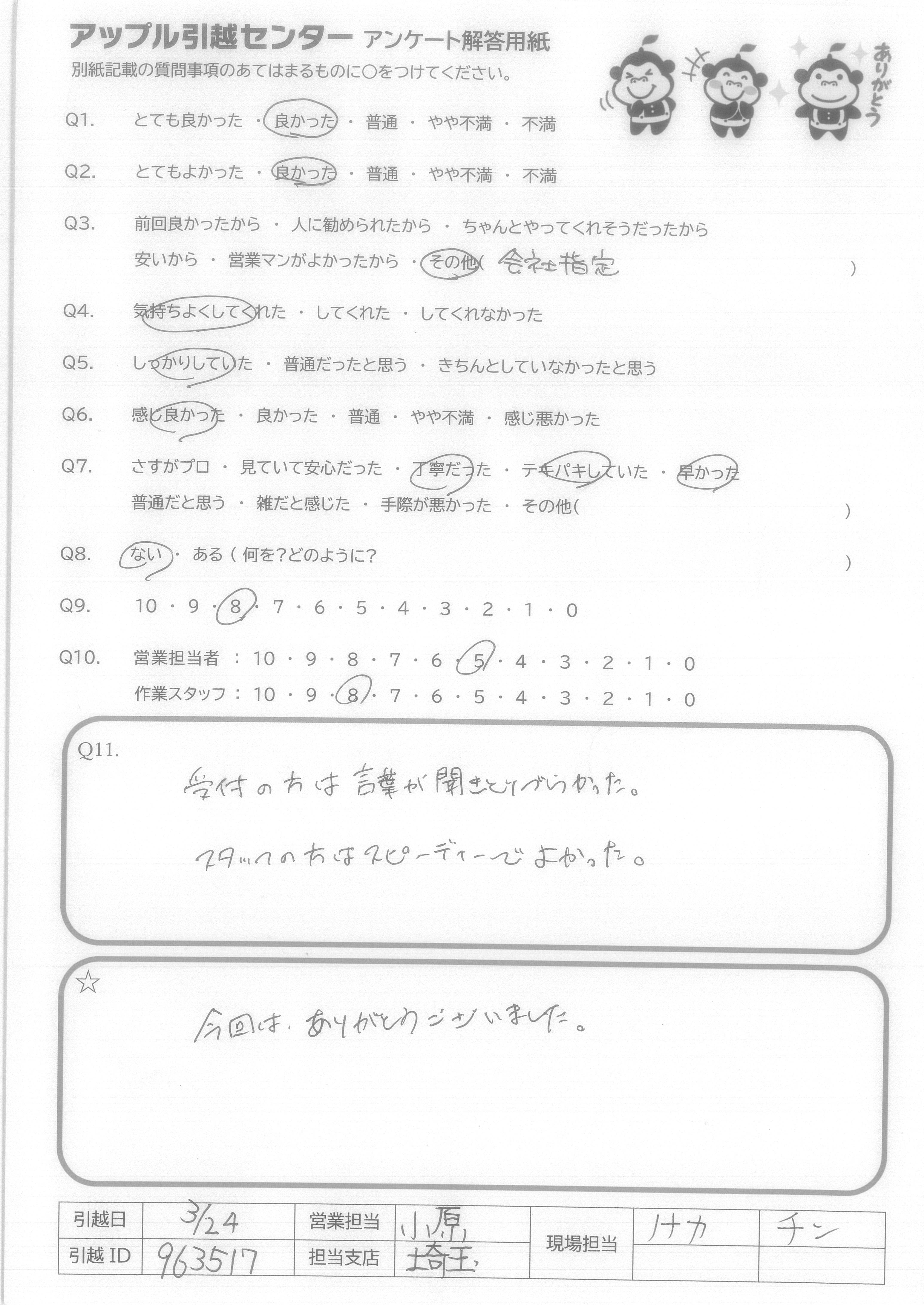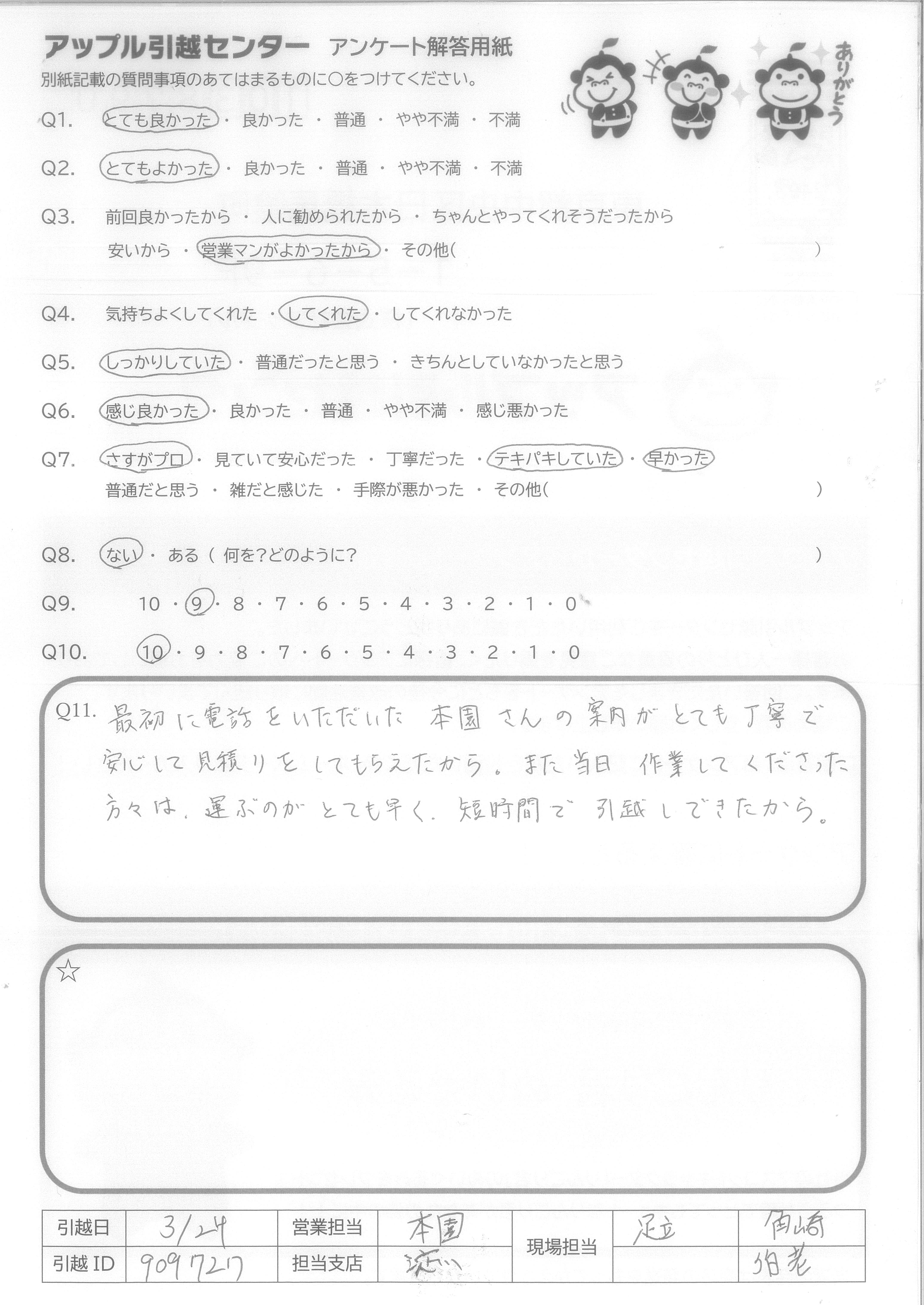 A.最初に電話をいただいた本園さんの案内がとても丁寧で安心して見積りをしてもらえたから。また当日作業してくださった方々は運ぶのがとても早く、短時間で引越しできたから。