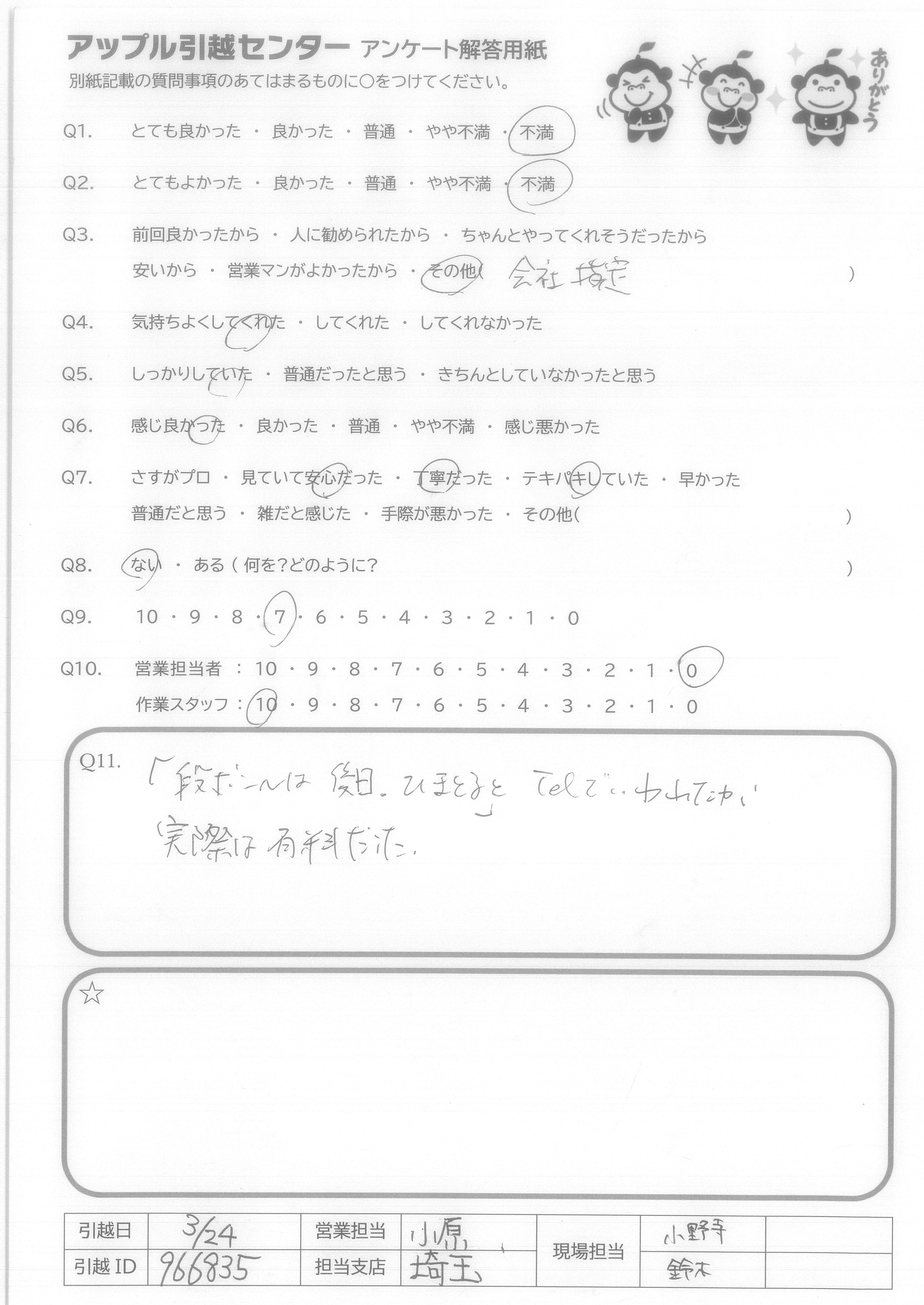 A.自転車が、自転車置き場になく、道路に置かれていたのと盗聴器調査サービスをして頂けなかった事(私も忘れていました)は残念でした。でも、それ以上に、満足の引っ越しでした。お疲れ様でした。