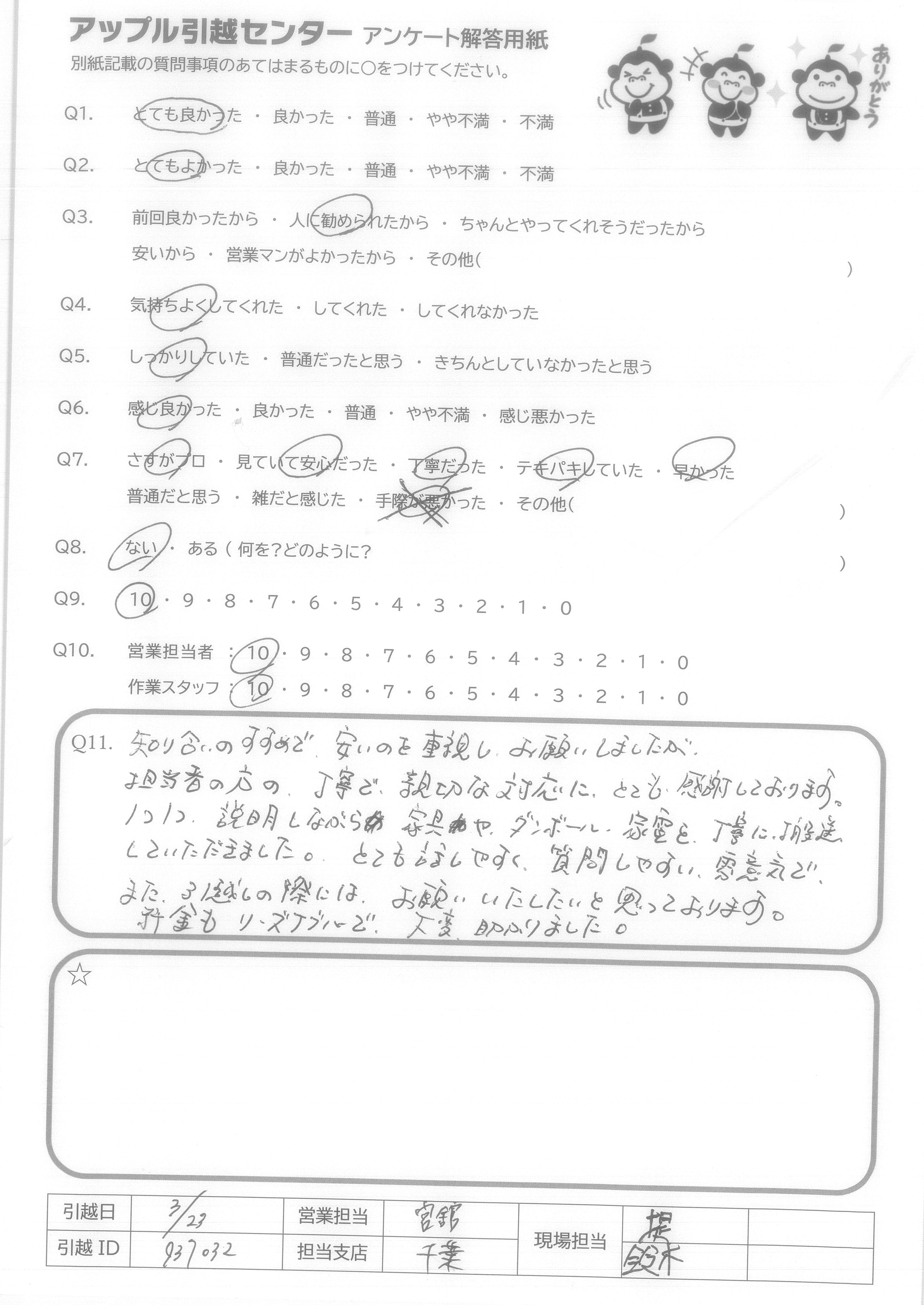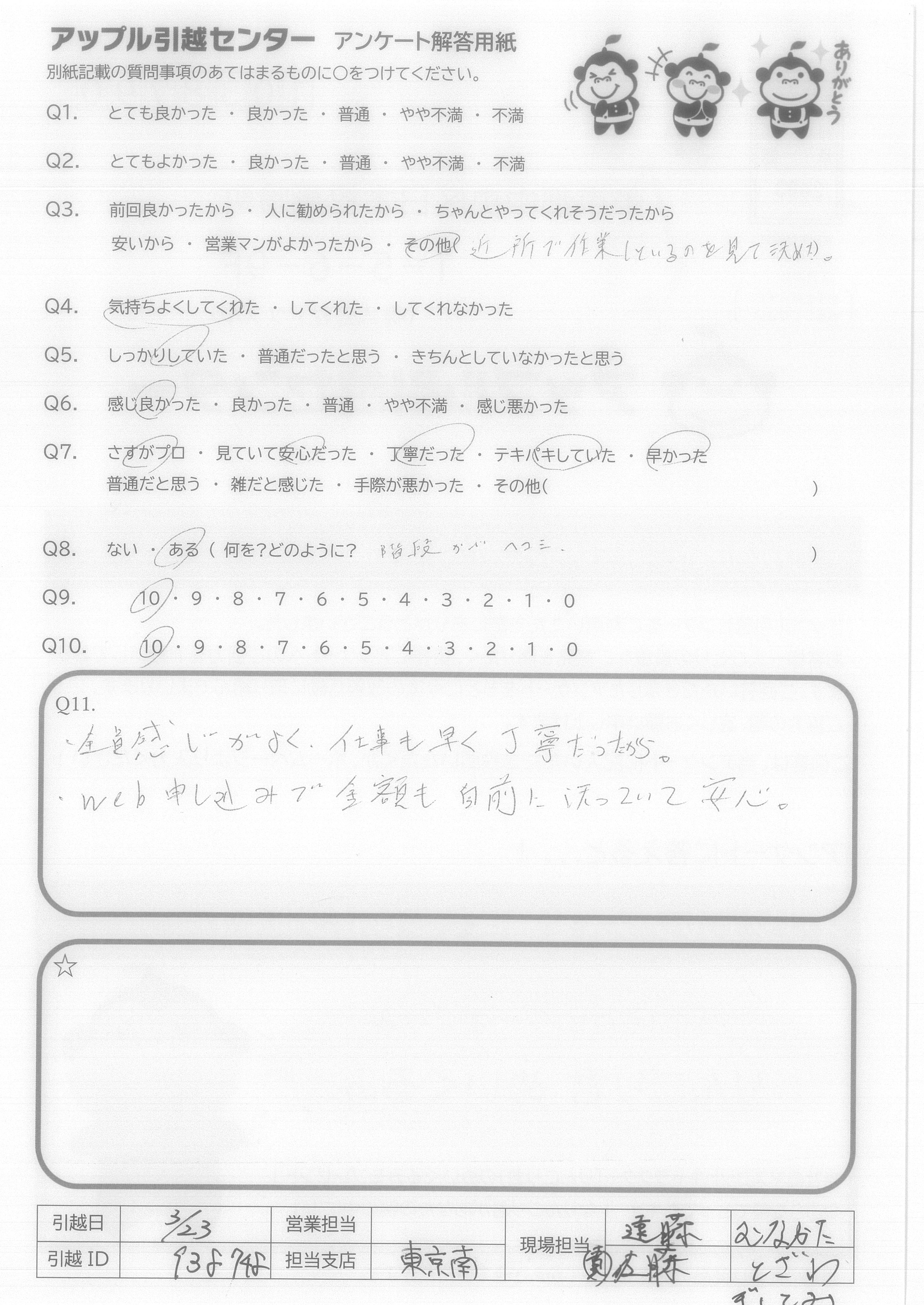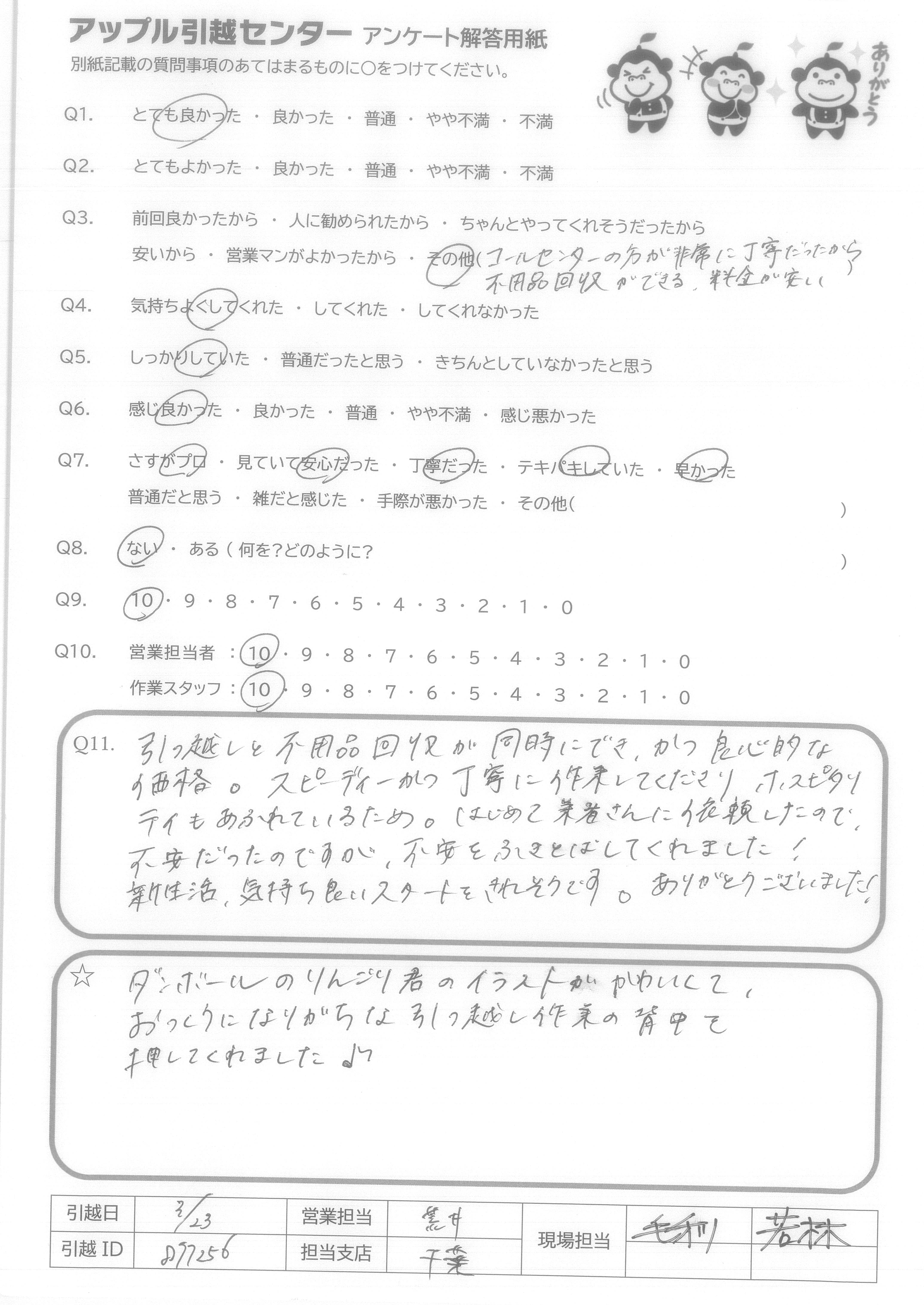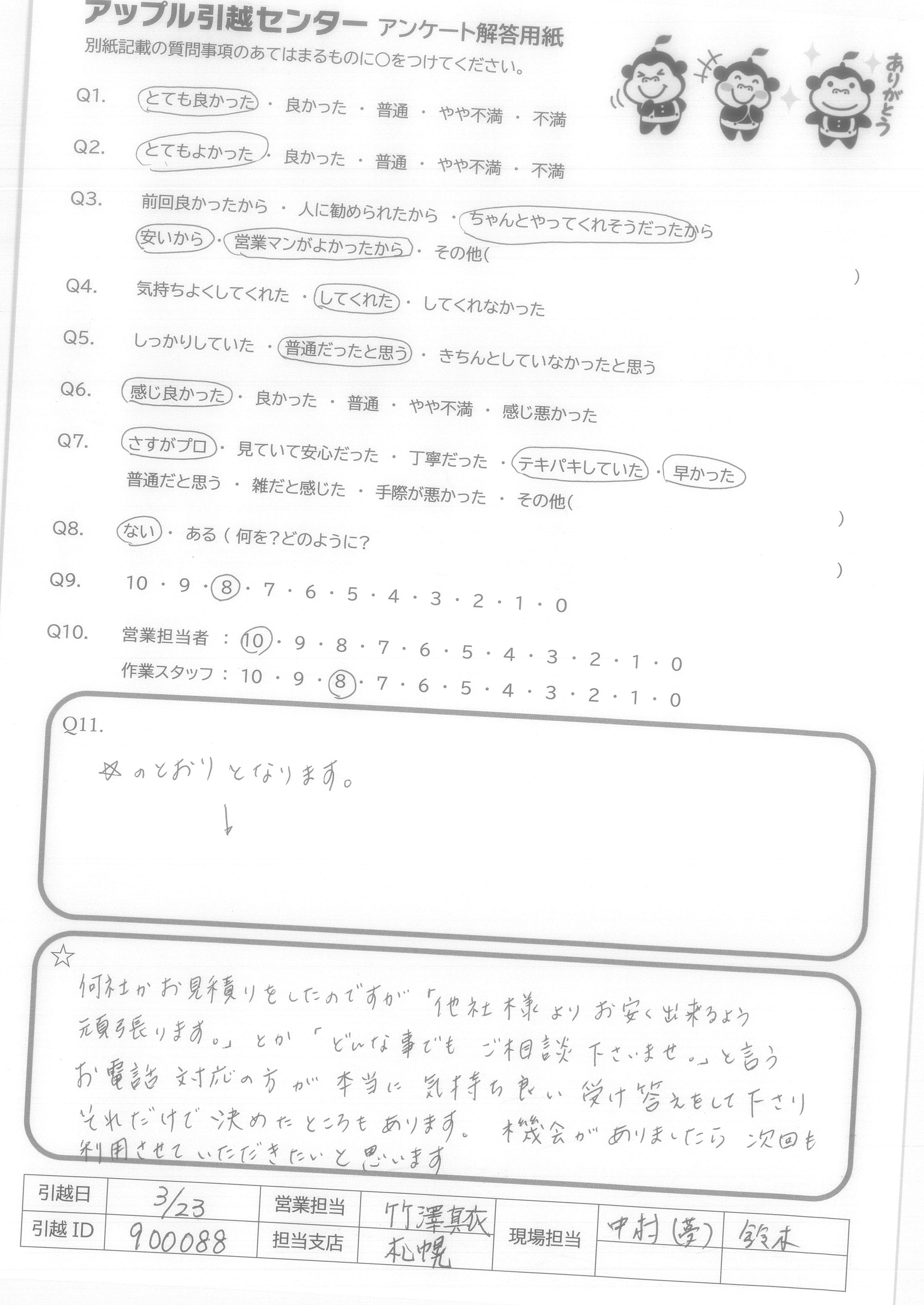 A.今回アップル引っ越しに頼んで本当に正解でした。女性が対応してくれた時ほっとしました。 今後のご活躍期待しております。