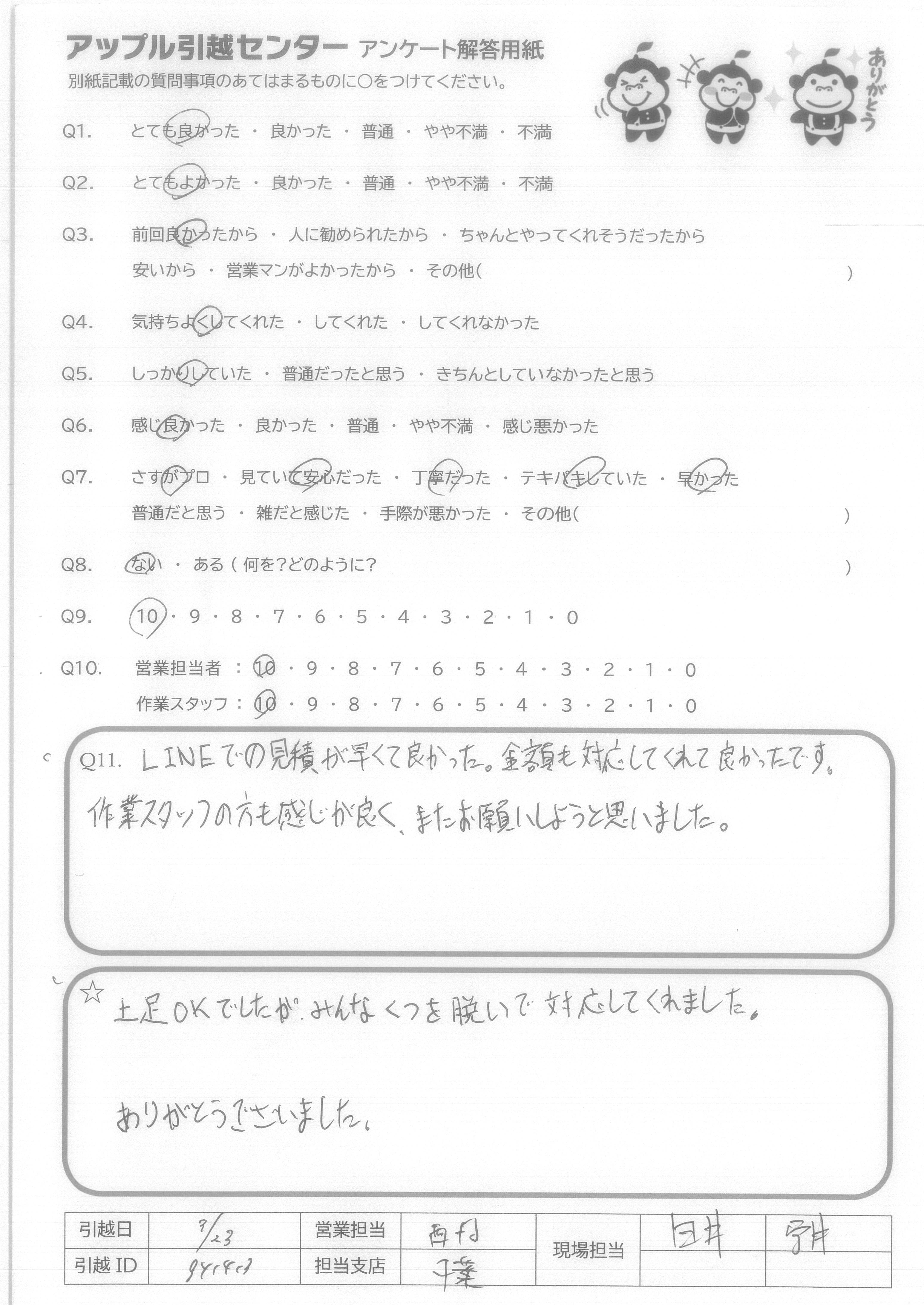 A.日程について決められず何度もお電話しましたが、丁寧にご対応いただき有り難かったです。 また当日はガスの立ち会いや鍵の受け渡しの予定が詰まっていたことから、引っ越し開始時間の無理を言ってしまいすみませんでした。柔軟にご対応いただいたお陰でスムーズにスケジュールを進められました。本当にありがとうございました。 現場スタッフの方々にはテキパキと、安全に気持ちよく作業していただきました。感謝しております。
