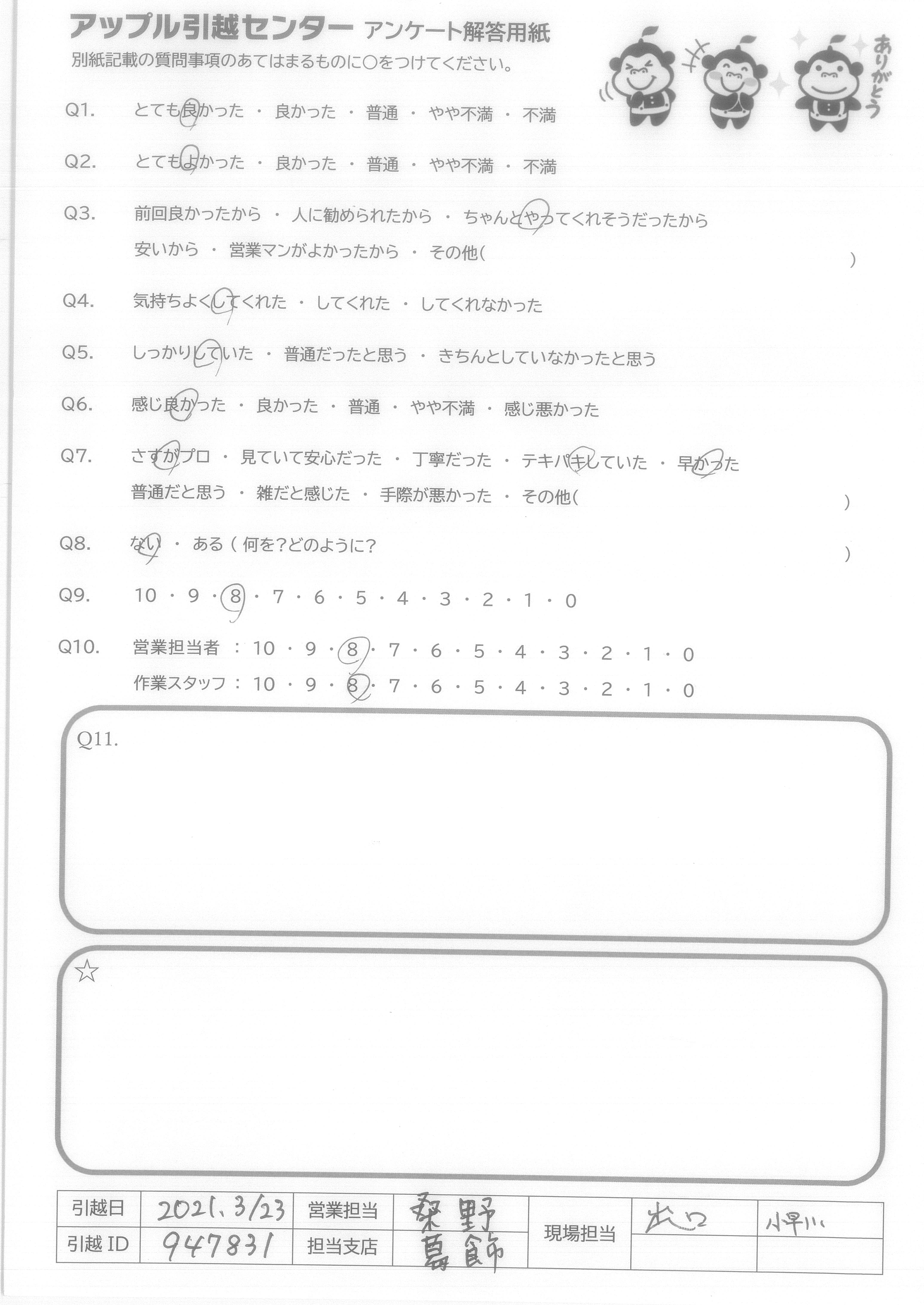 A.いつもイケメンのお兄さん方が来るので楽しみにしています笑 また次回も引っ越すときはよろしくお願いします!