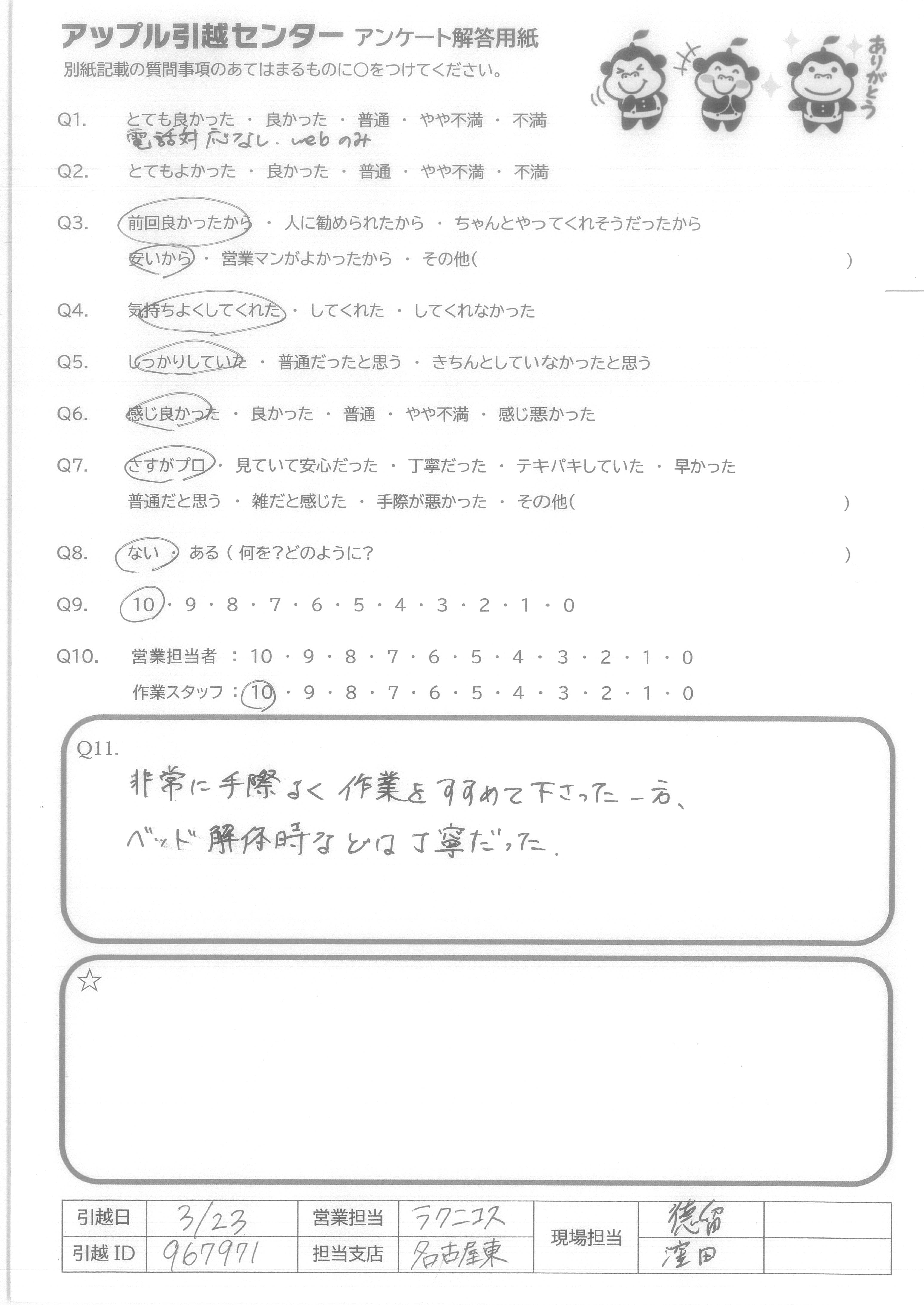 A.非常に手際よく作業をすすめて下さった一方、ベッド解体時などは丁寧だった。