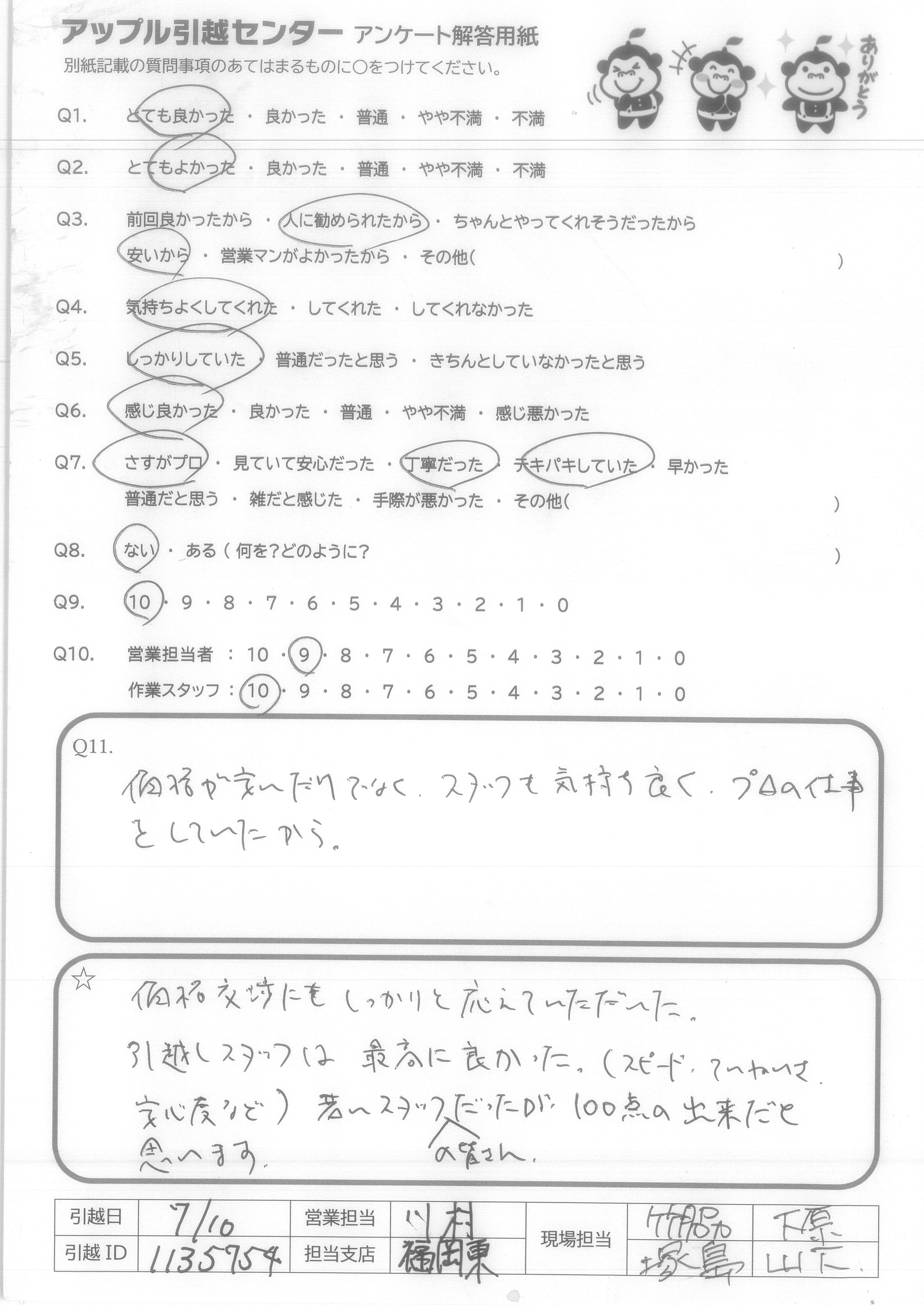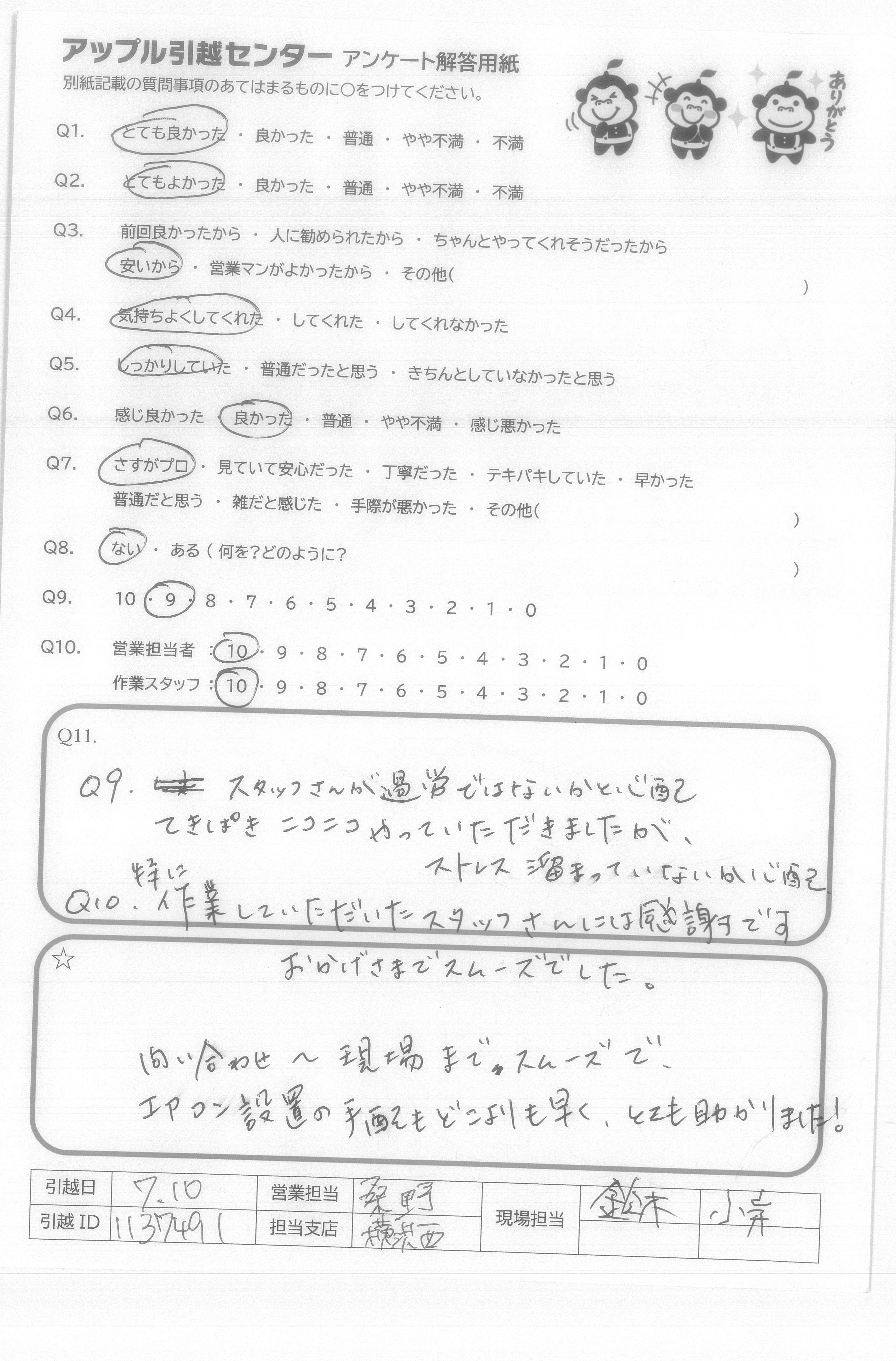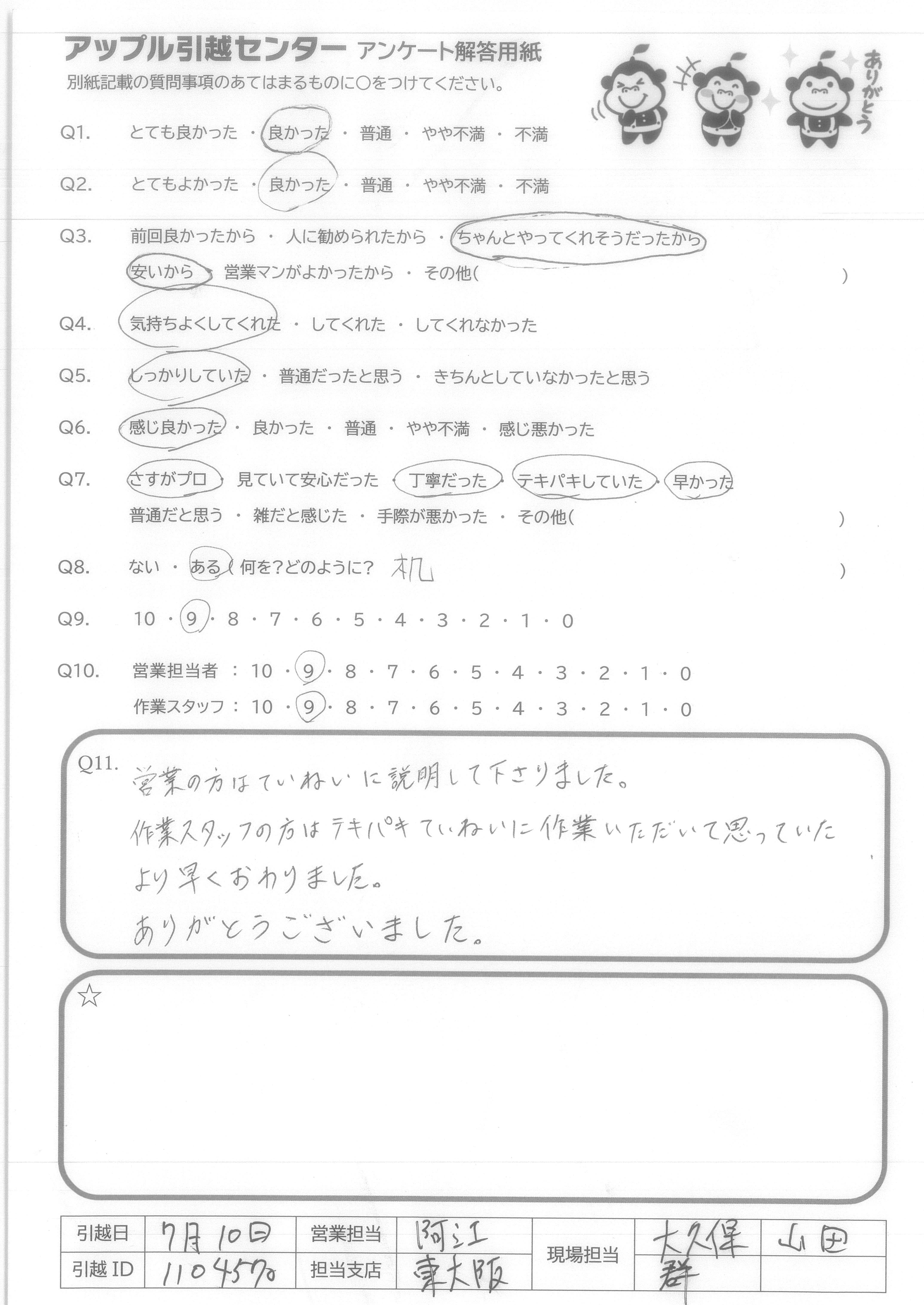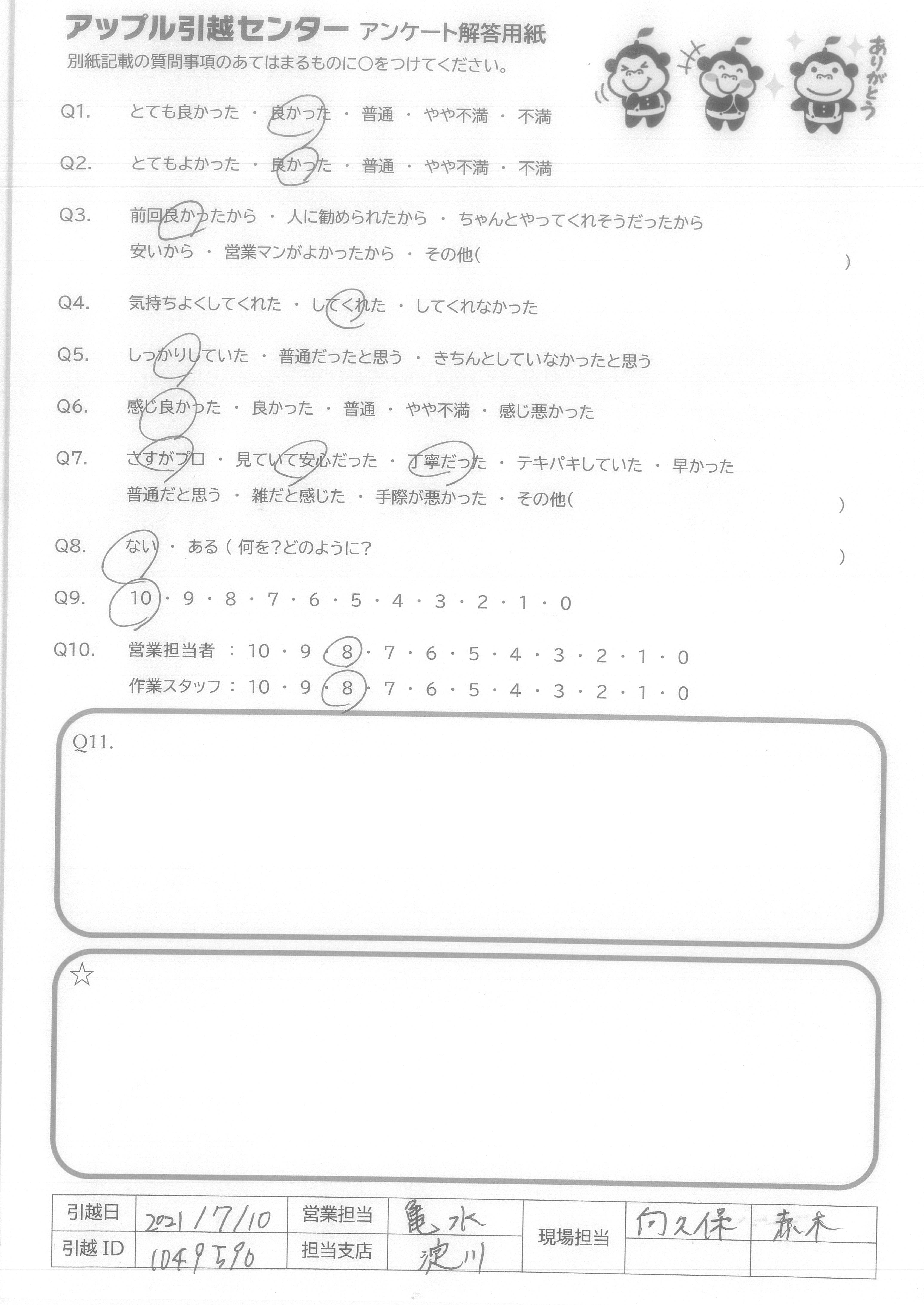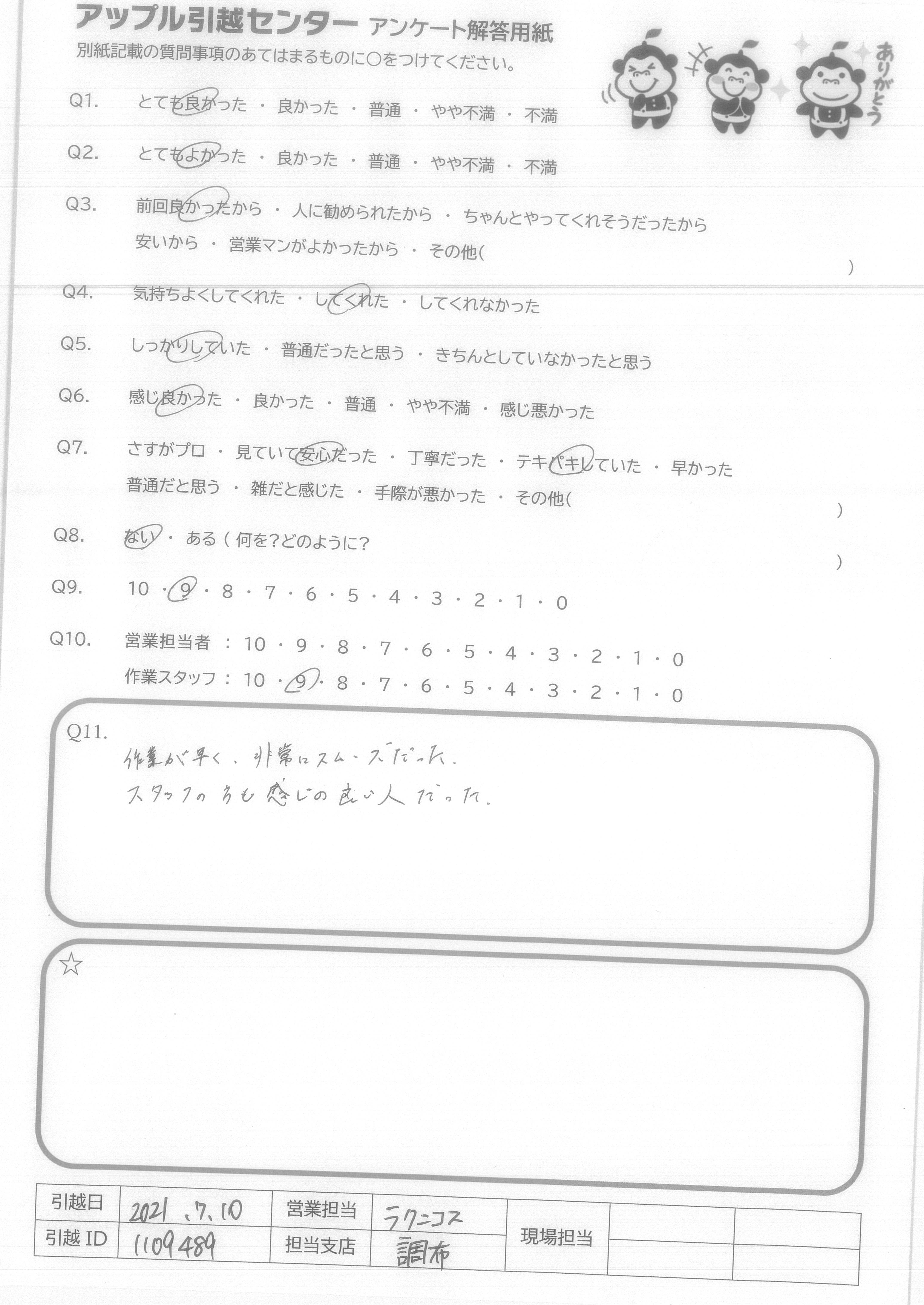 A.Q9 スタッフさんが過労ではないかと心配 てきぱきニコニコやっていただきましたが、ストレス溜まっていないか心配 Q10特に作業していただいたスタッフさんには感謝です。 おかげさまでスムーズでした。