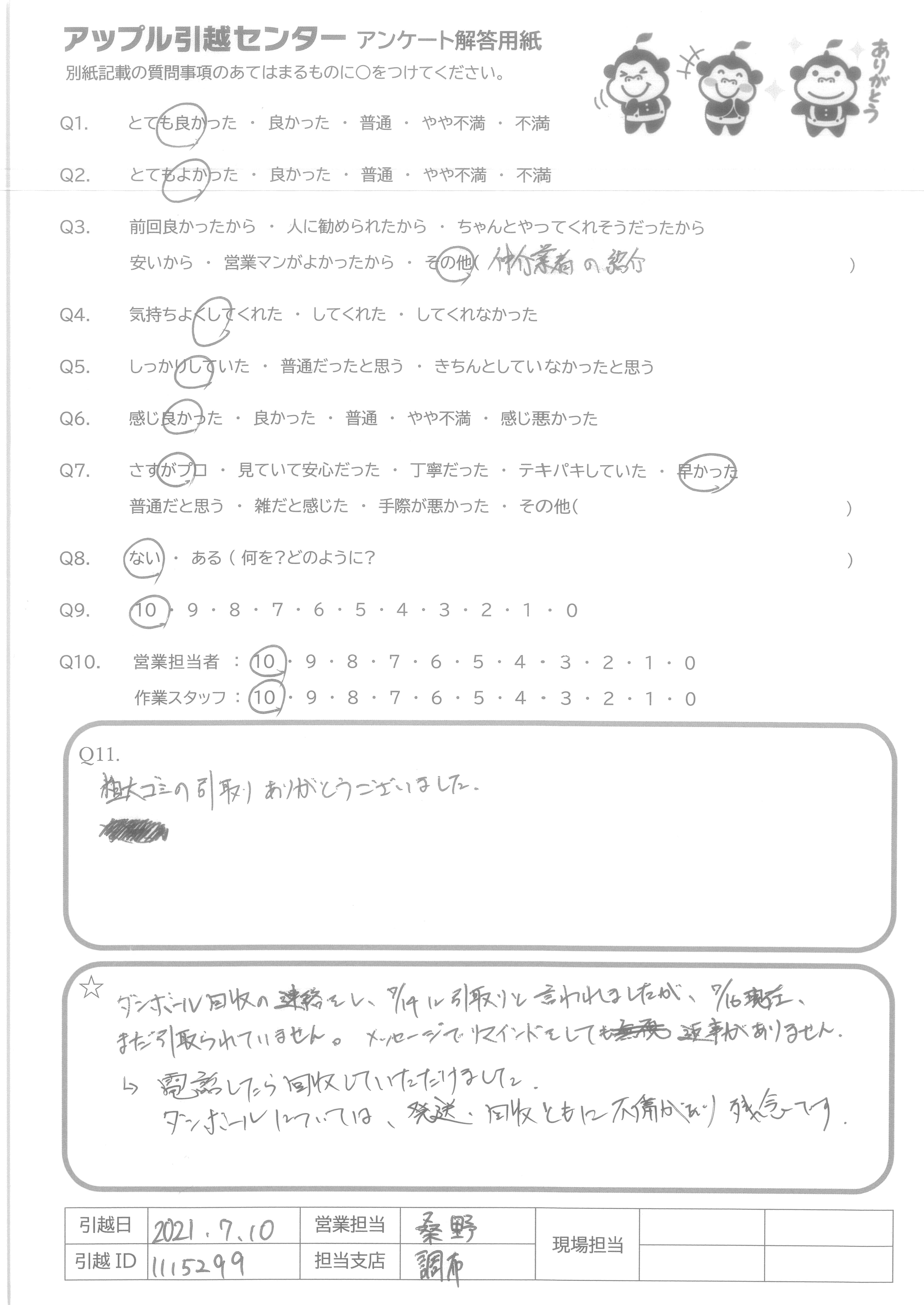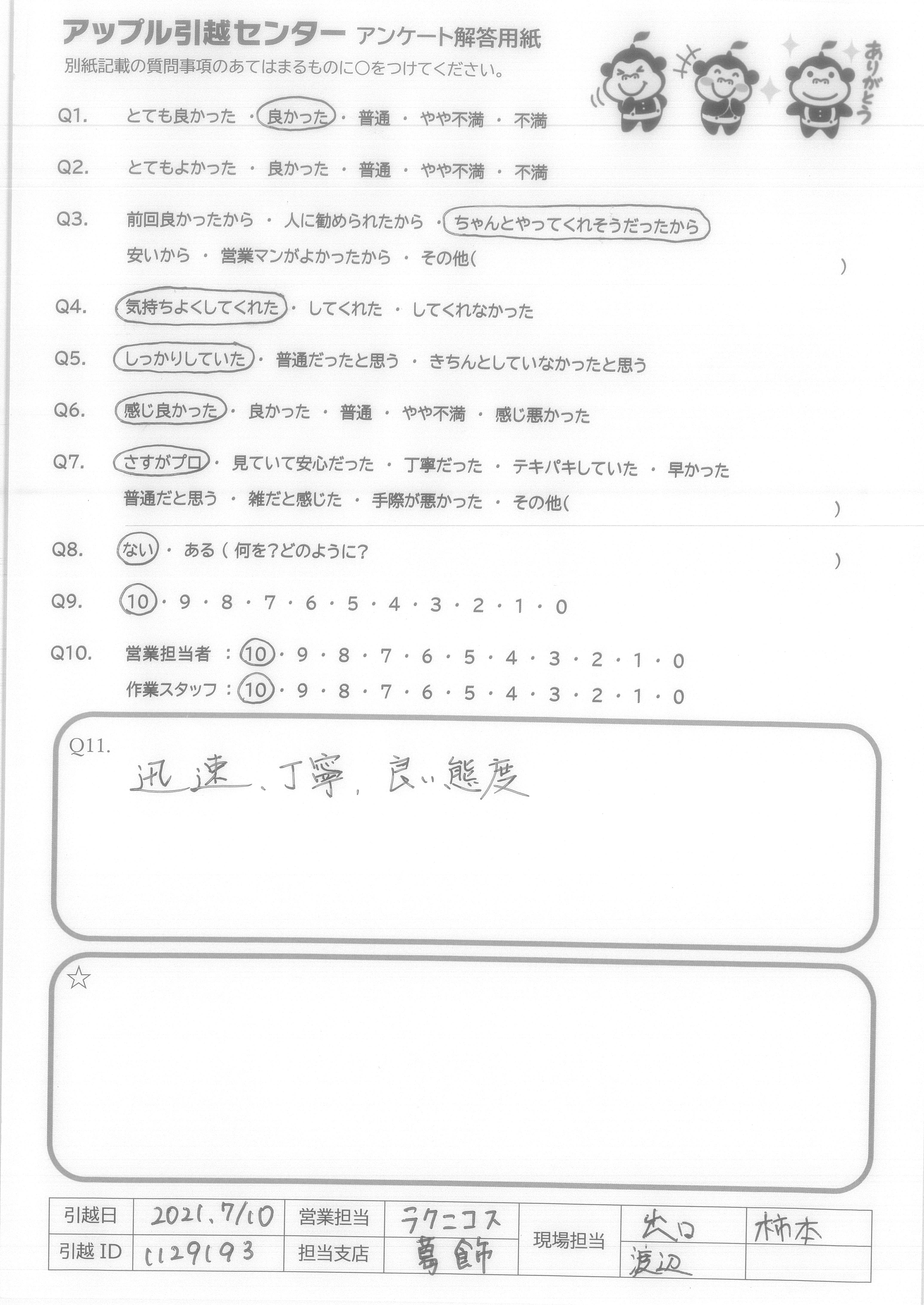 A.(作業スタッフ)Q10について、当日の作業スタッフの方は暑い中丁寧にてきぱき対応して頂き、感謝しています。 (ラクニコス担当)事前にダンボール等資材が2重で配送され、その返品があり、そこが少し残念で、ネット(ラクニコス?)のやり取りも少しだけ、スムーズではなかったことも。
