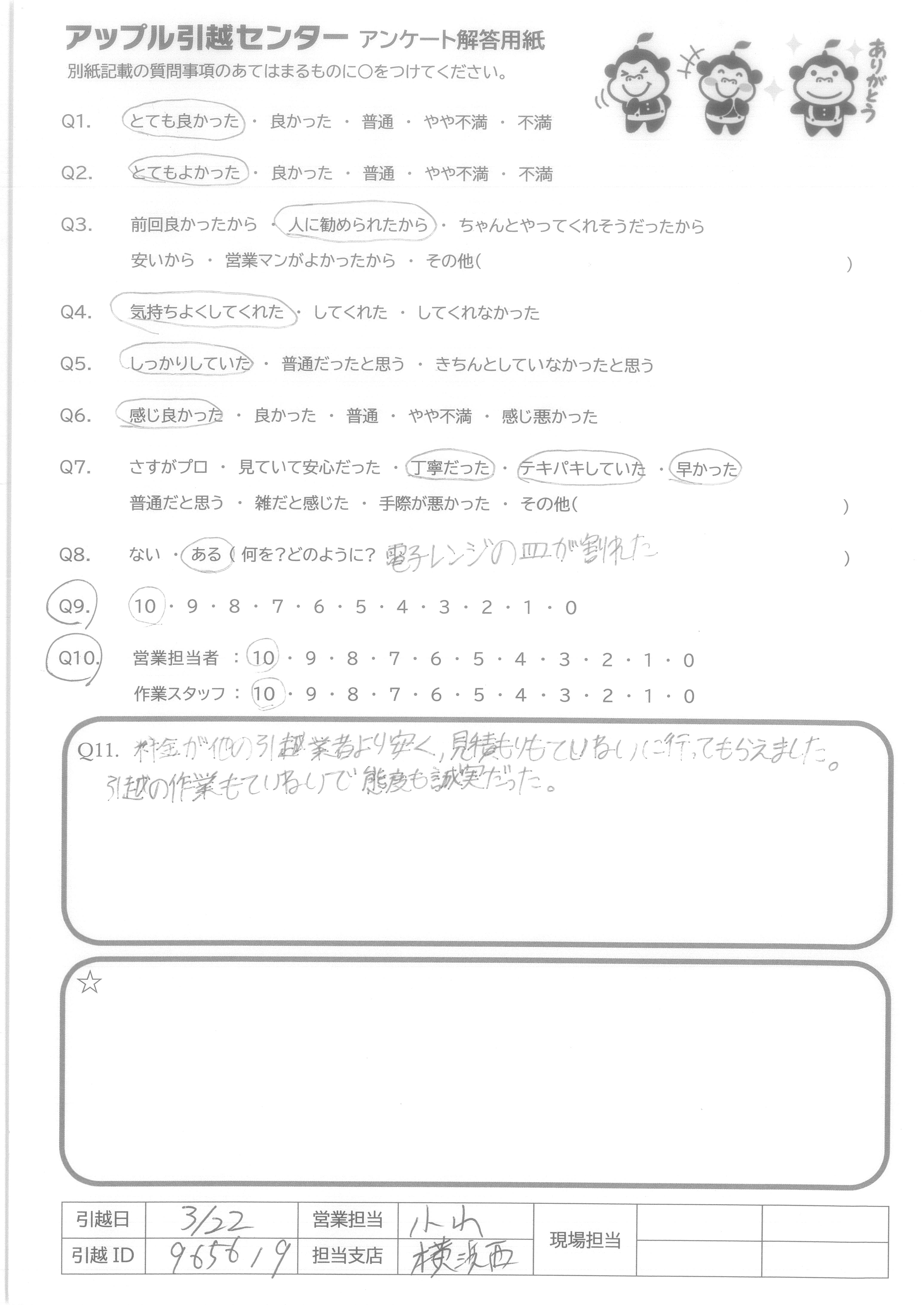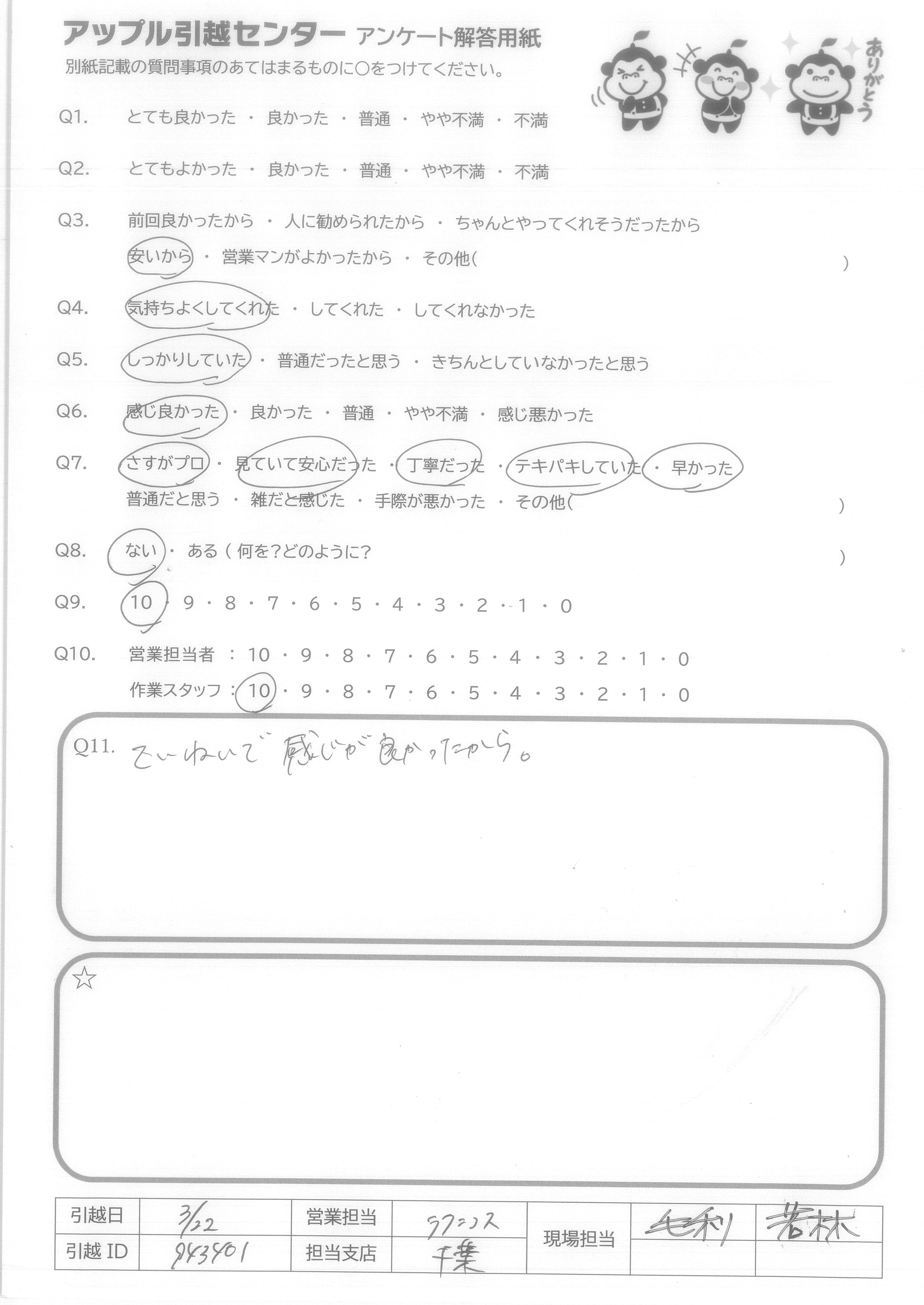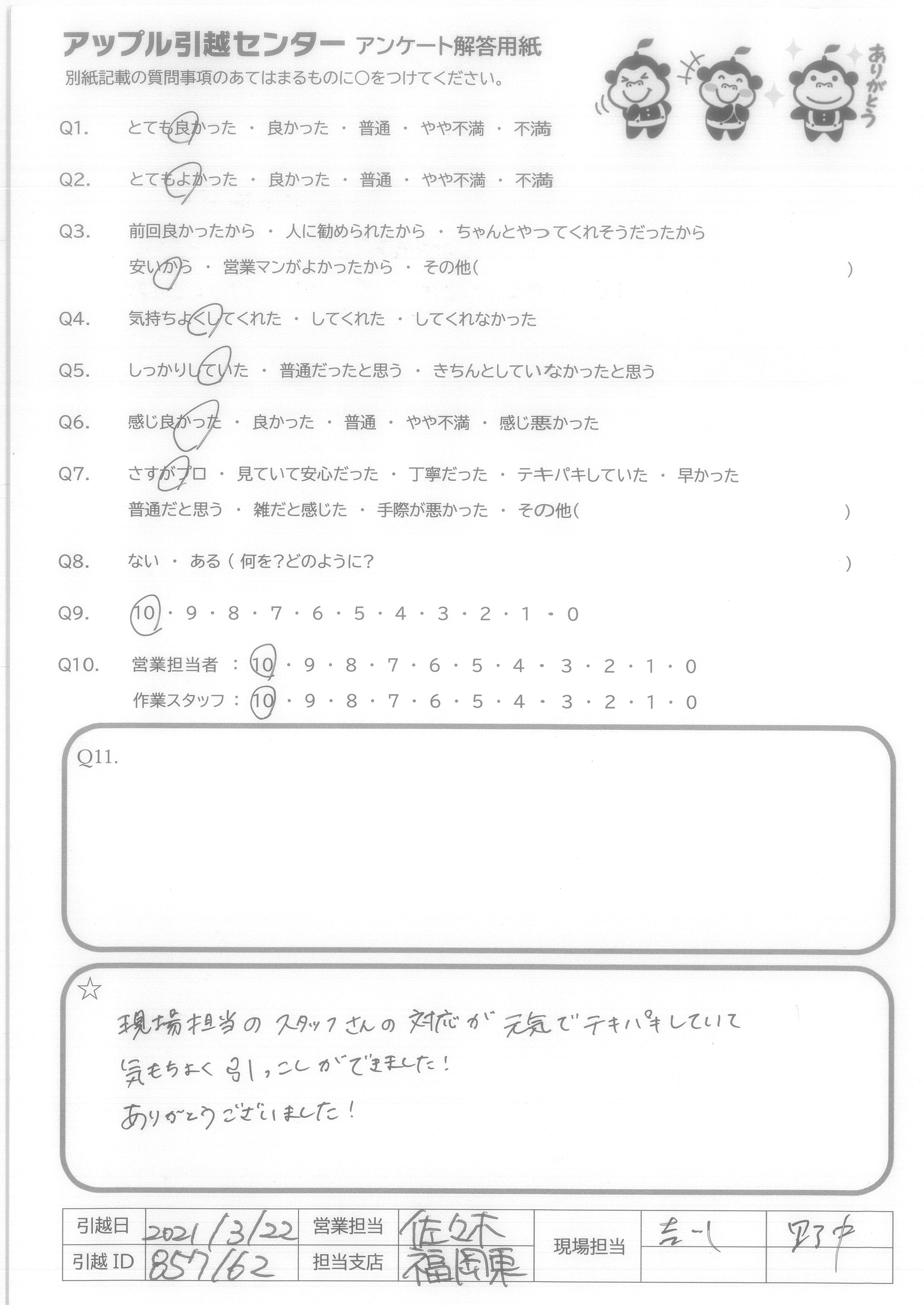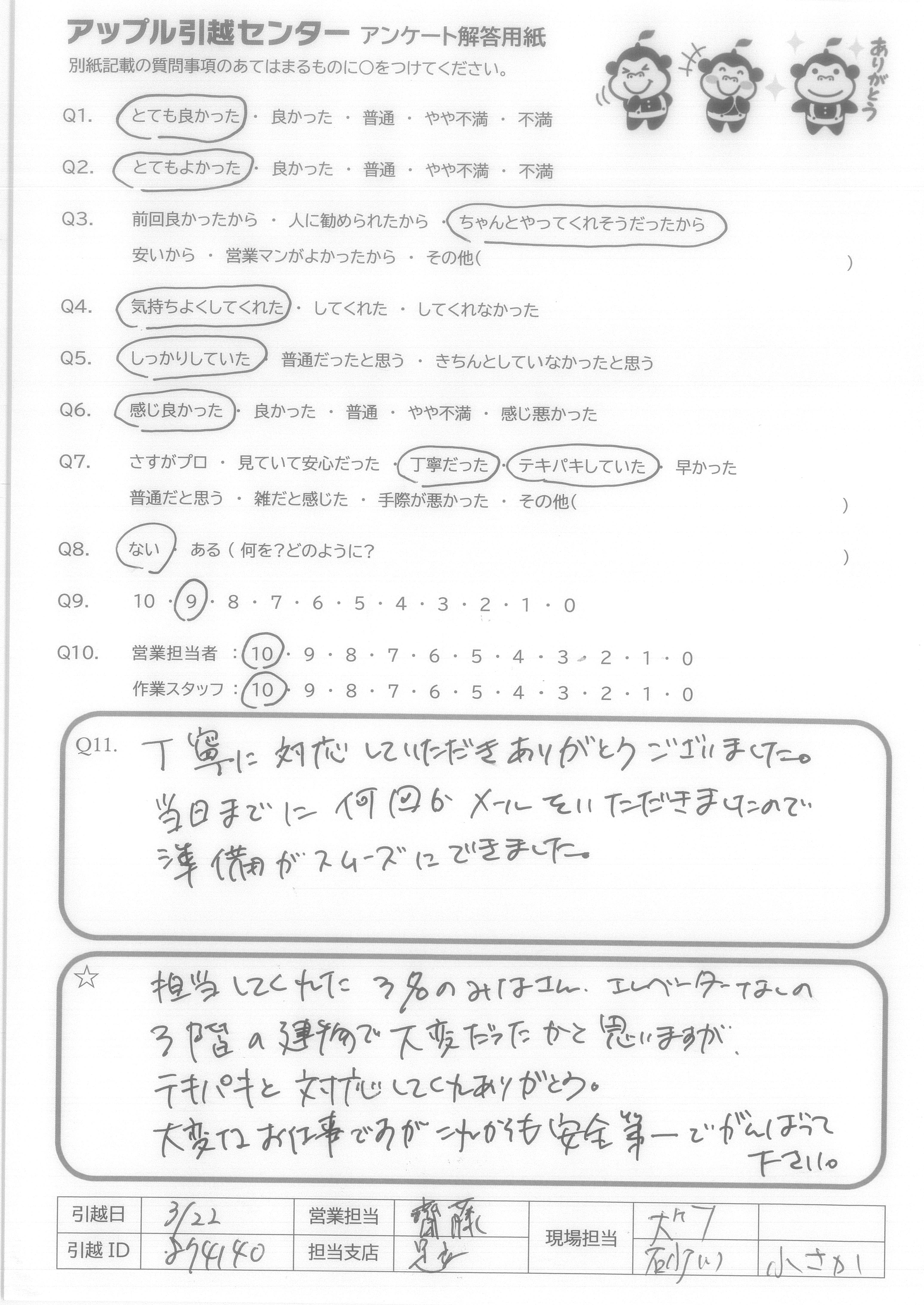 A.担当してくれた3名のみなさん、エレベーターなしの3階の建物で大変だったかと思いますが、 テキパキと対応してくれありがとう。 大変なお仕事ですが、これからも安全第一でがんばって下さい。