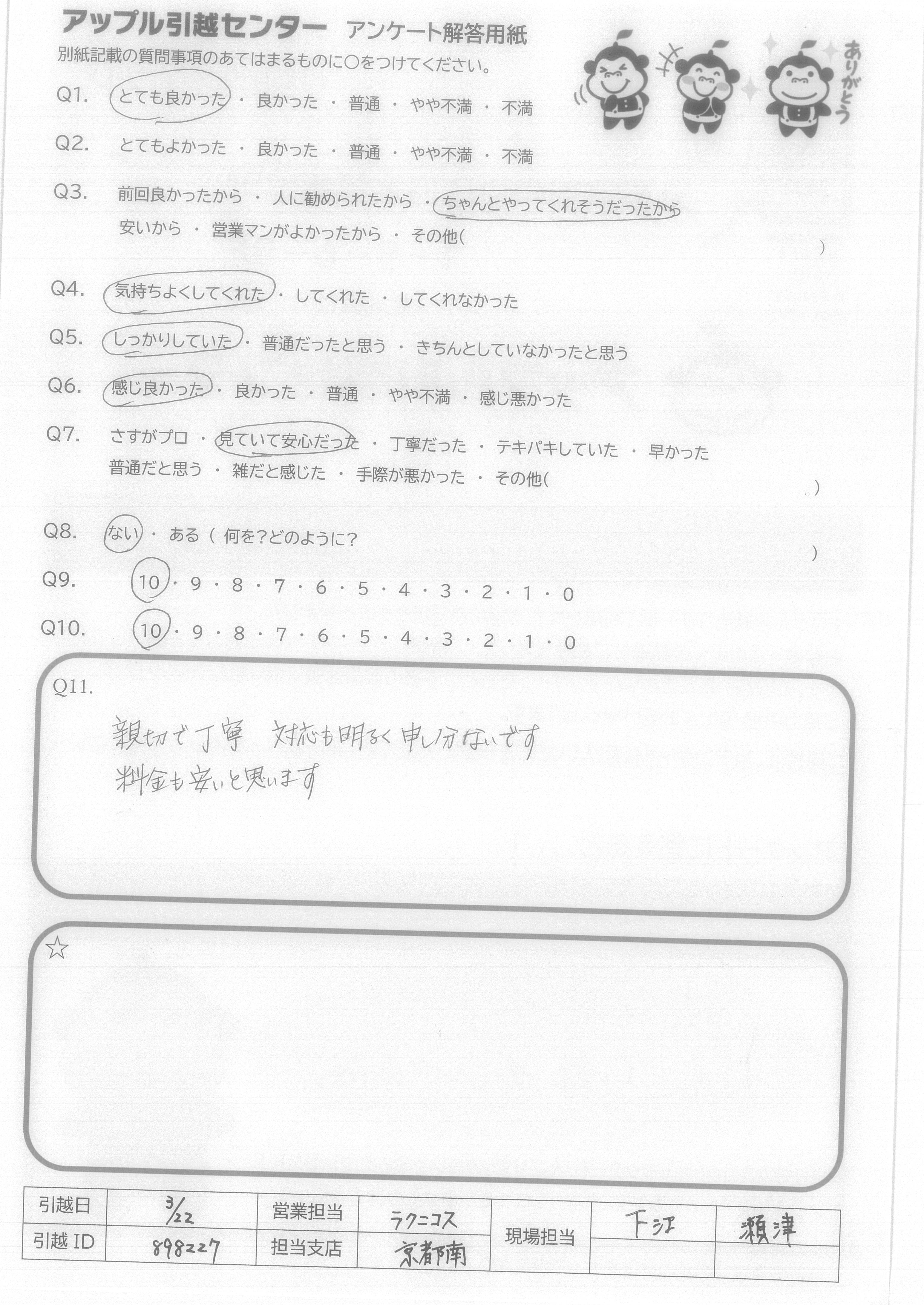 A.料金が他の引越業者より安く、見積もりもていねいに行ってもらえました。引越の作業もていねいで態度も誠実だった。