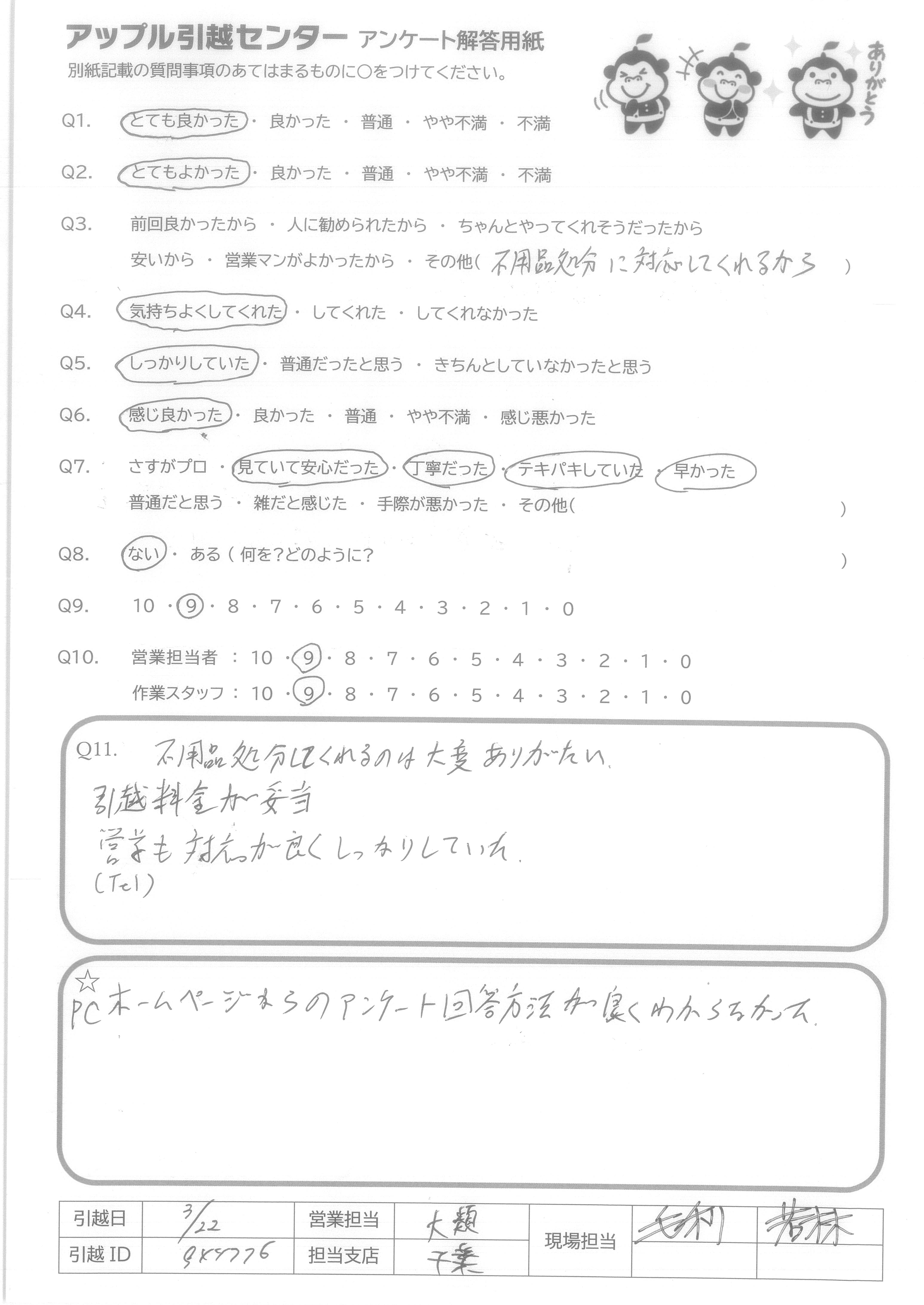 A.不用品処分してくれるのは大変ありがたい 引越料金が妥当 営業も対応が良くしっかりしていた(Tel)