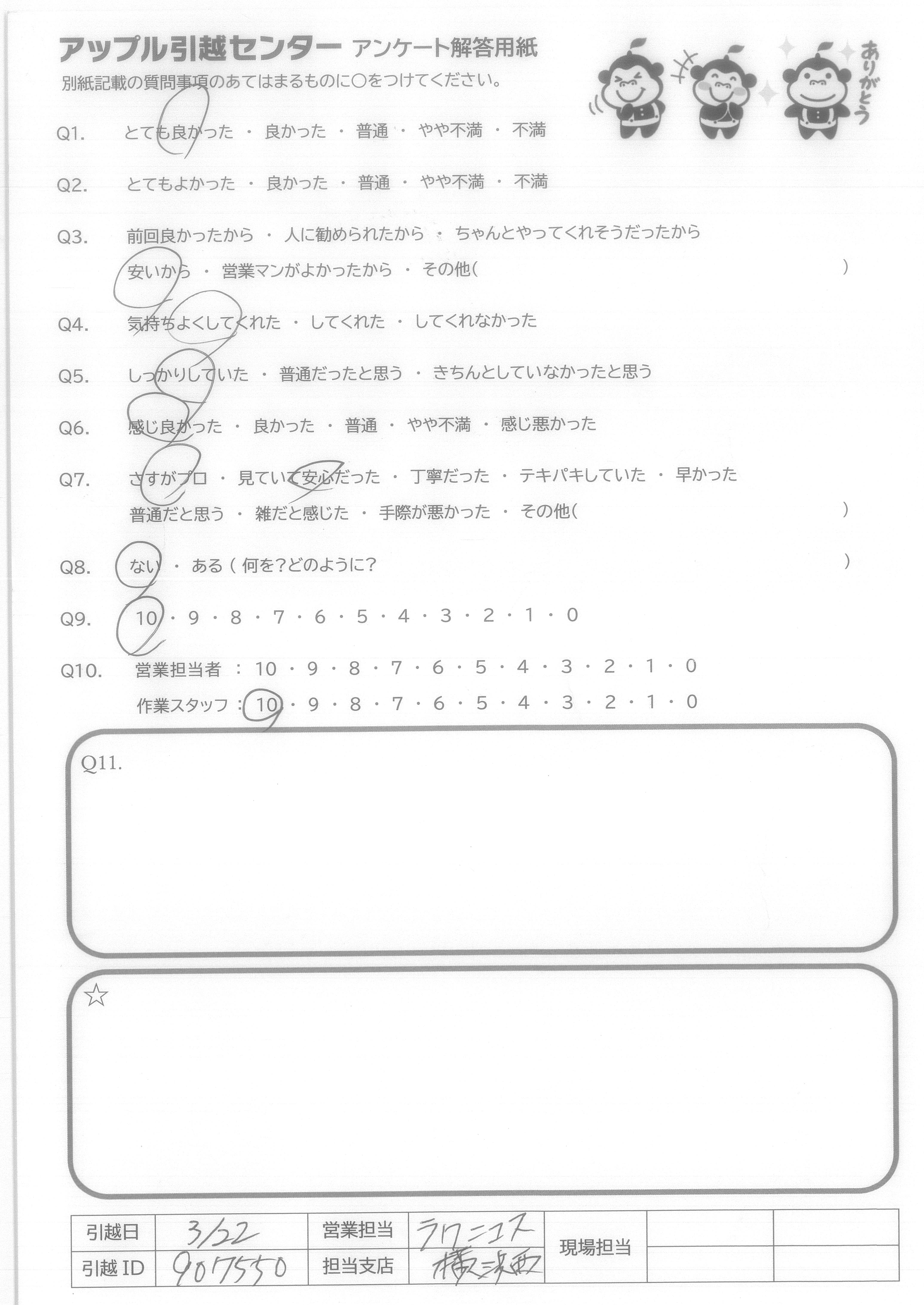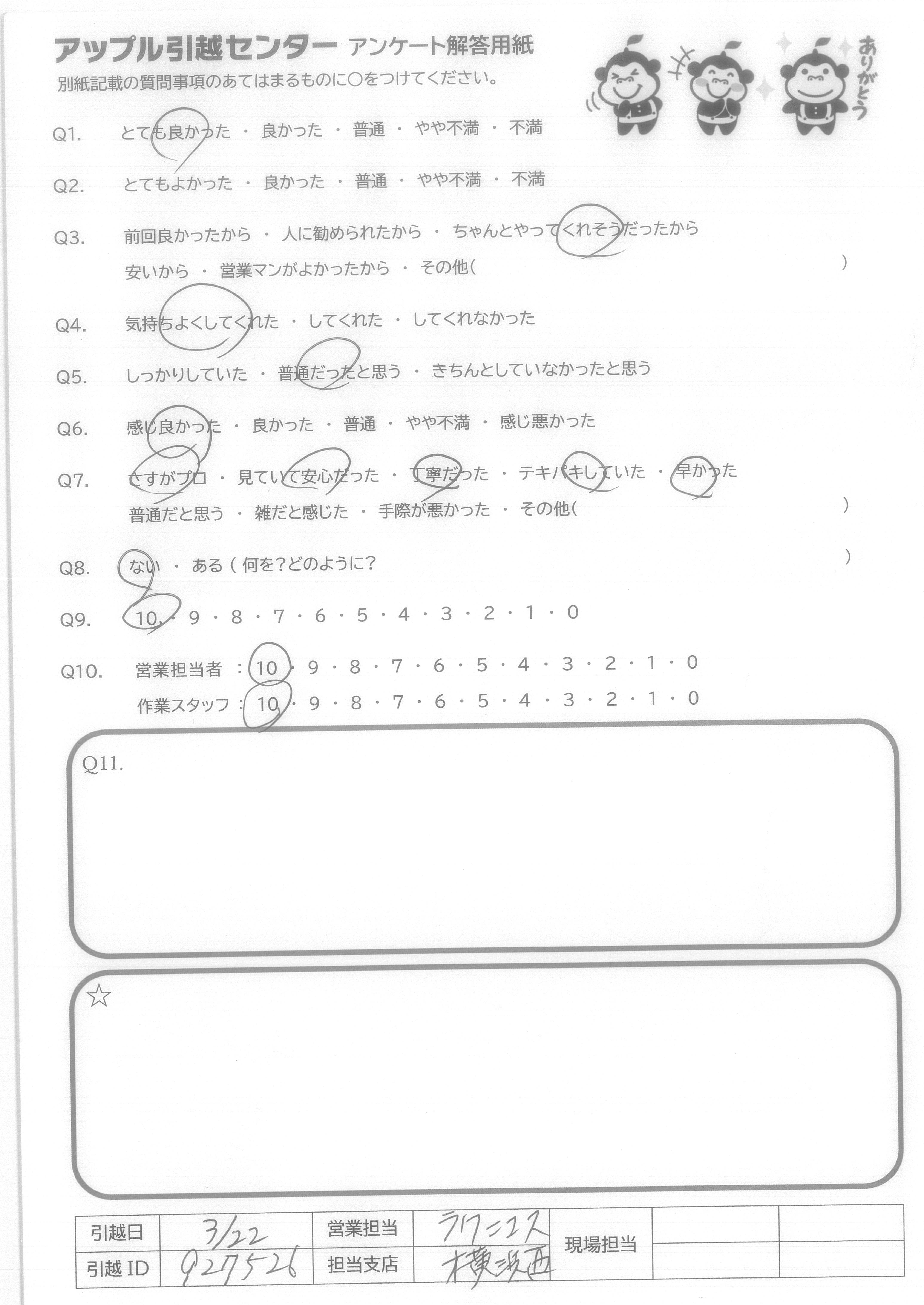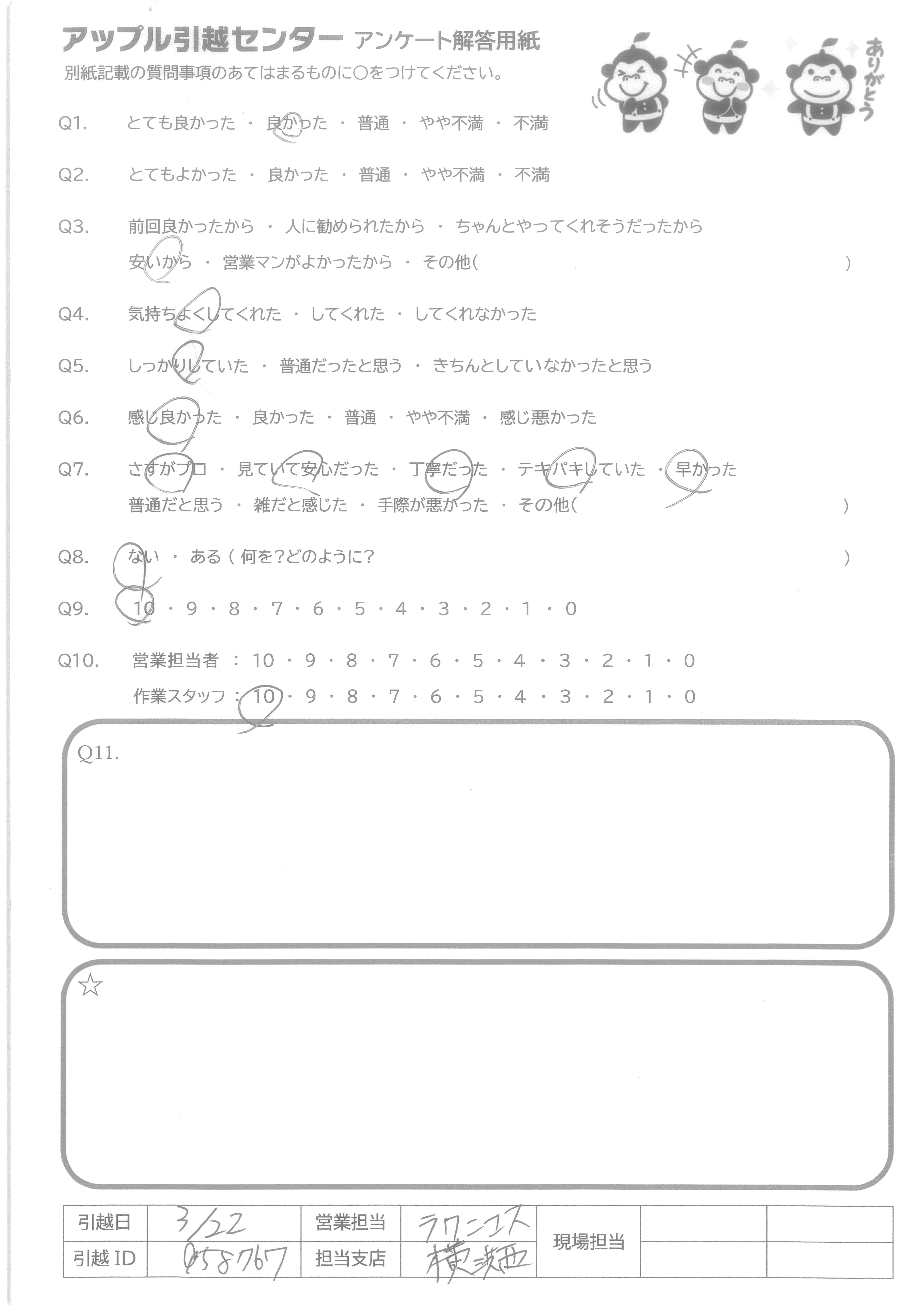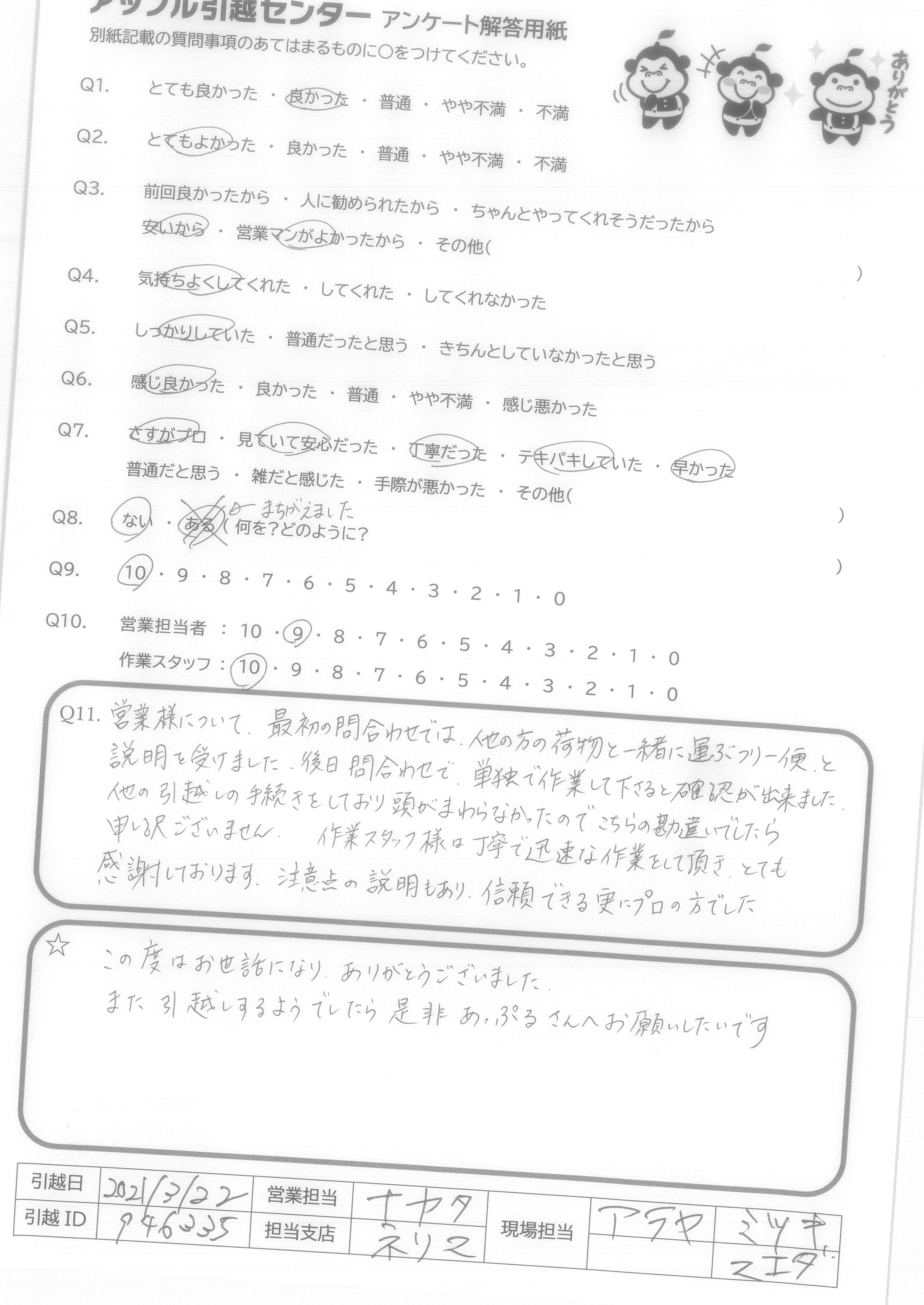 A.Q9に対して、絶対にすすめるではにですが、次回自分が引越しの際に又使用させて頂こうと思いました。 Q10に対して、作業スタッフさんはとても感じの良い方でしたので安心して引越しをお願いすることができました。営業担当者様に関してはほとんどかかわりを持っていないので良くわからないので「7」と回答させて頂きました。