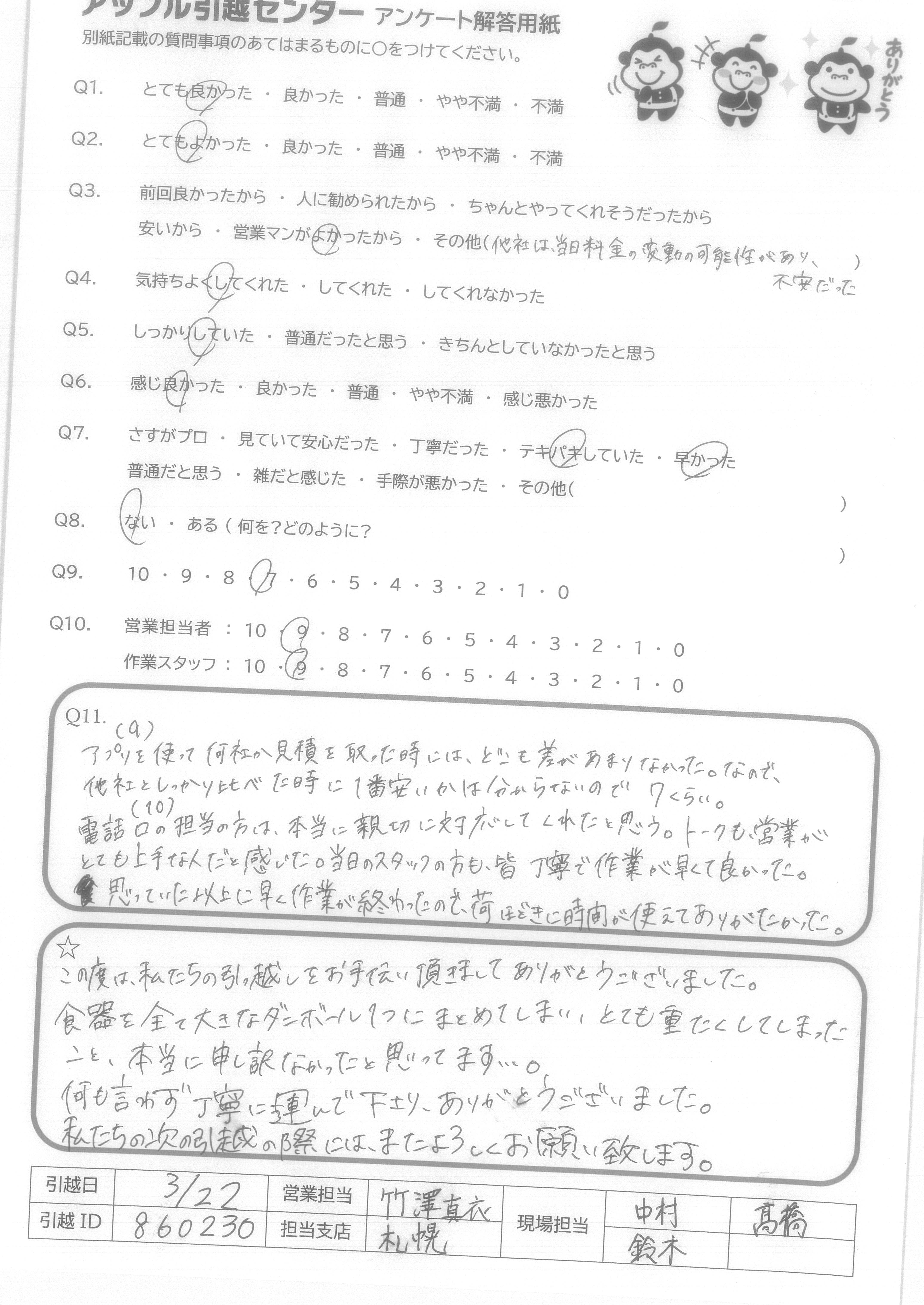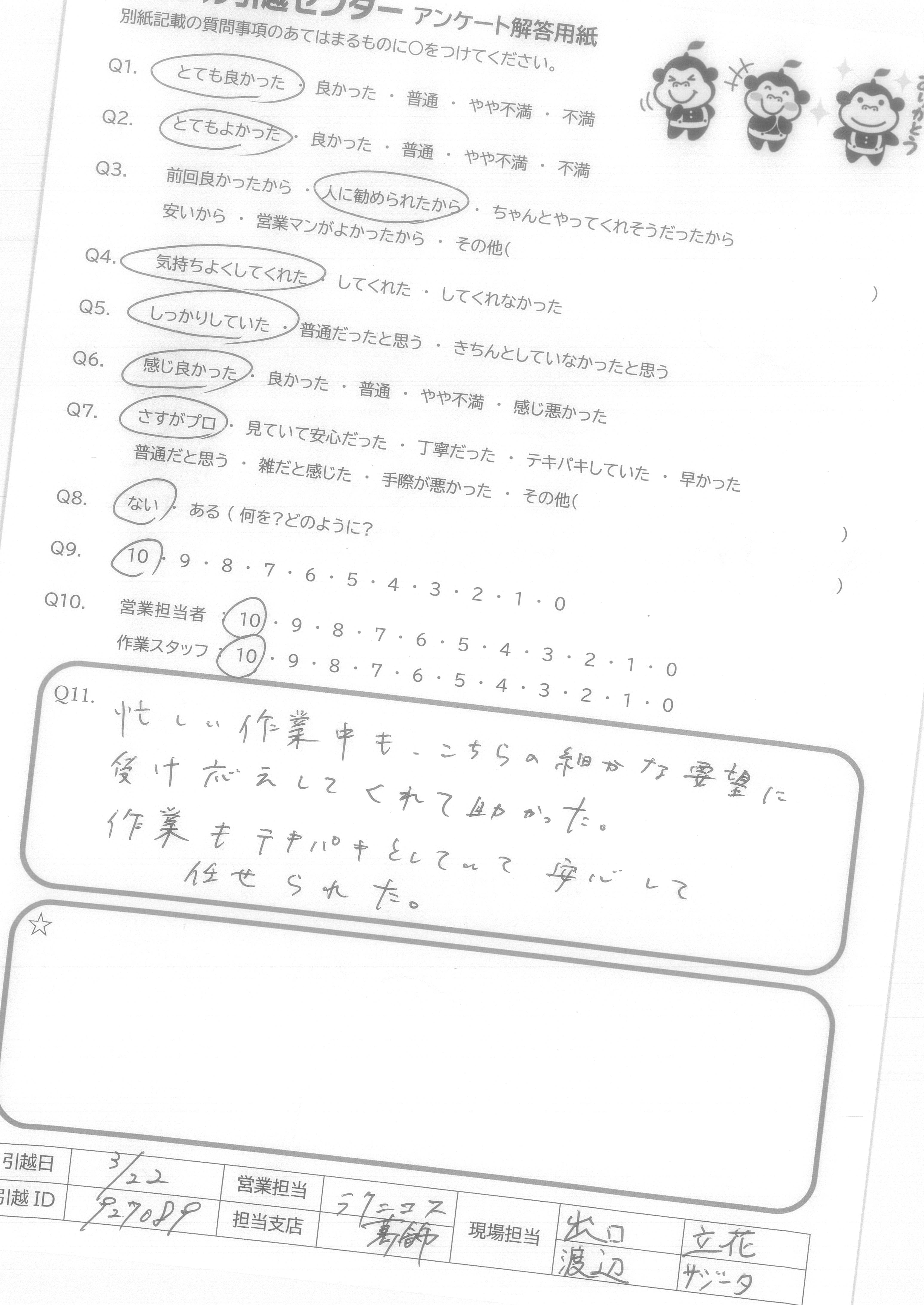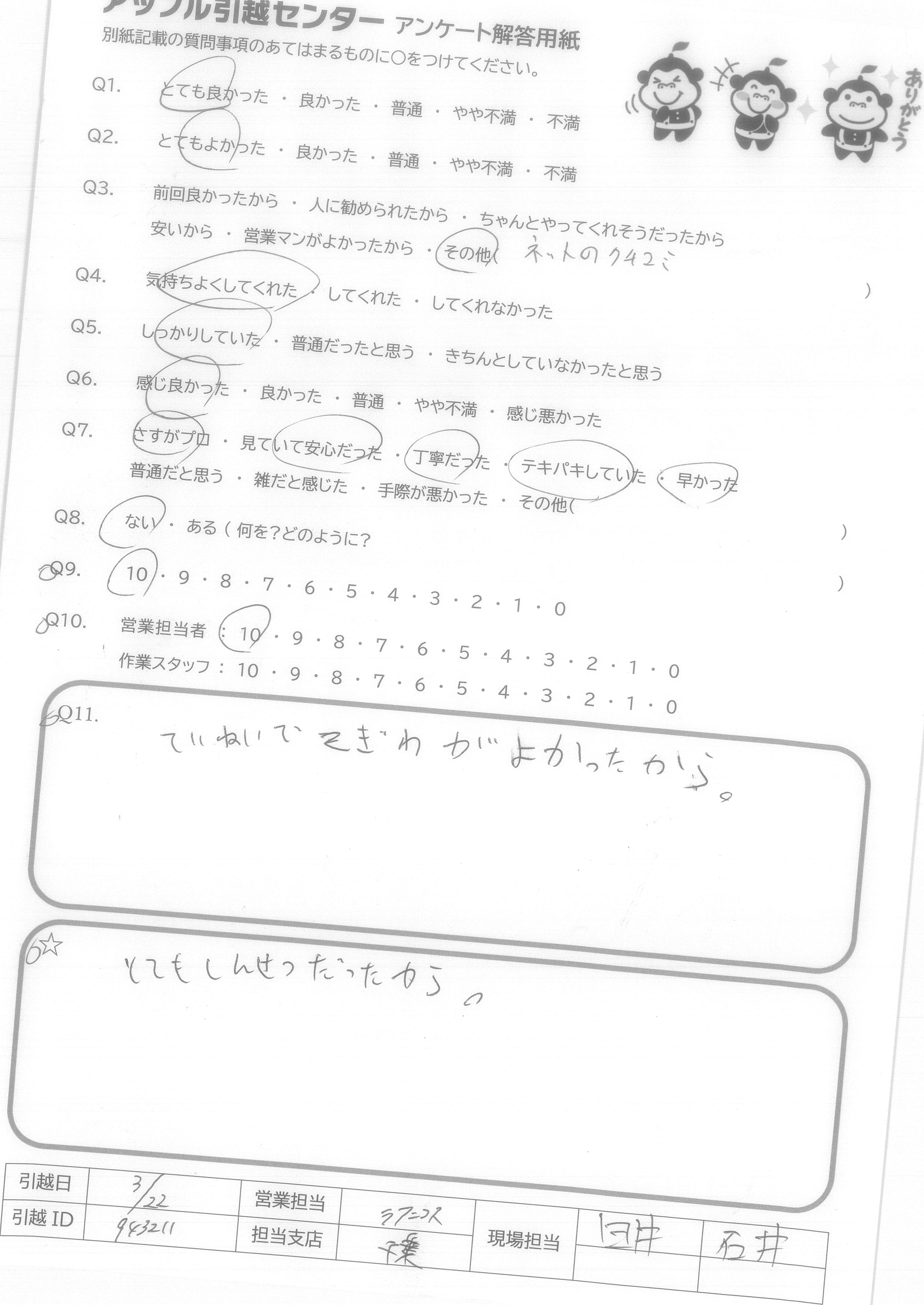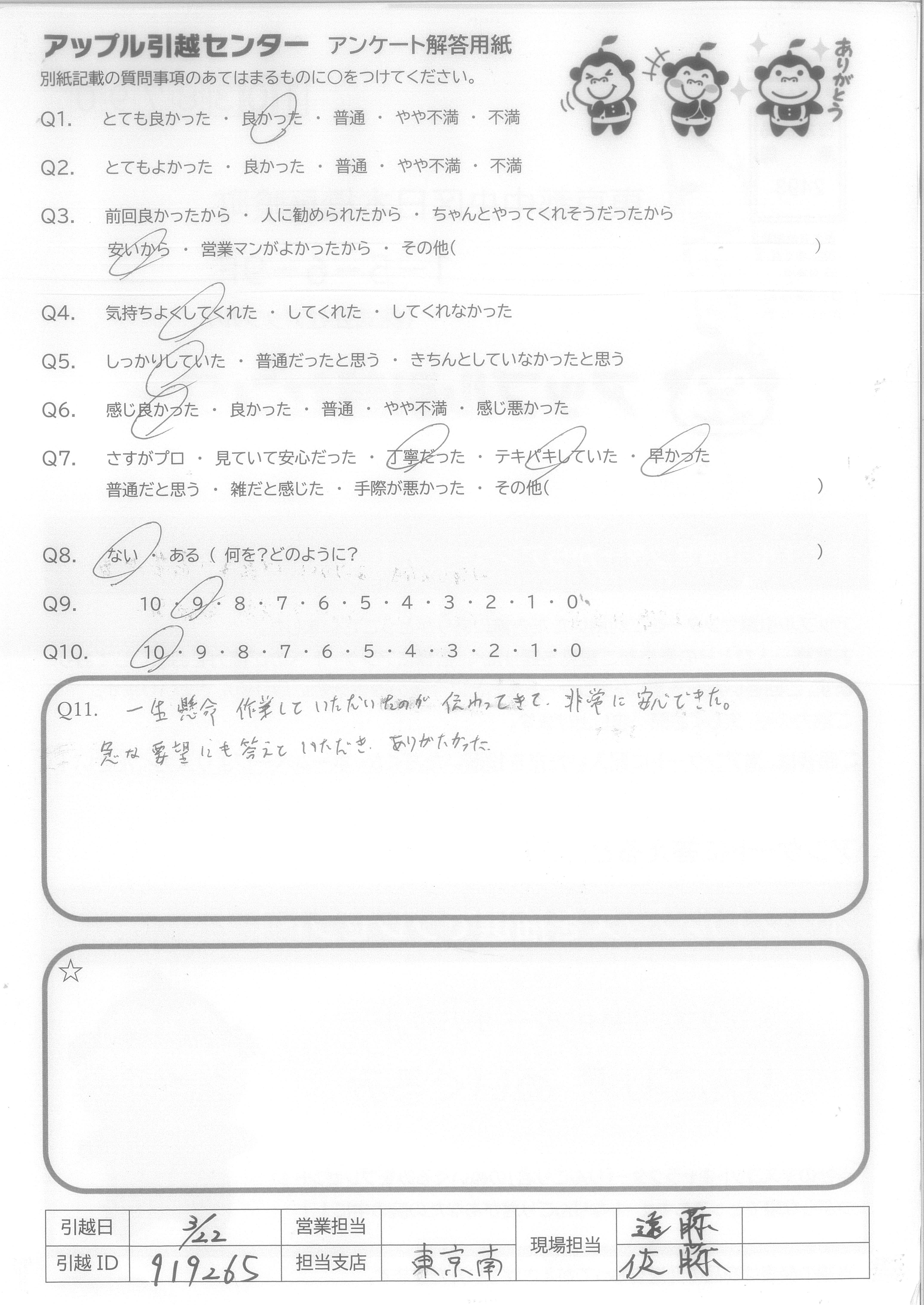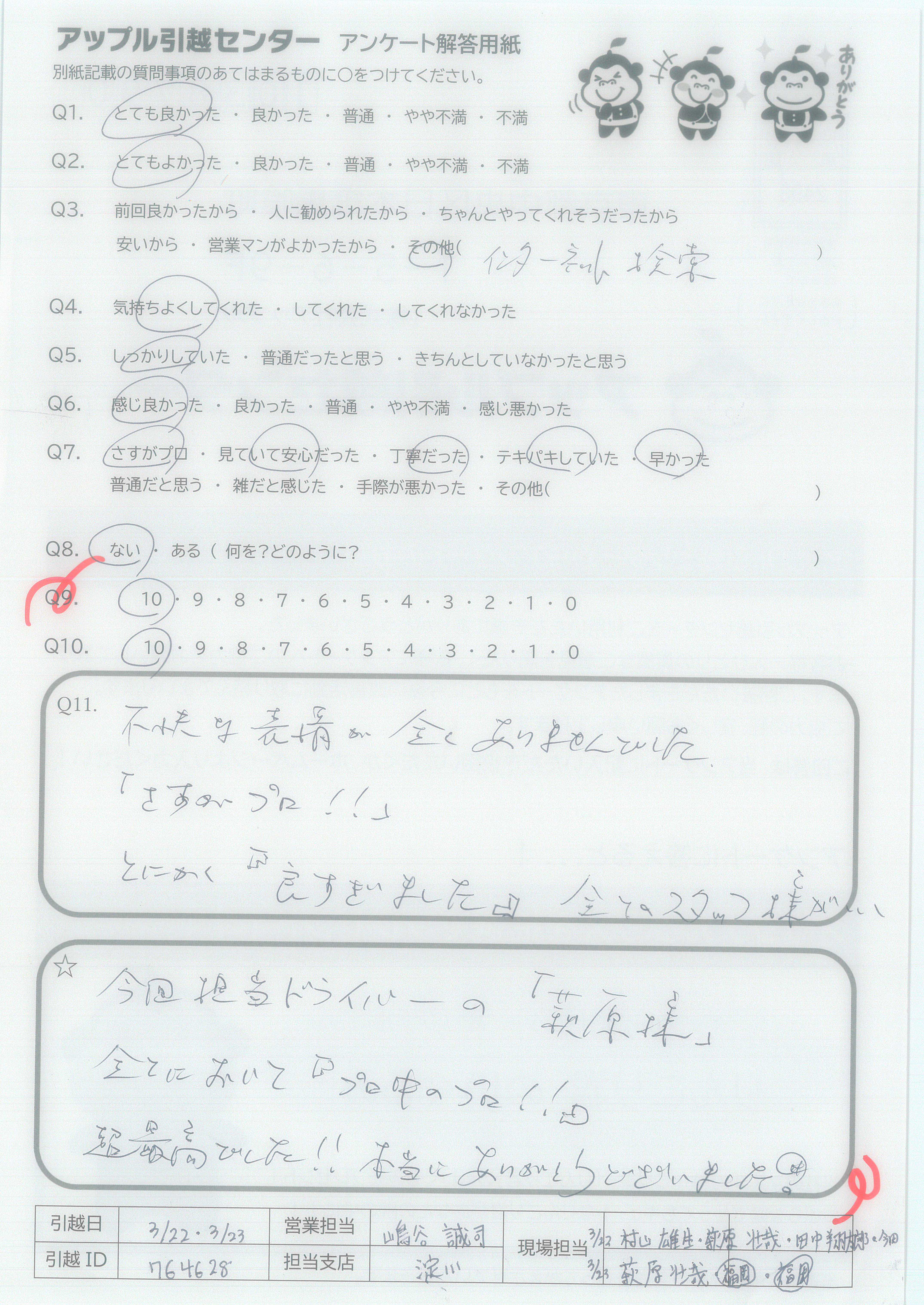 A.Q9に対して、絶対にすすめるではにですが、次回自分が引越しの際に又使用させて頂こうと思いました。 Q10に対して、作業スタッフさんはとても感じの良い方でしたので安心して引越しをお願いすることができました。営業担当者様に関してはほとんどかかわりを持っていないので良くわからないので「7」と回答させて頂きました。