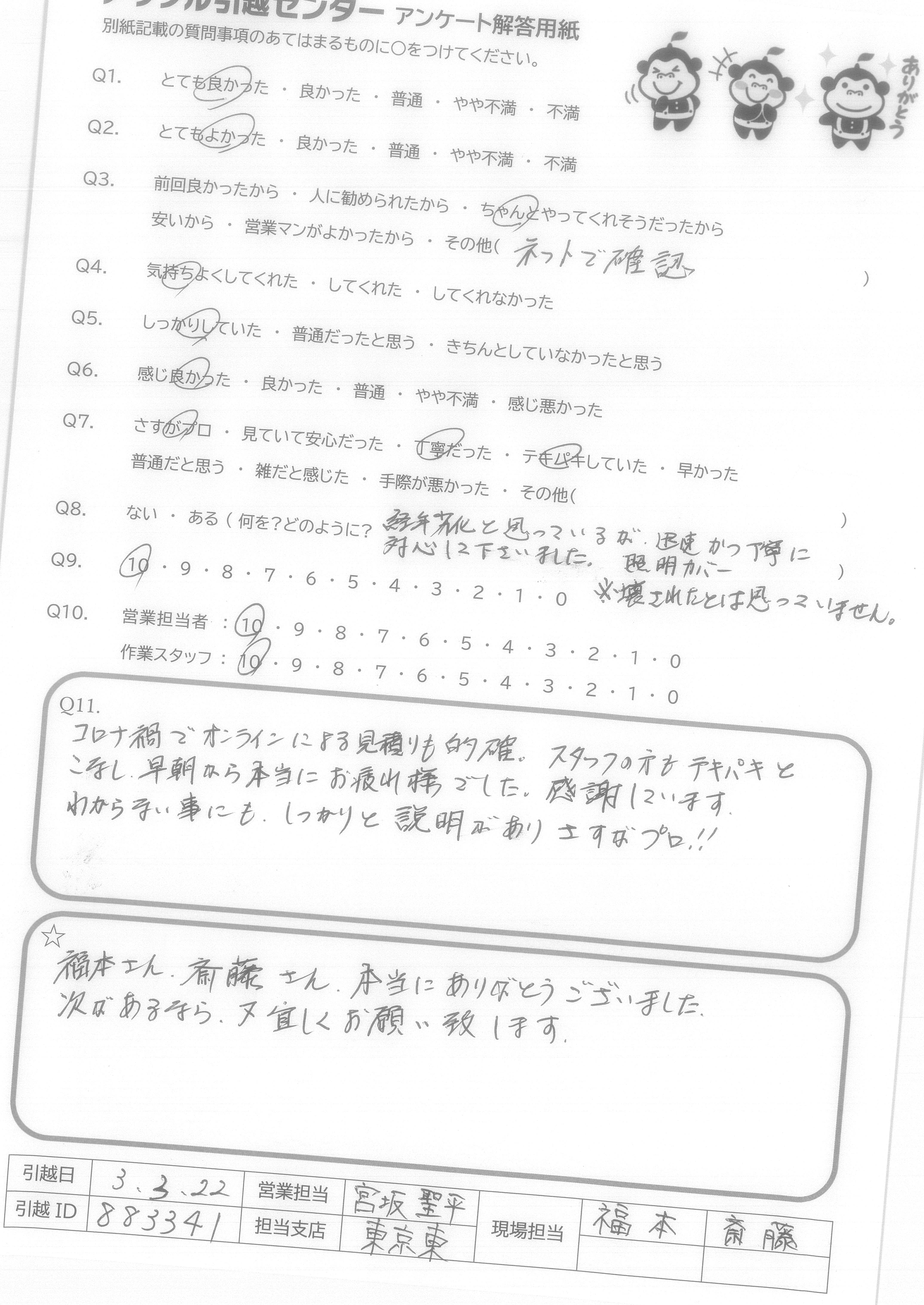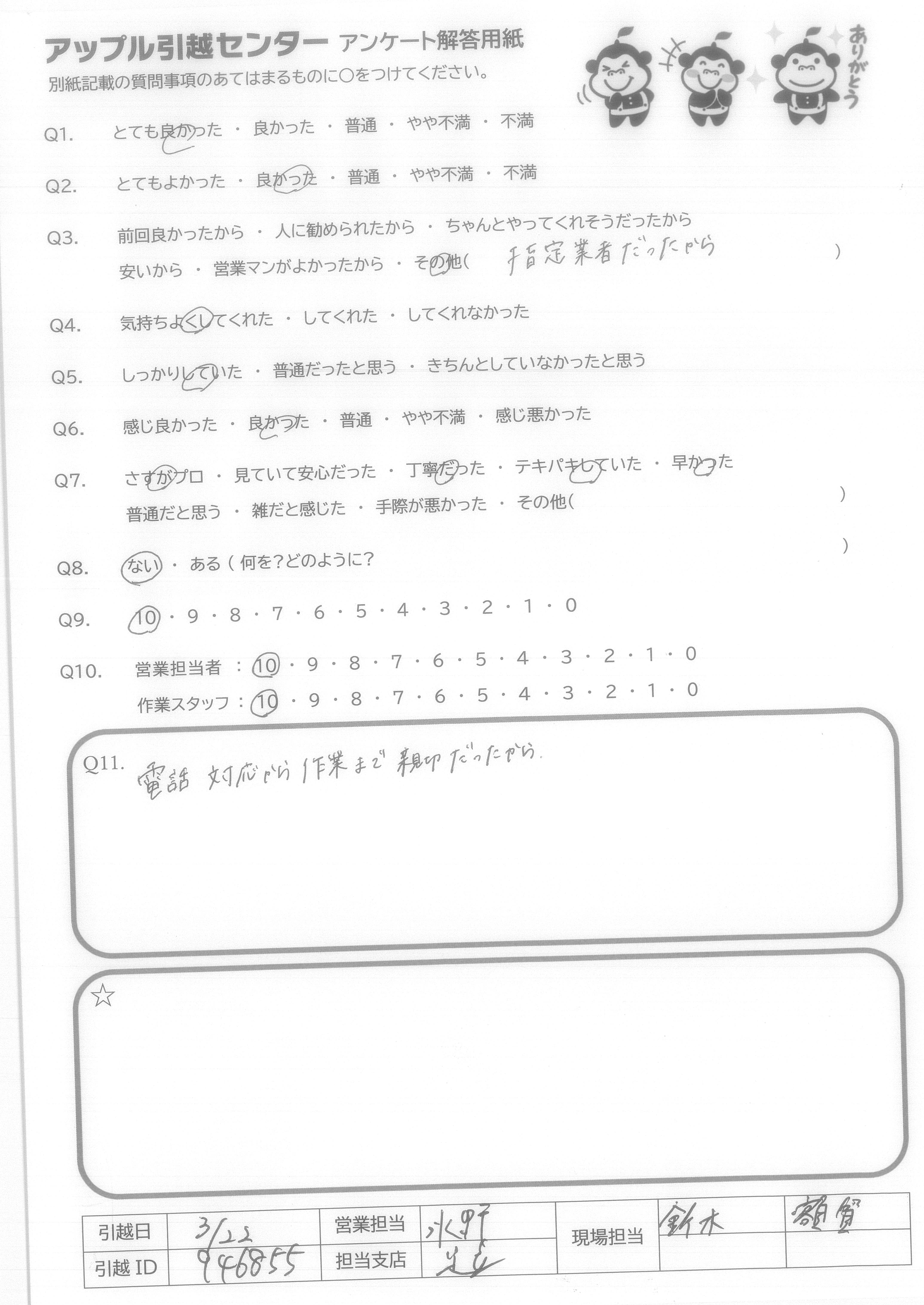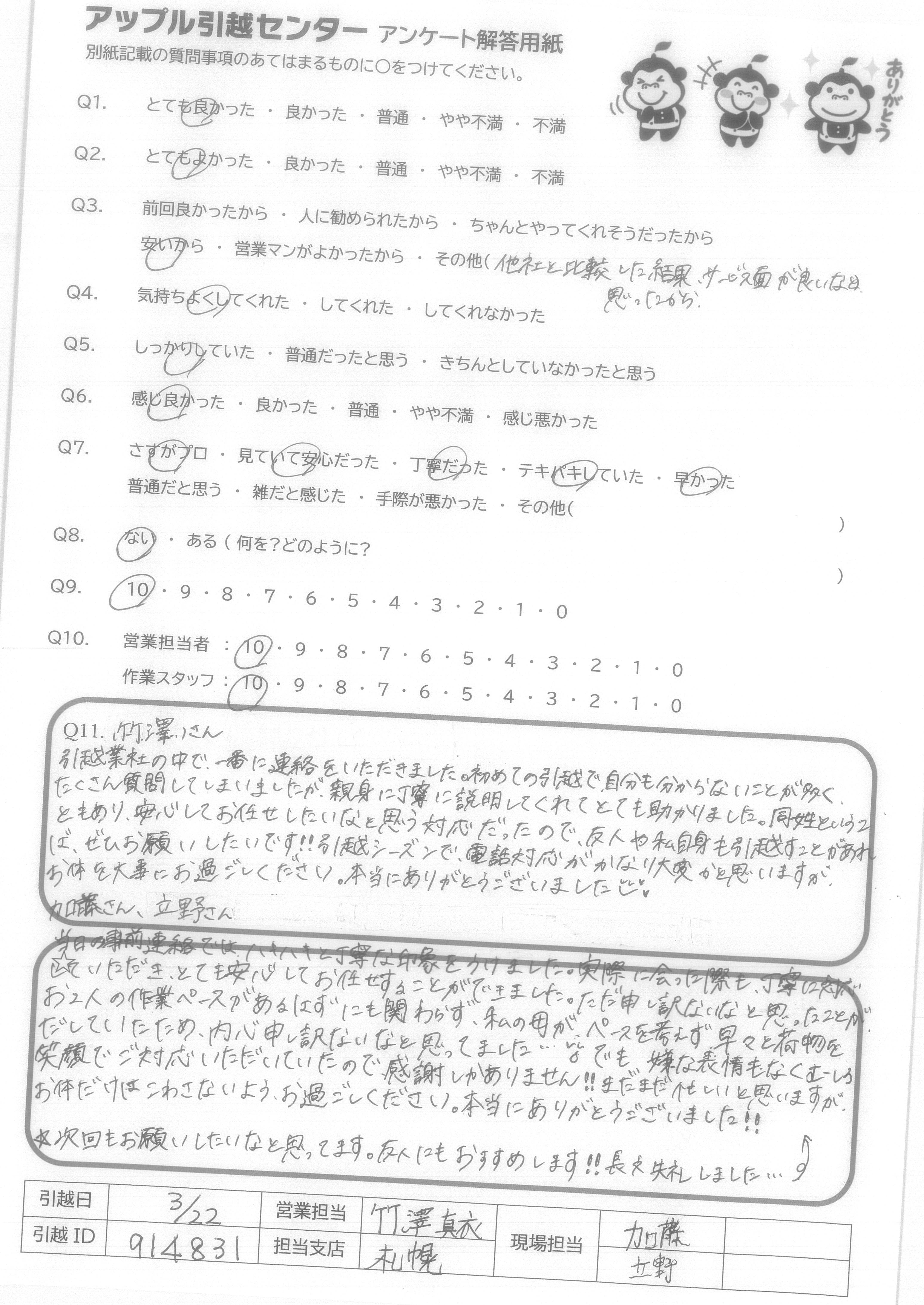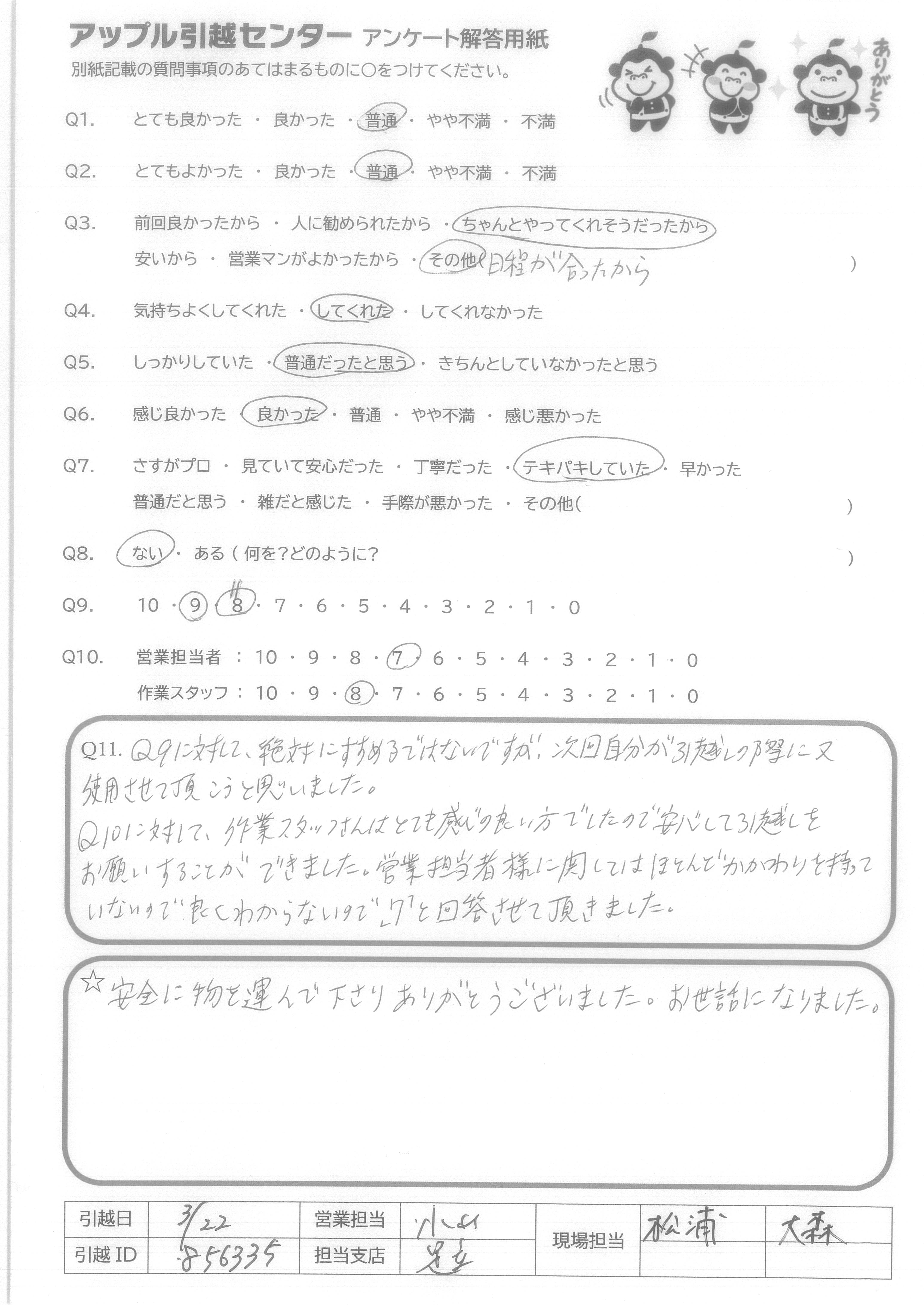 A.Q9に対して、絶対にすすめるではにですが、次回自分が引越しの際に又使用させて頂こうと思いました。 Q10に対して、作業スタッフさんはとても感じの良い方でしたので安心して引越しをお願いすることができました。営業担当者様に関してはほとんどかかわりを持っていないので良くわからないので「7」と回答させて頂きました。