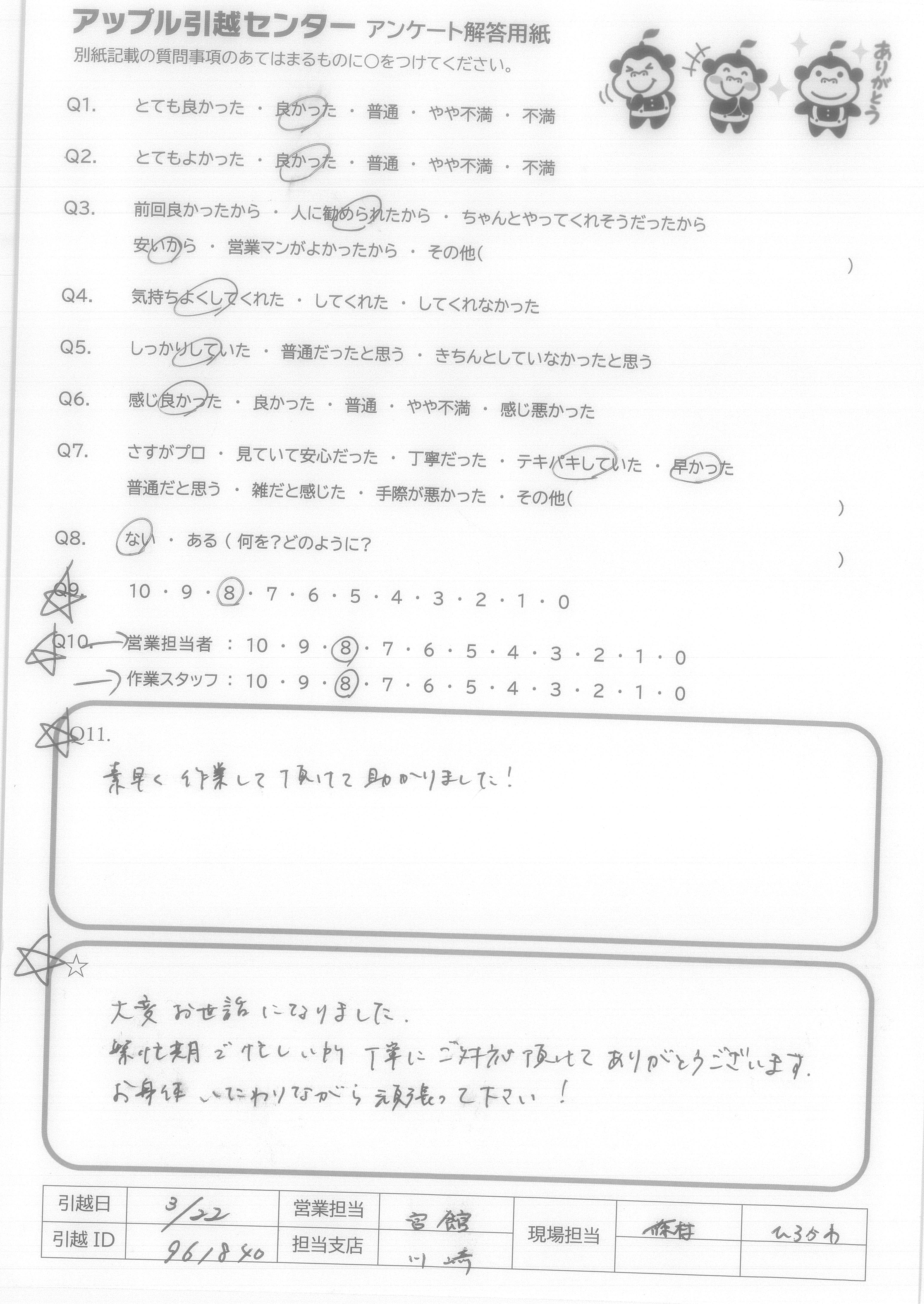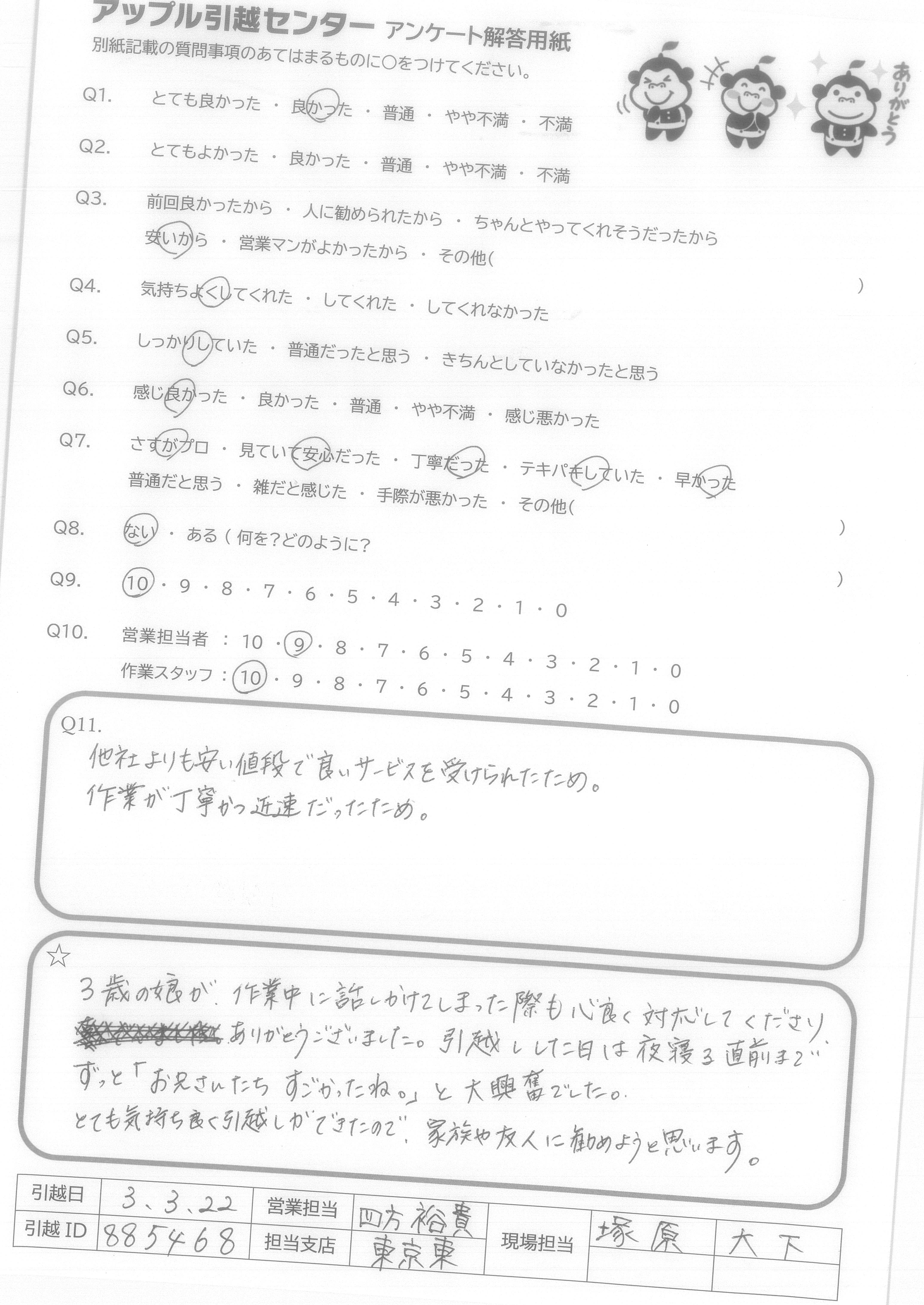 A.3歳の娘が、作業中に話しかけてしまった際も心良く対応してくださり、ありがとうございました。引越しした日は夜寝る直前までずっと「お兄さんたちすごかったね。」と大興奮でした。 とても気持ち良く引越しができたので、家族や友人に勧めようと思います。