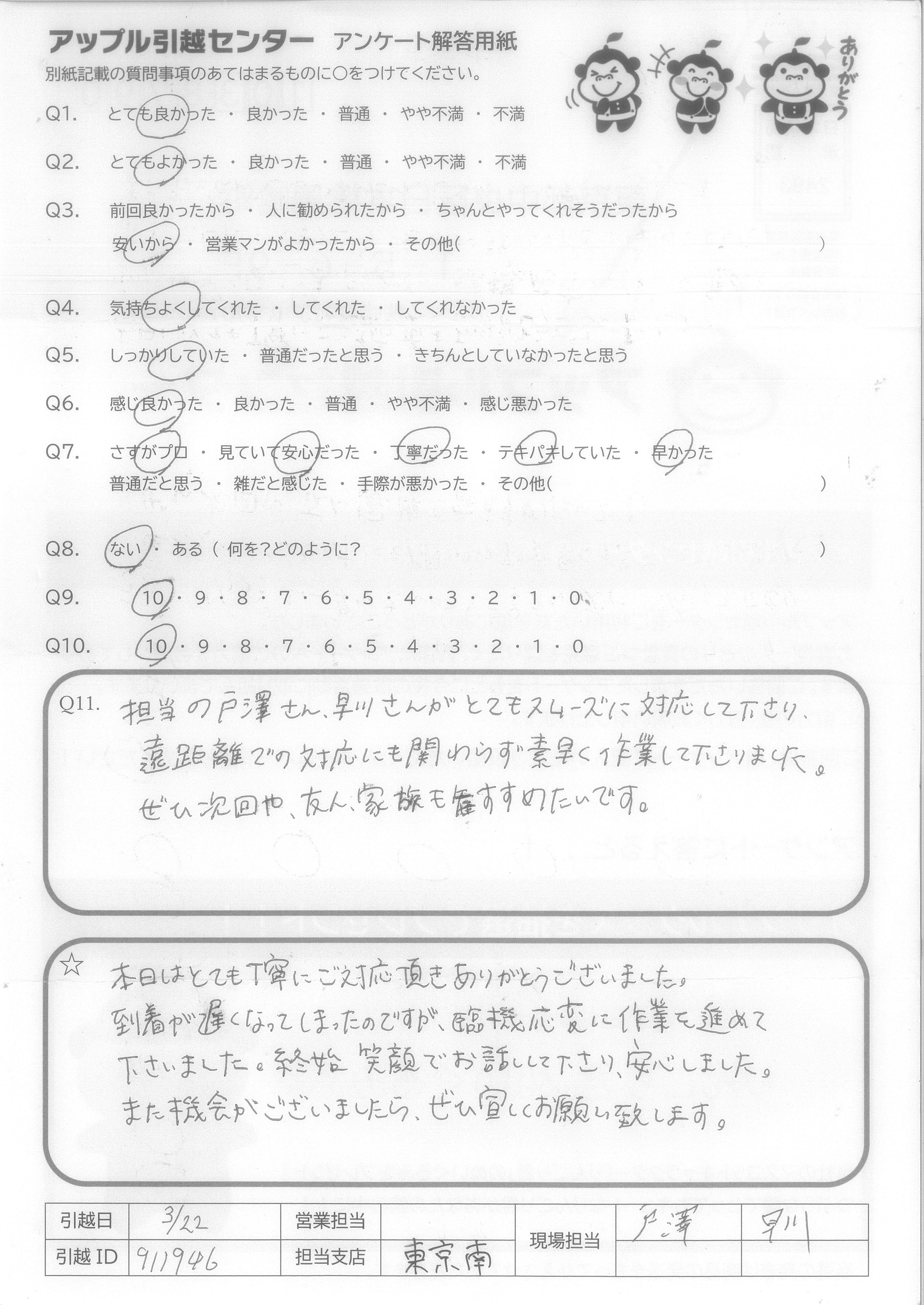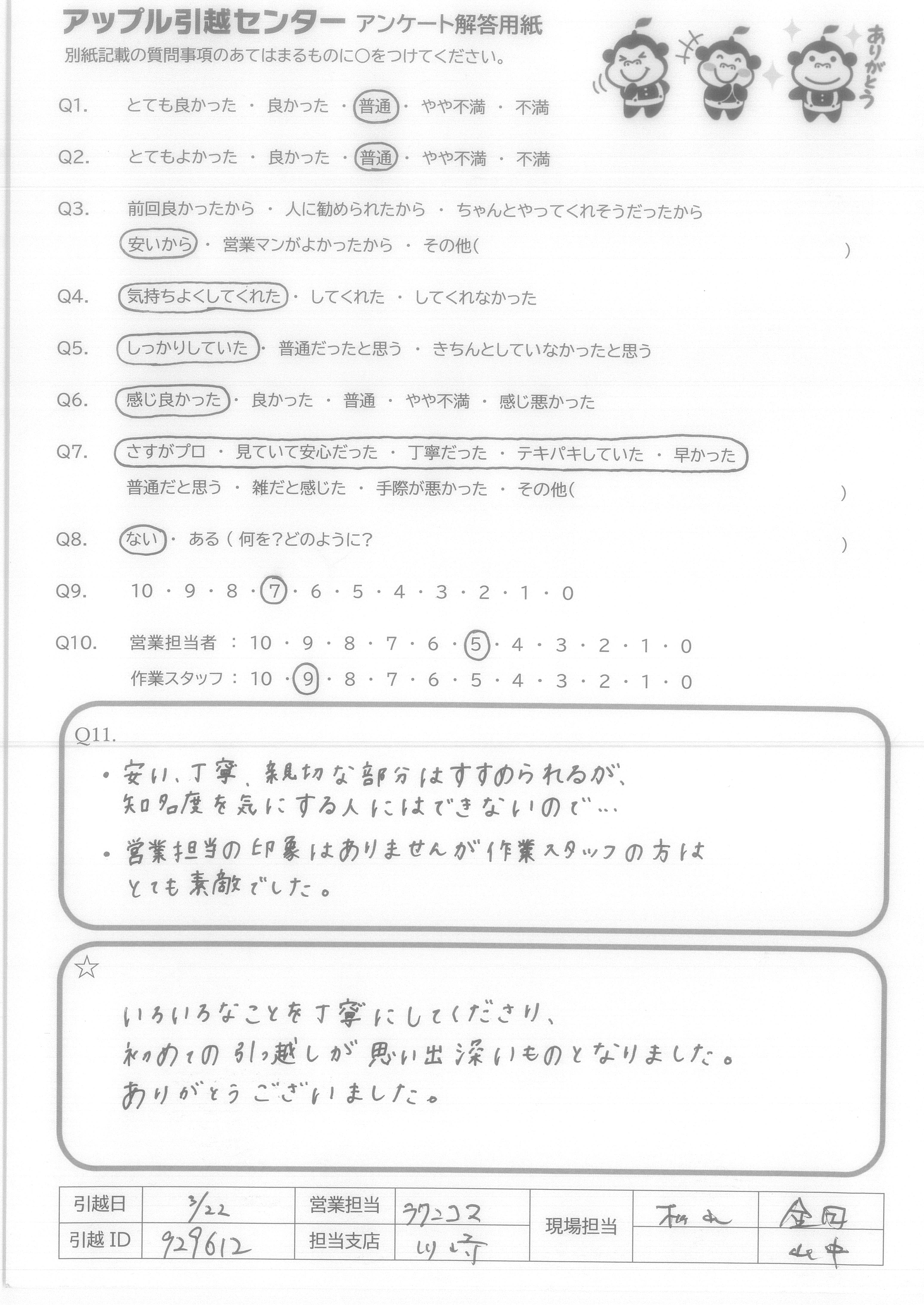 A.電話応対して下さった方がとても丁寧で、説明も分かりやすく、尚且つ引越しスタッフの方も、作業が丁寧で早かったので、その日の他の予定がスムーズに進みました。ありがとうございました!! コロナに気を付けて頑張って下さい!!