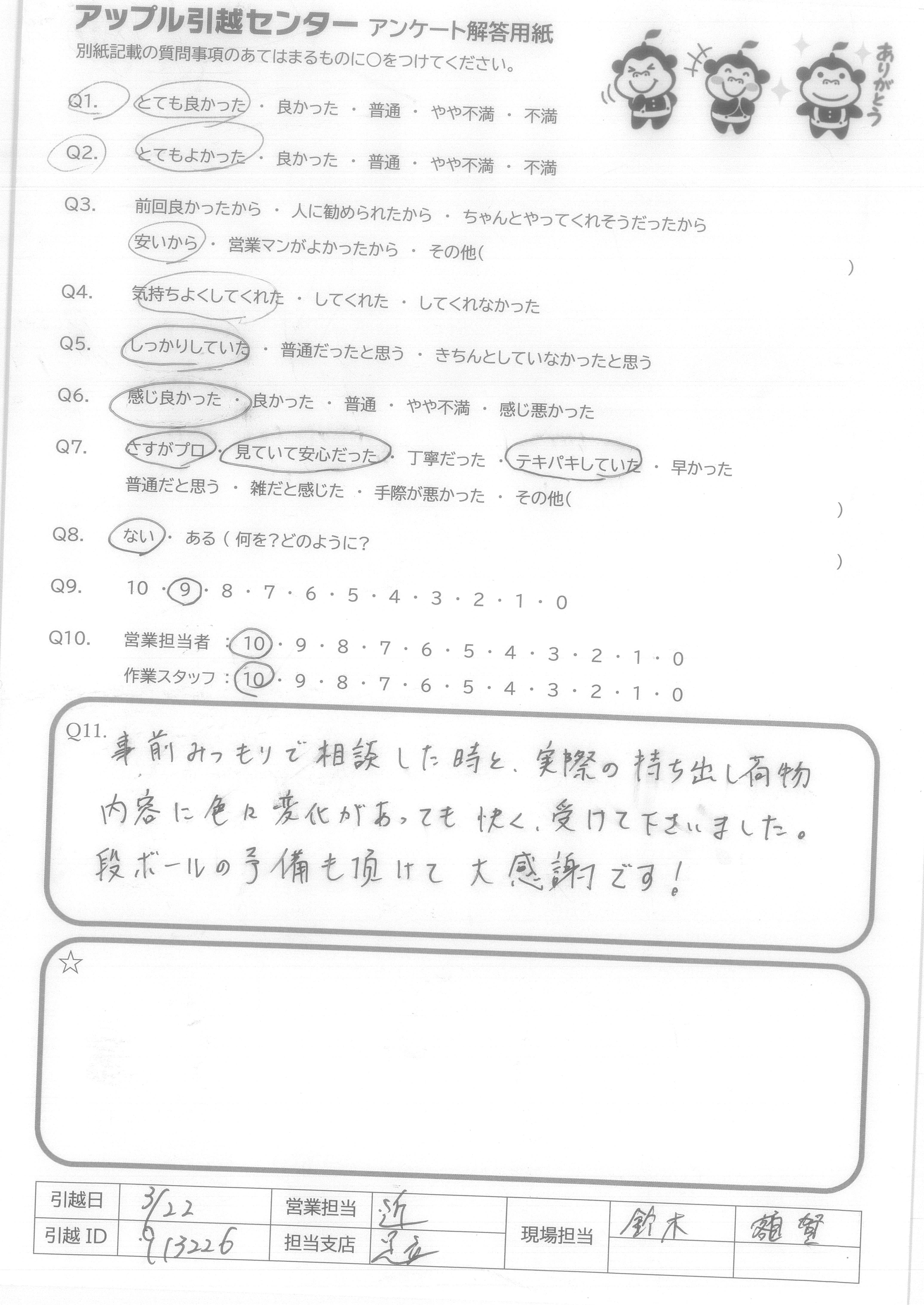 A.事前みつもりで相談した時と、実際の持ち出し荷物内容に色々変化があっても、快く、受けて下さいました。段ボールの予備も頂けて大感謝です!