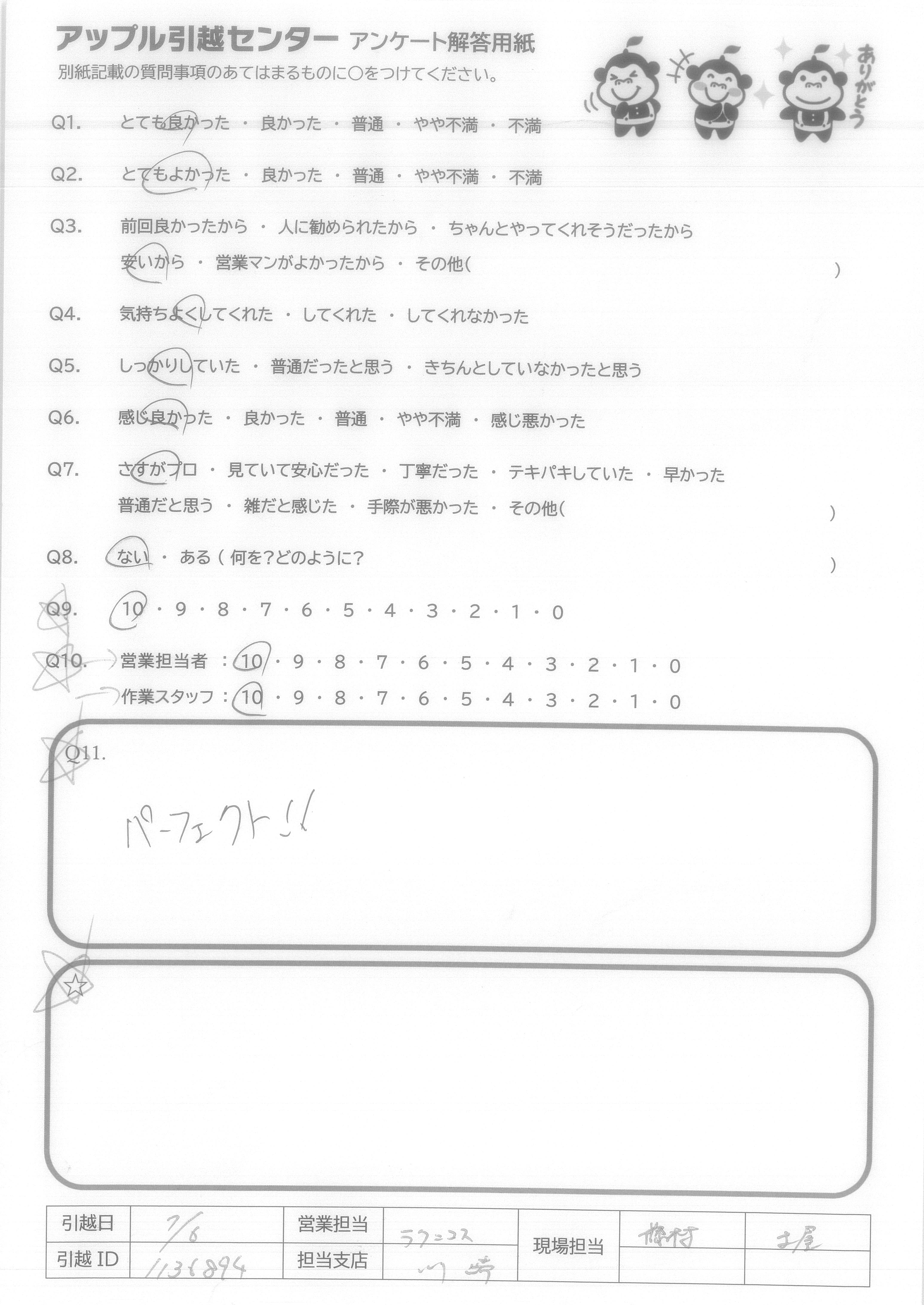 A.Q9:引っ越し業者を知り合いにすすめる機会がそもそもあまりないと思ったので Q10:電話対応して下さった方の印象がとても良かったです。 営業担当の方も明るくお話しやすかったです。 初めての引っ越しでしたが、こんなに安くして下さって驚きました。 ありがとうございました。作業スタッフの方もテキパキしていてとても早かったです。