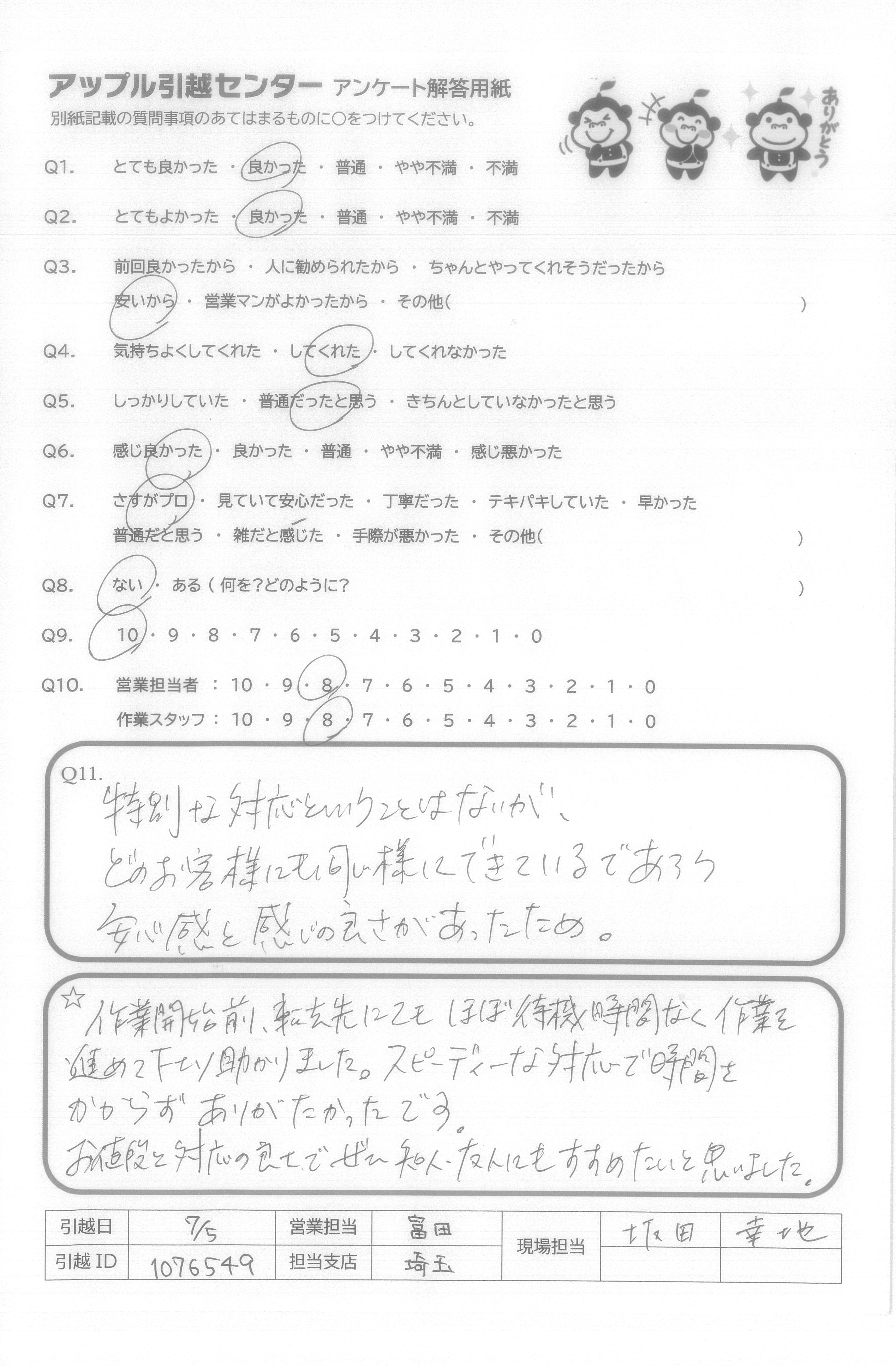 引越し日:2021年07月05日 エリア:埼玉県さいたま市浦和区
