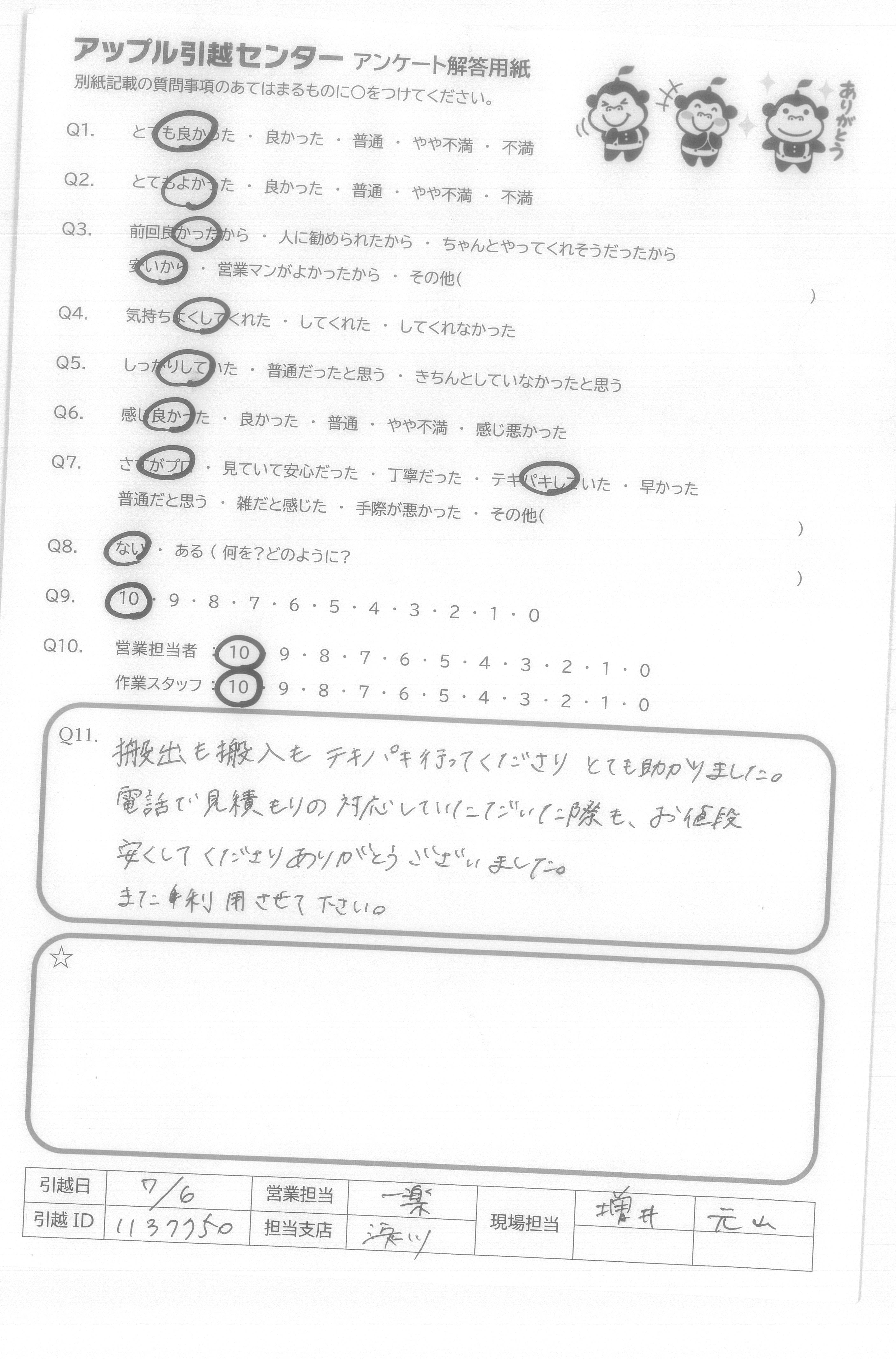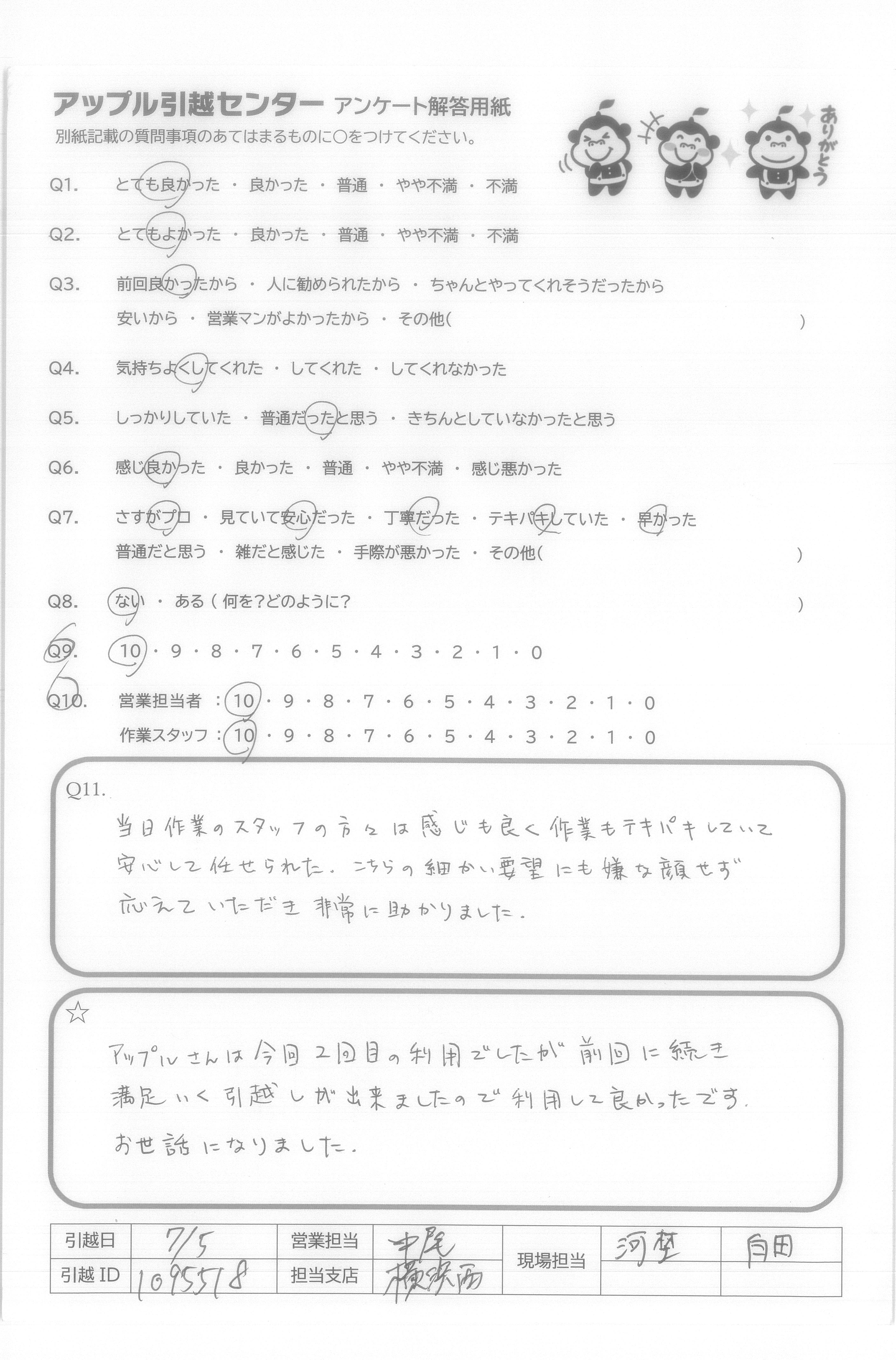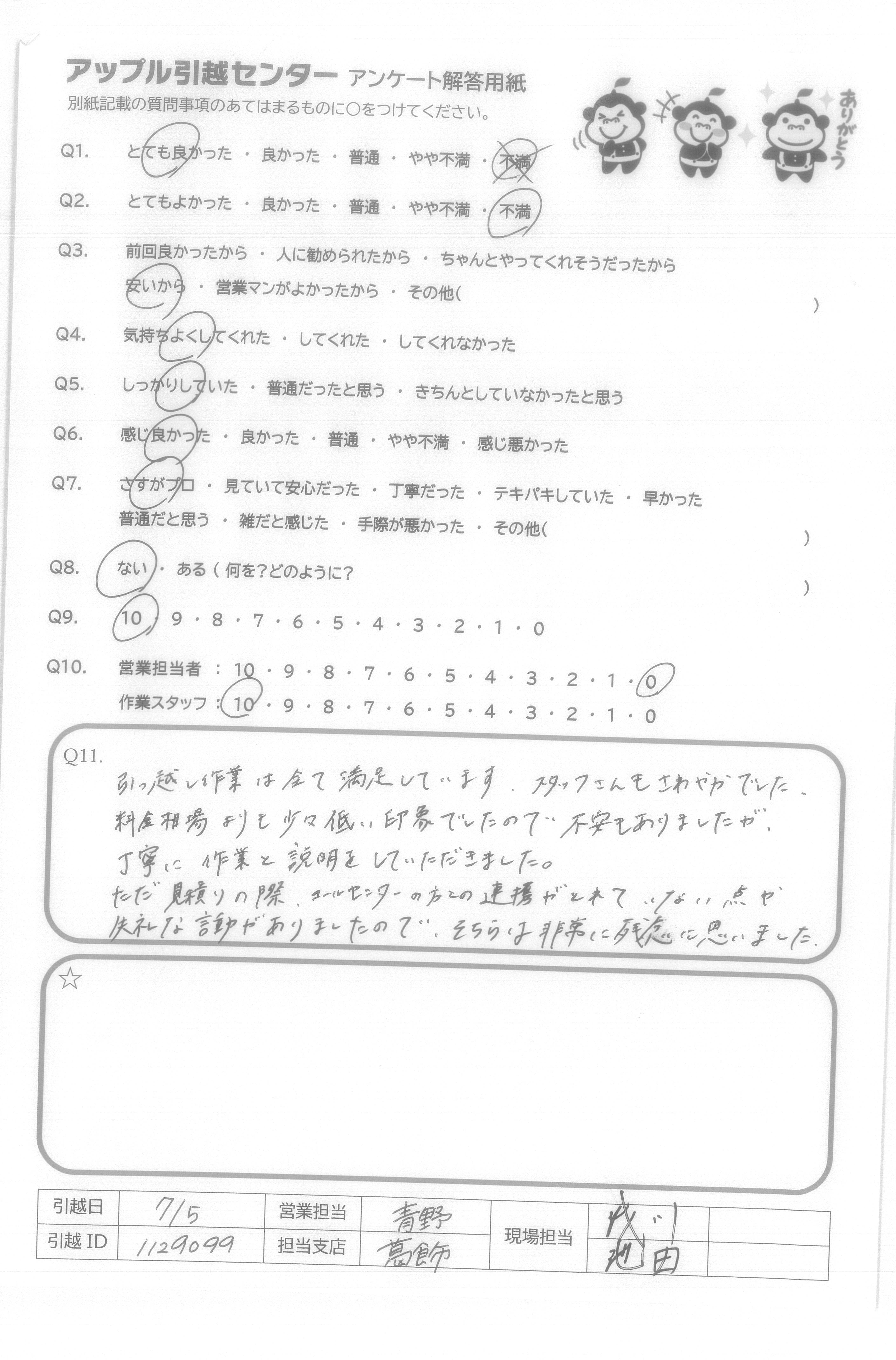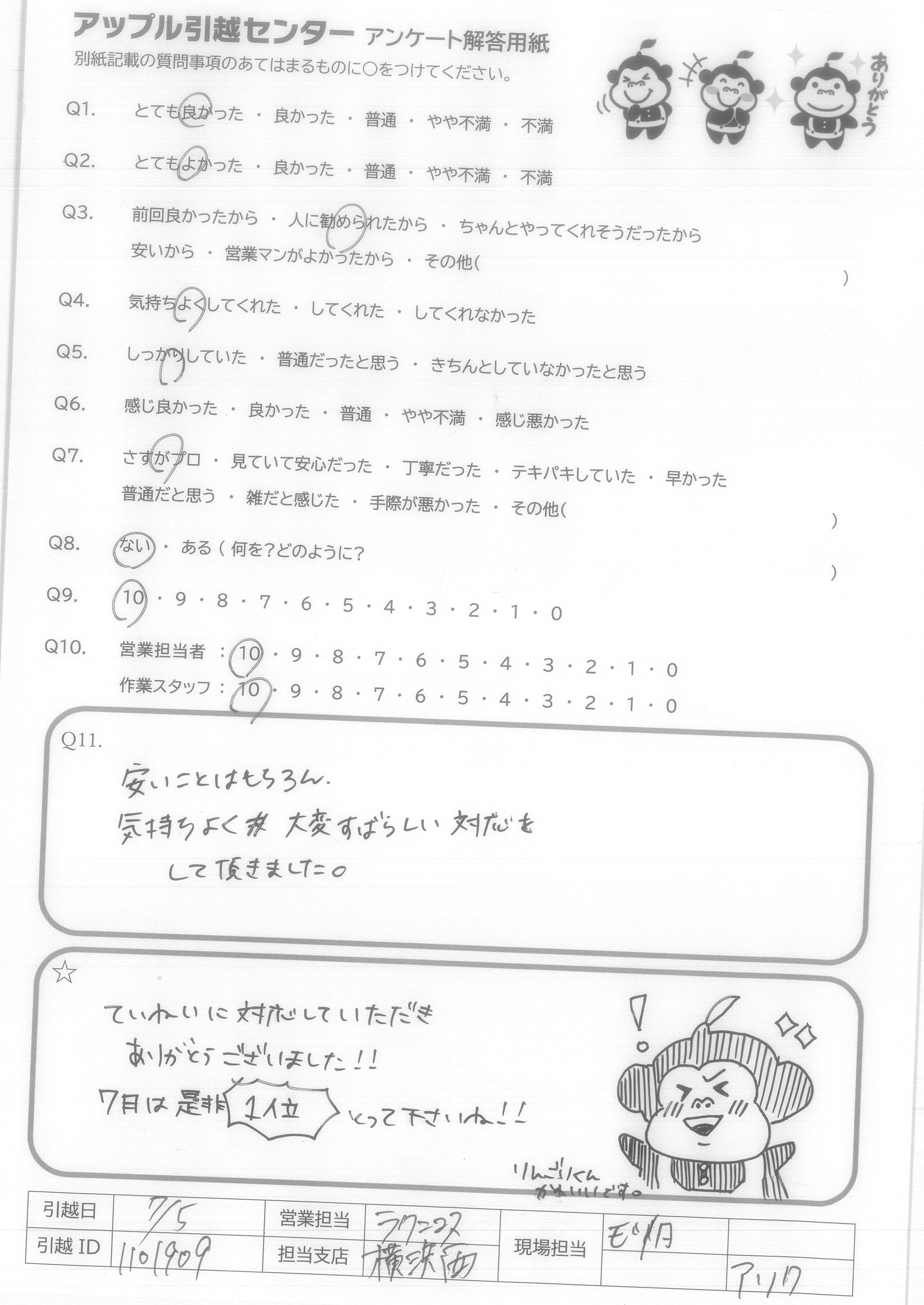 A.新居の引っ越しで、ダンナの方がアップルさんを使わせていただきました。 私(妻)の方が別の会社、そこまで担当の方も丁ねいで、気持ちはよくなかったので、また機会あればアップルさんに頼みたいです。 皆さま、あつい中、ありがとうございました。