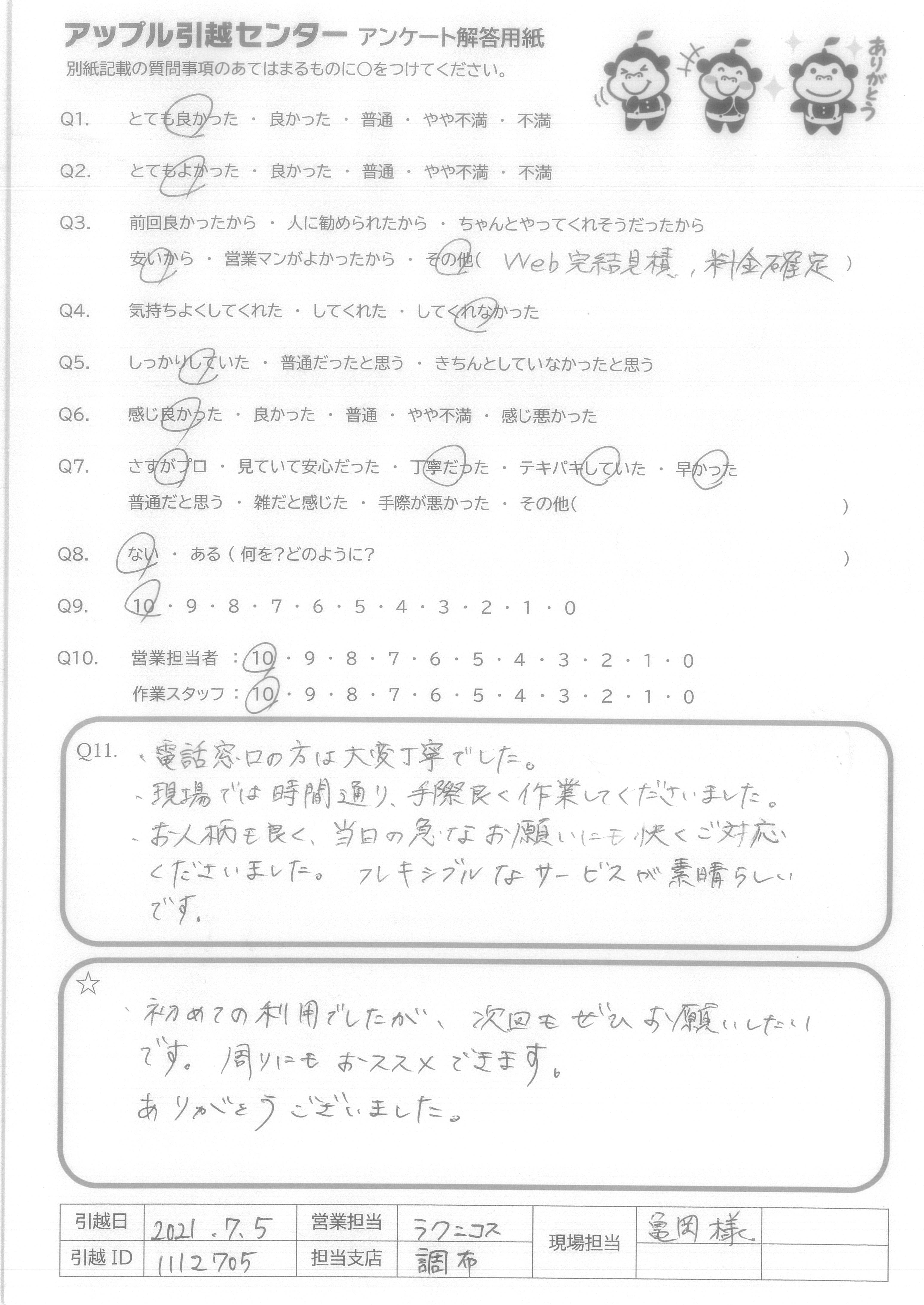 A.また引っ越しする際は、利用させて頂きます。ありがとうございました。