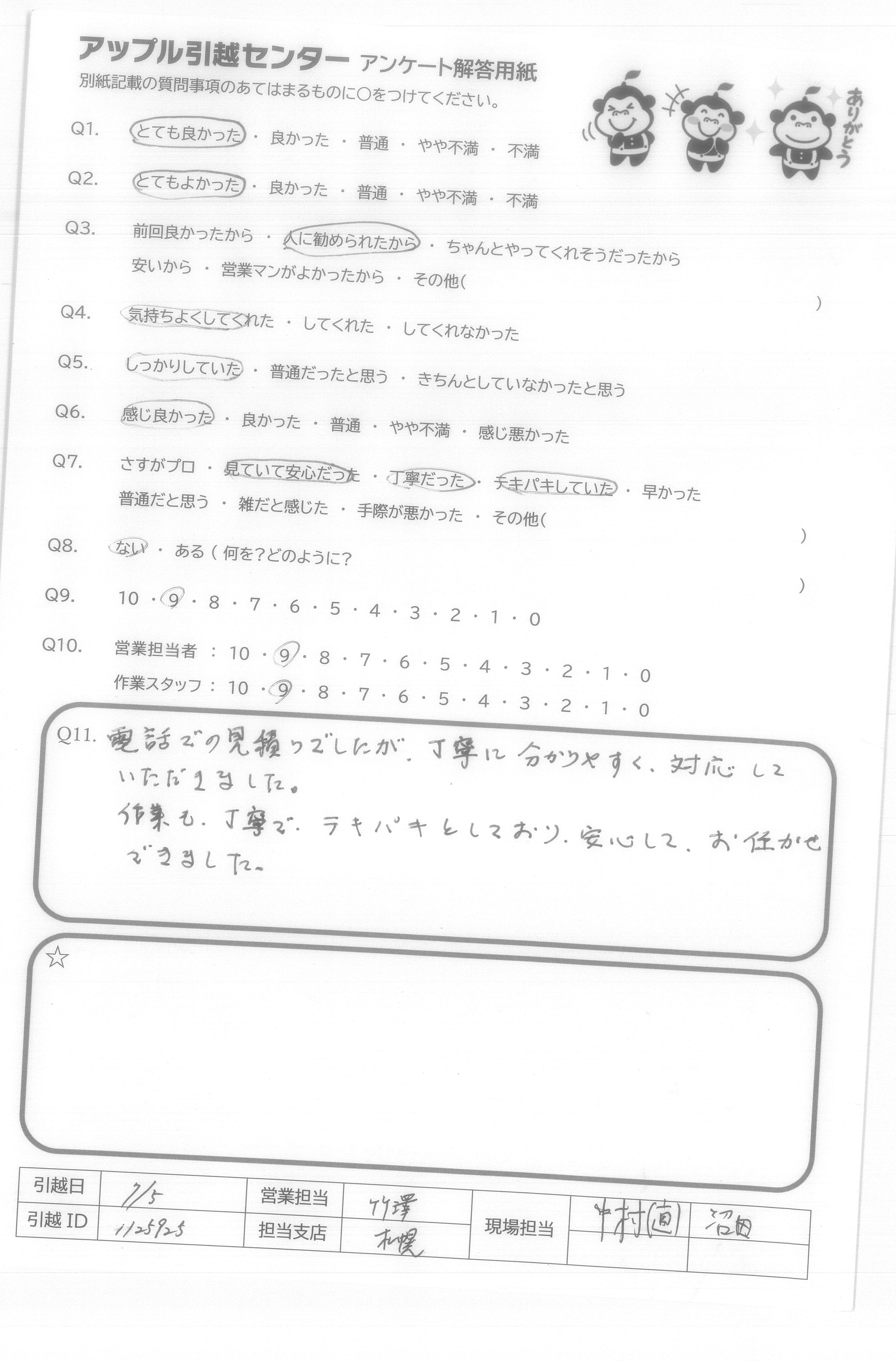 A.日本で引っ越し業者さんにお願いをして引っ越しするのは初めてだったので、どのように進んでいくの不安なところもありましたが、電話の対応も含め、作業の方にも非常に良く対応いただいたので大満足です。無事荷物も届き、引っ越しができましたことに感謝いたします。本当にありがとうございました。