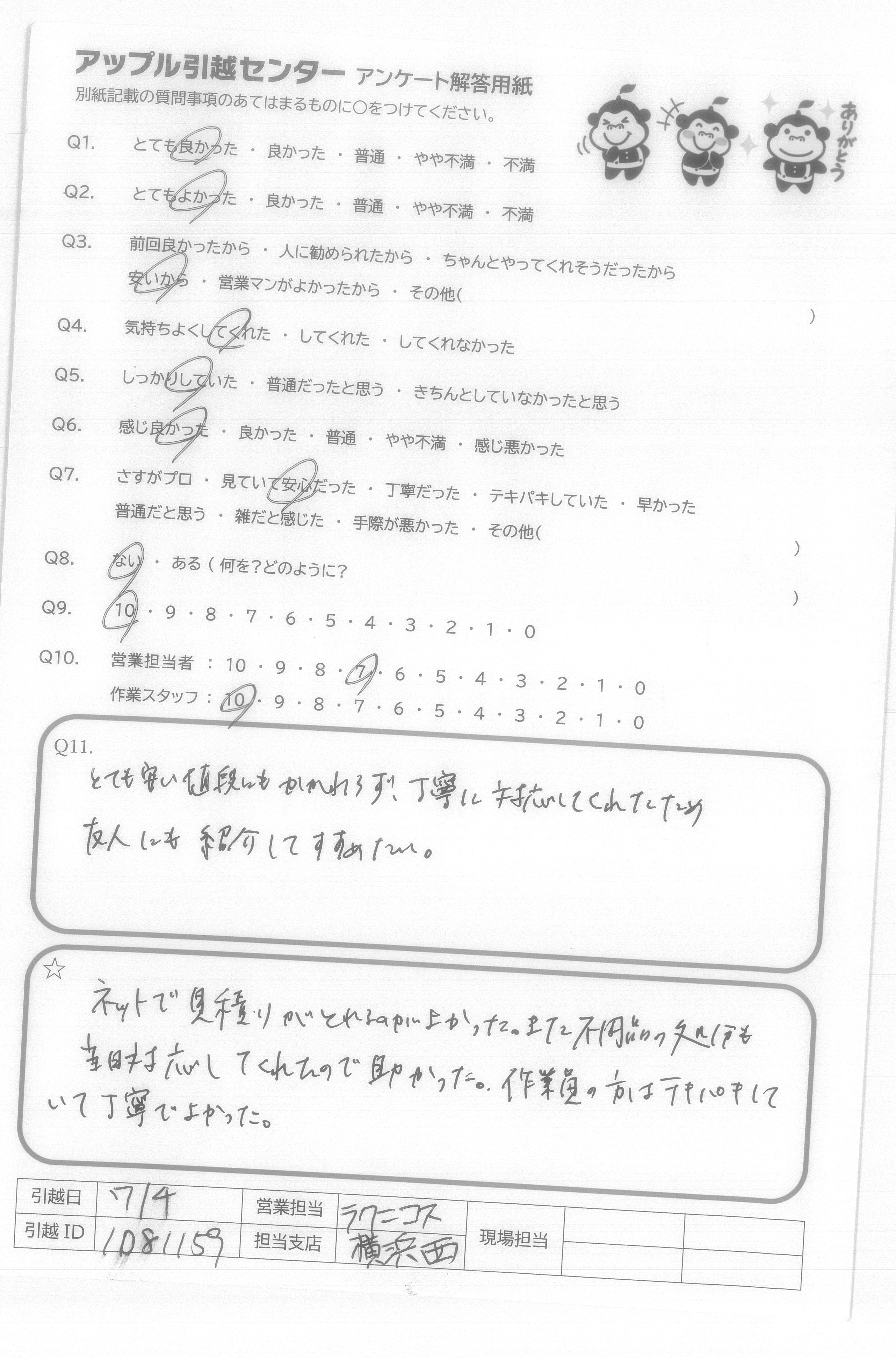 引越し日:2021年07月04日 エリア:神奈川県横浜市港北区