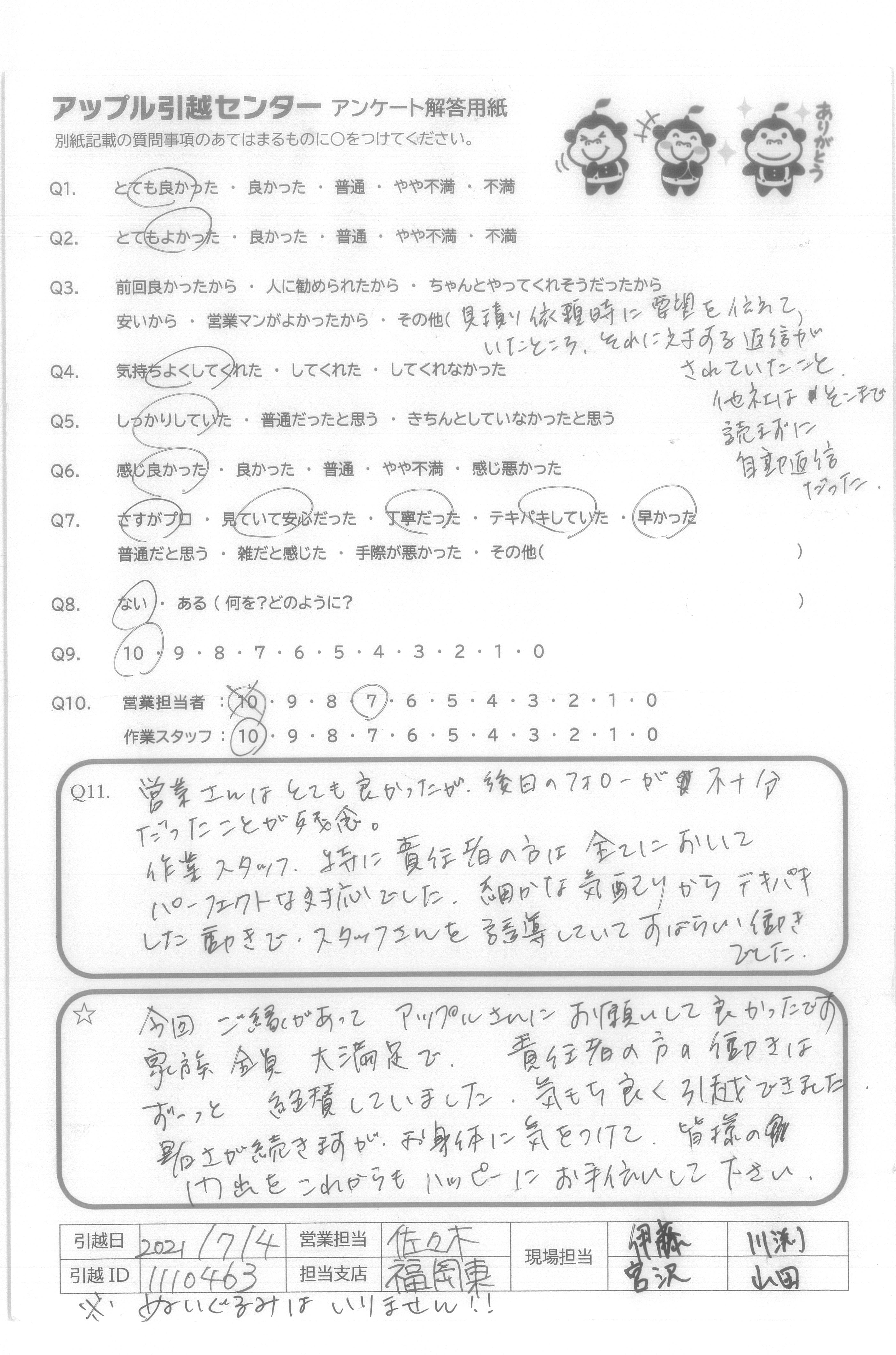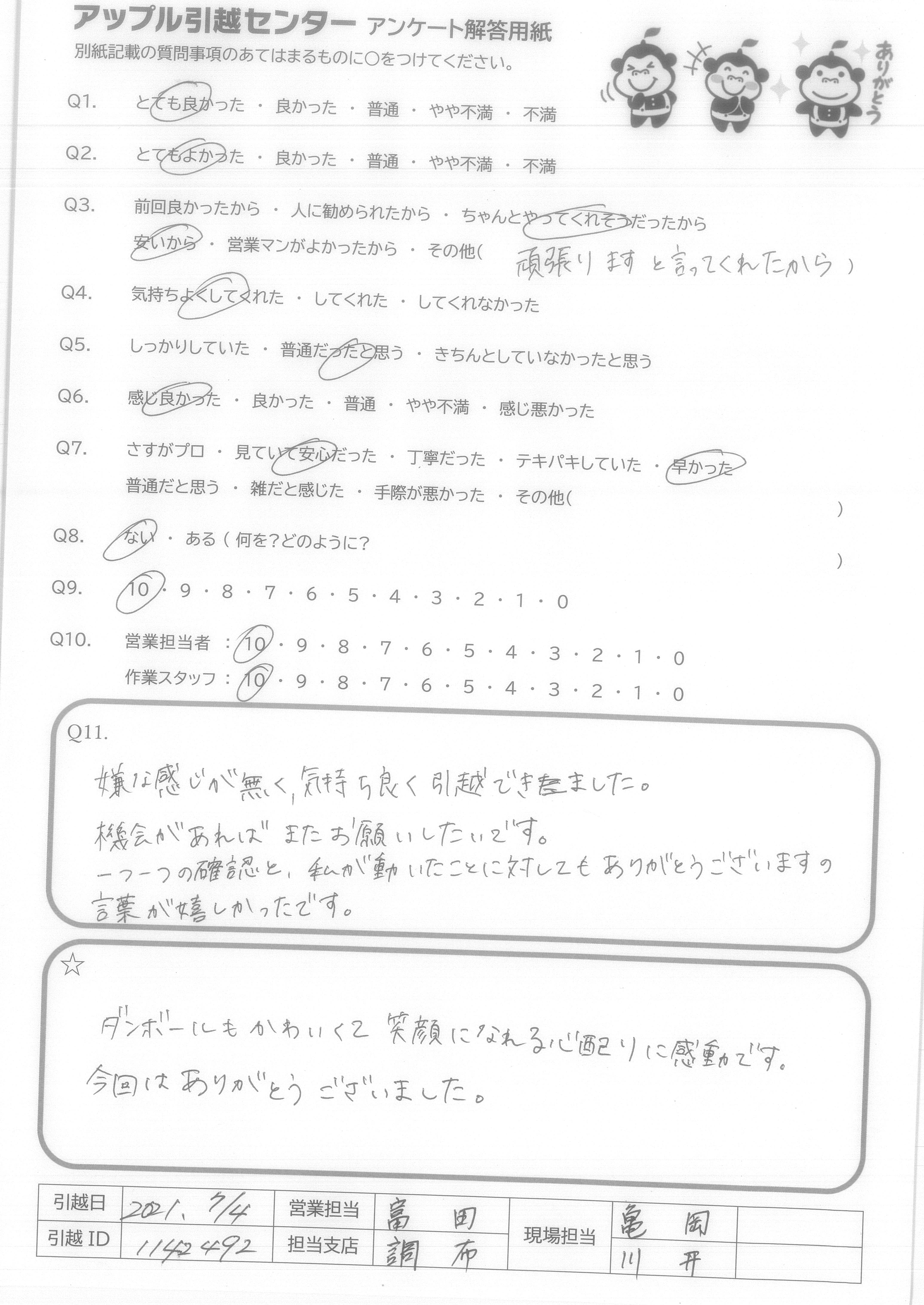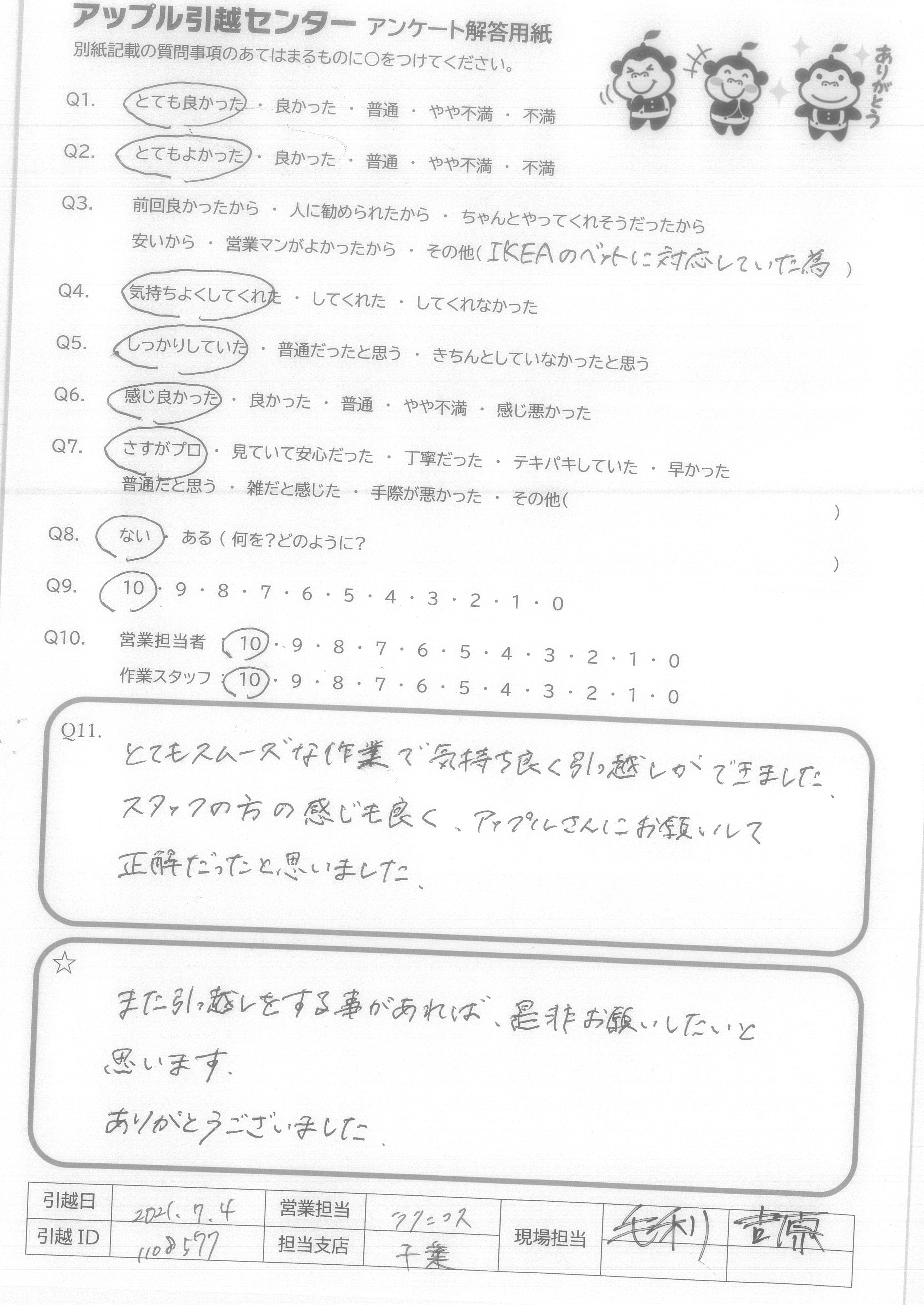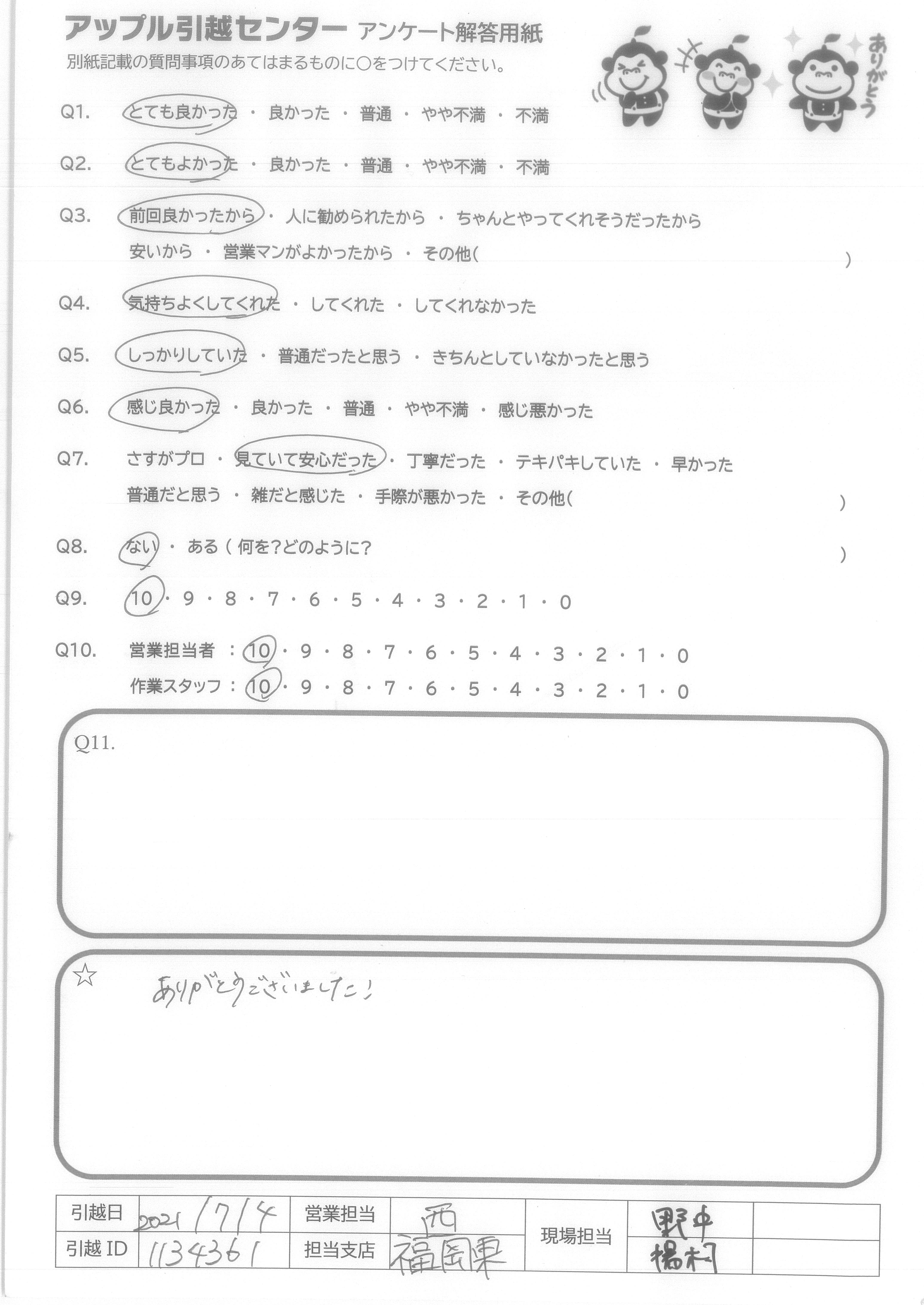 A.今回ご縁があって、アップルさんにお願いして良かったです。 家族全員大満足で、責任者の方の働きはずーっと絶賛していました。気もち良く引越できました。 暑さが続きますが、お身体に気をつけて、皆様の門出をこれからもハッピーにお手伝いして下さい。