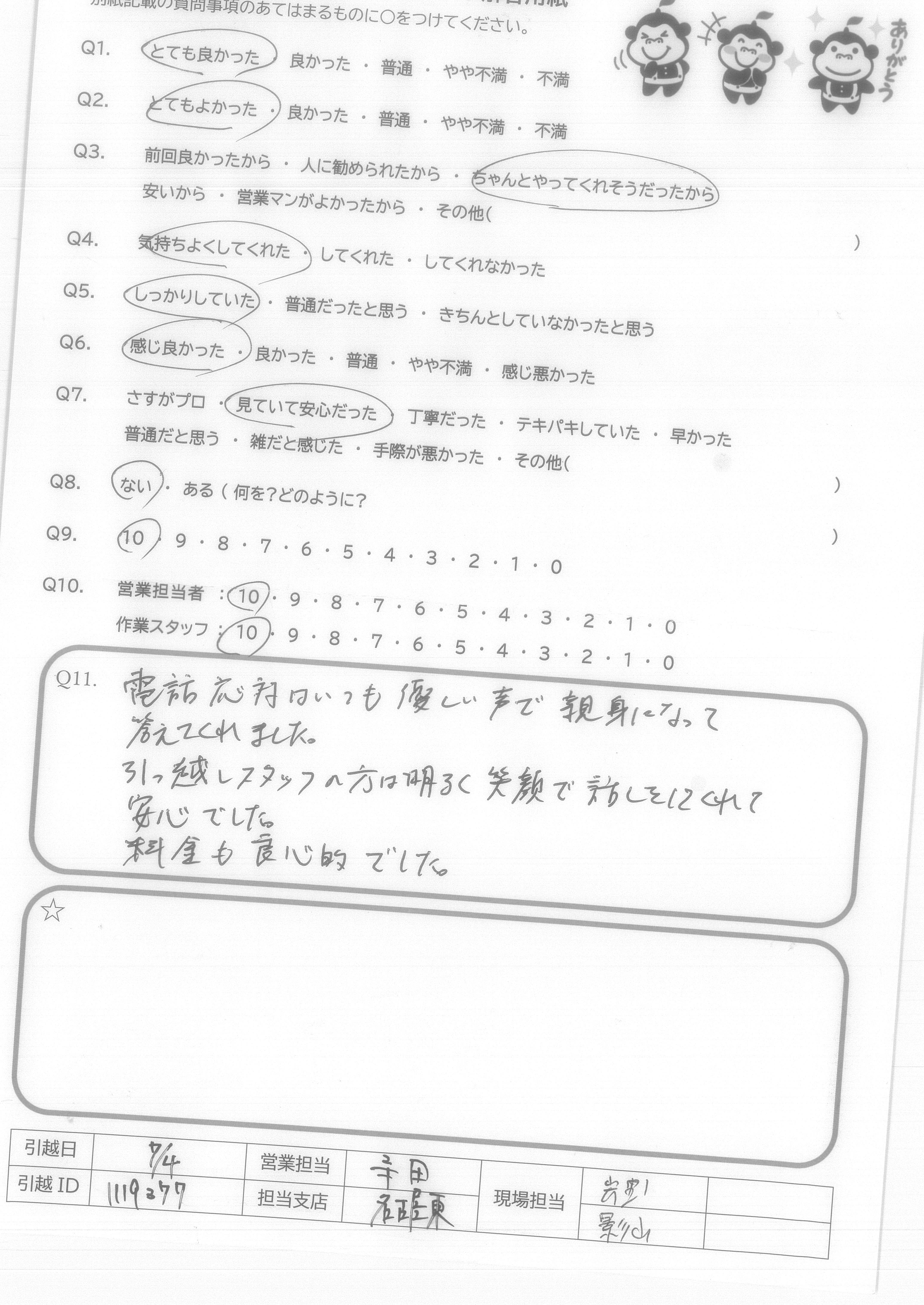 A.嫌な感じが無く、気持ち良く引越できました。 機会があればまたお願いしたいです。 一つ一つの確認と、私が動いたことに対してもありがとうございますの言葉が嬉しかったです。