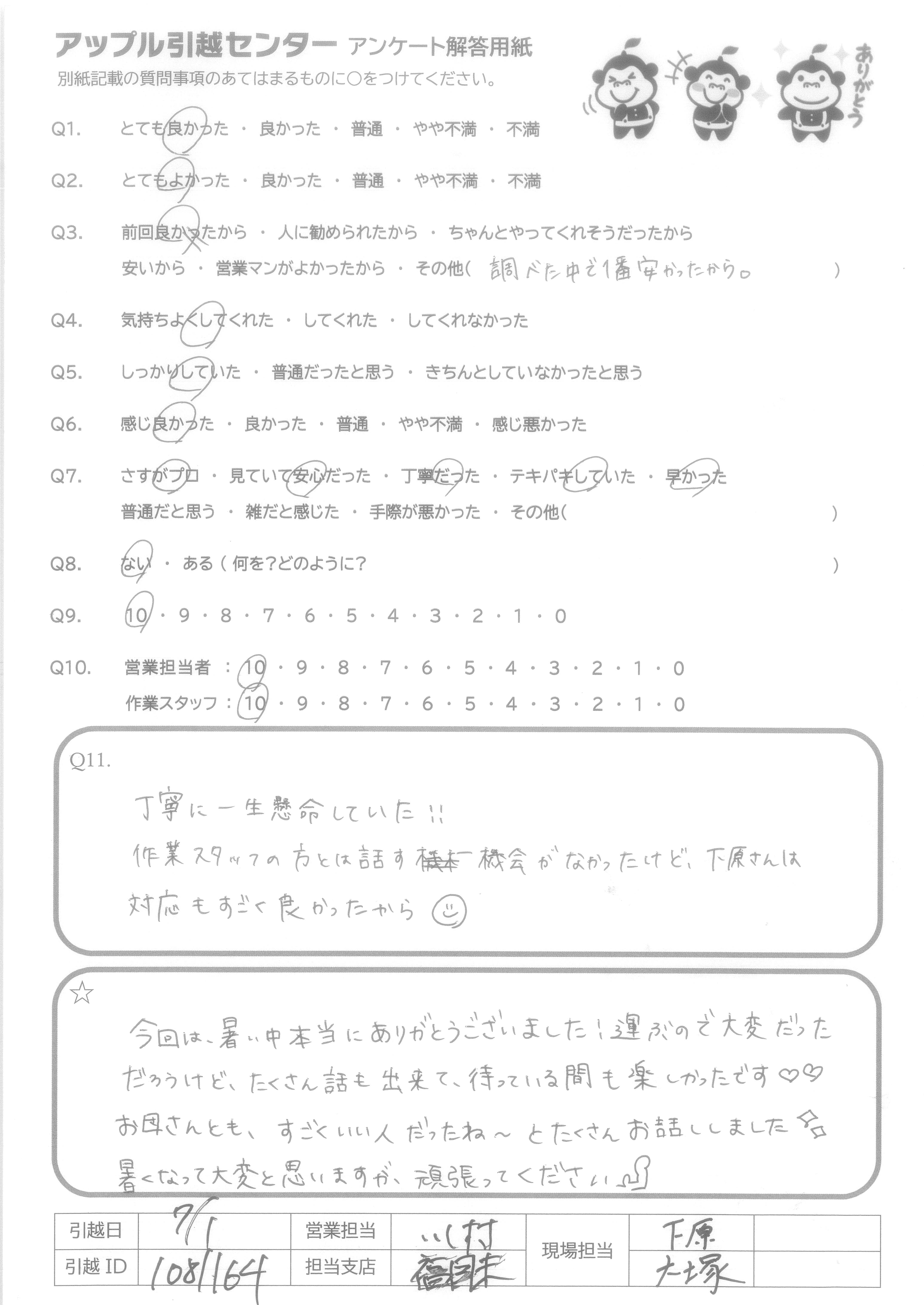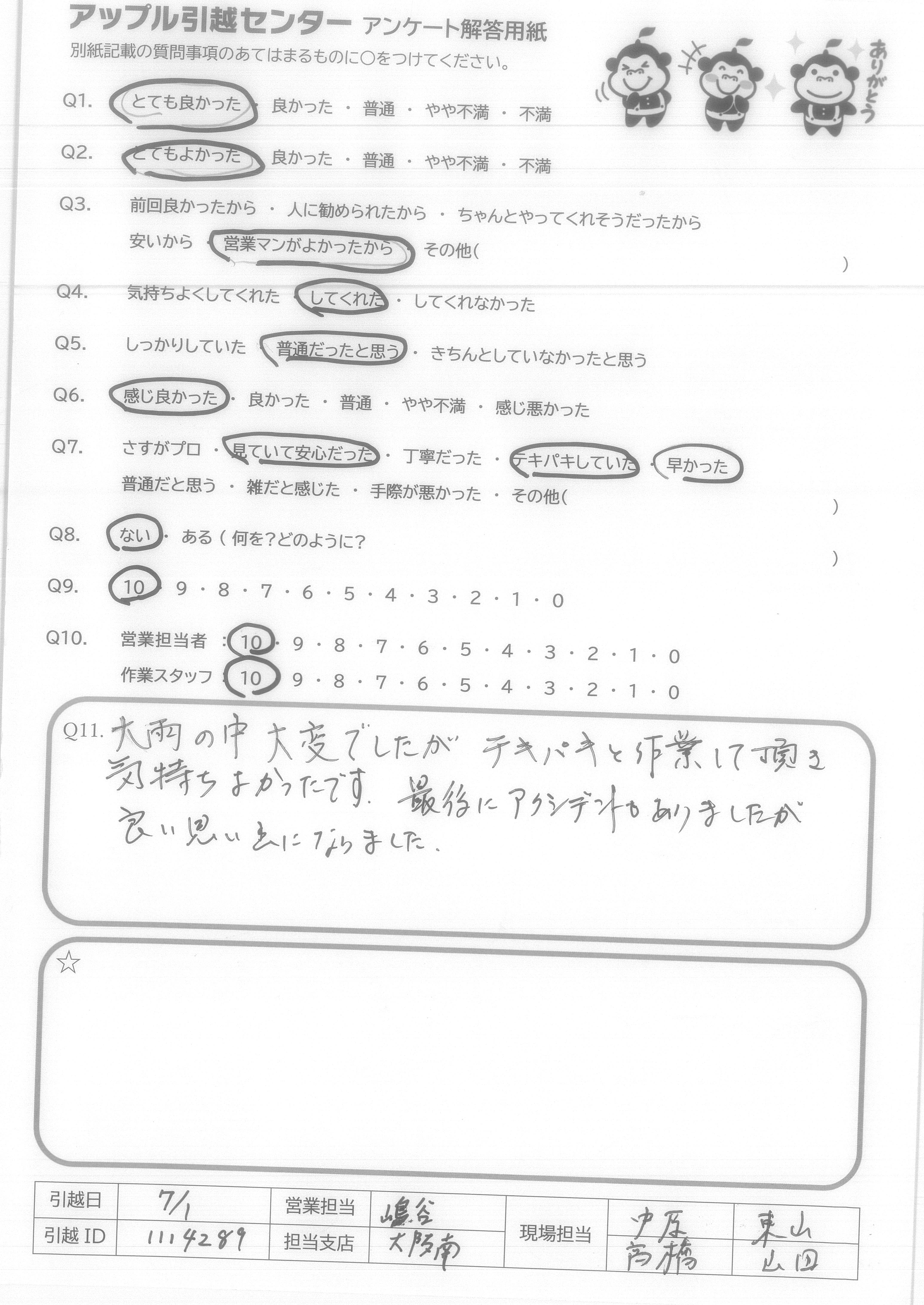 A.細かな荷物も多い中、手早く作業していただけて感謝しています。担当のお二人にぜひよろしくお伝えください