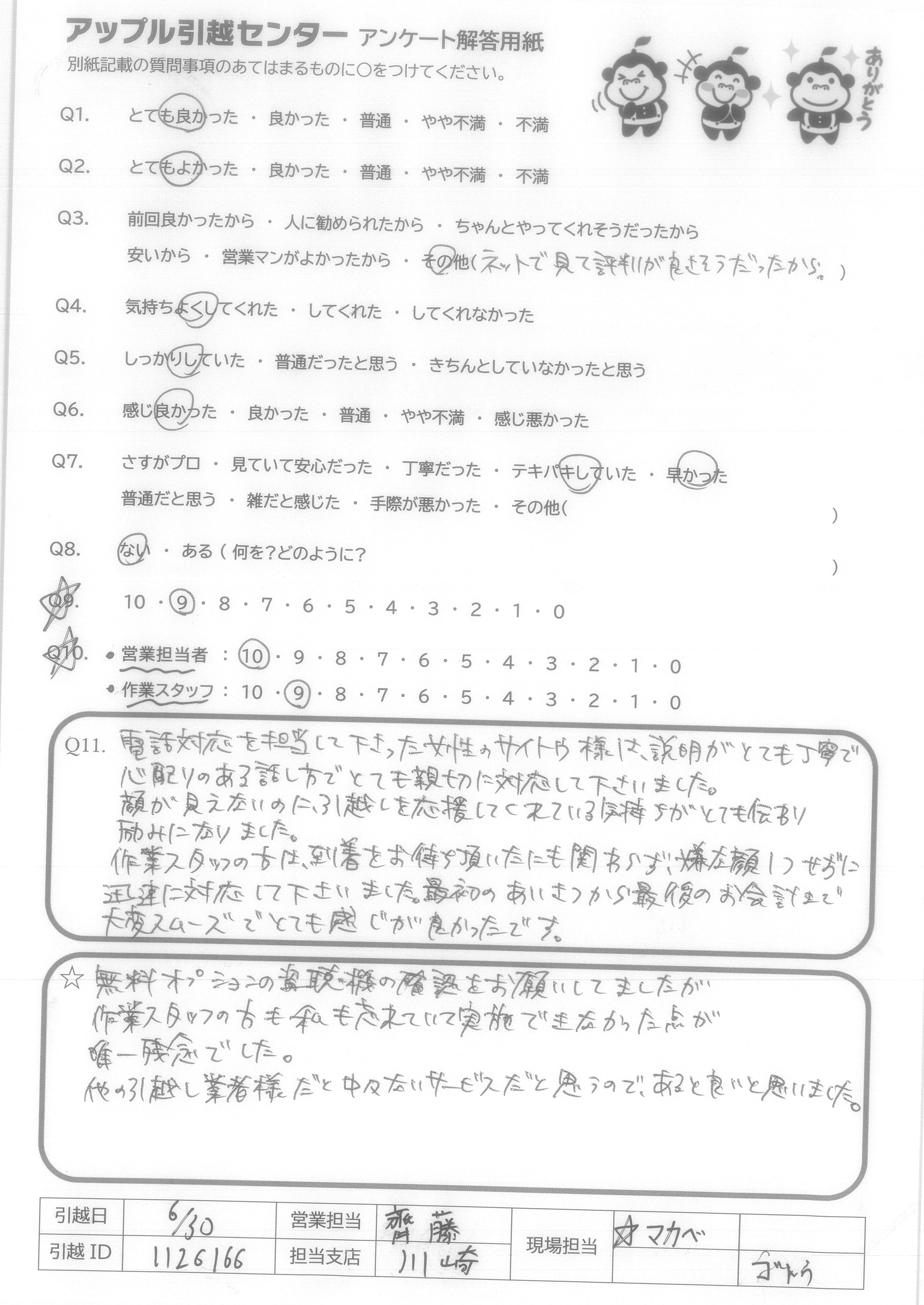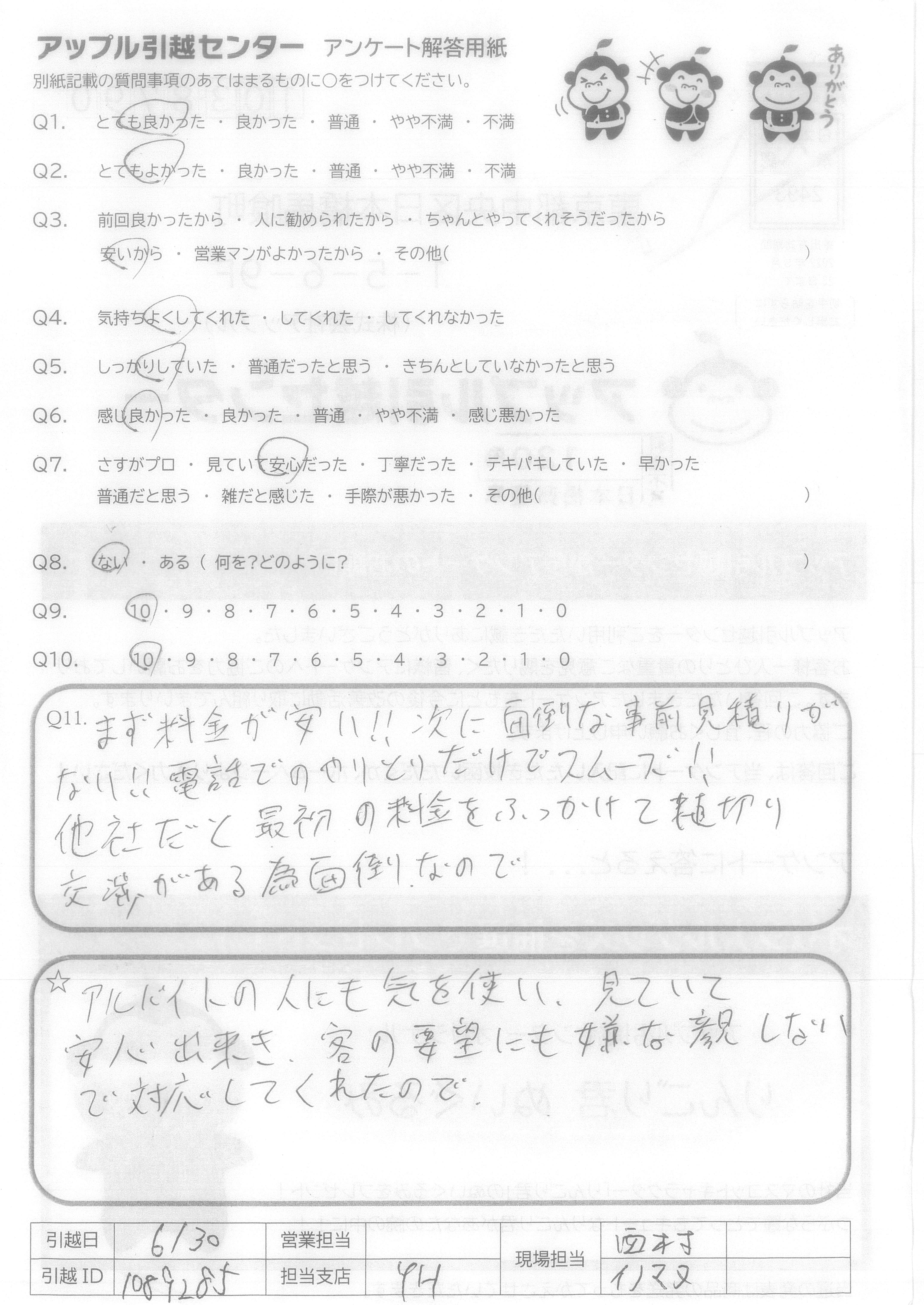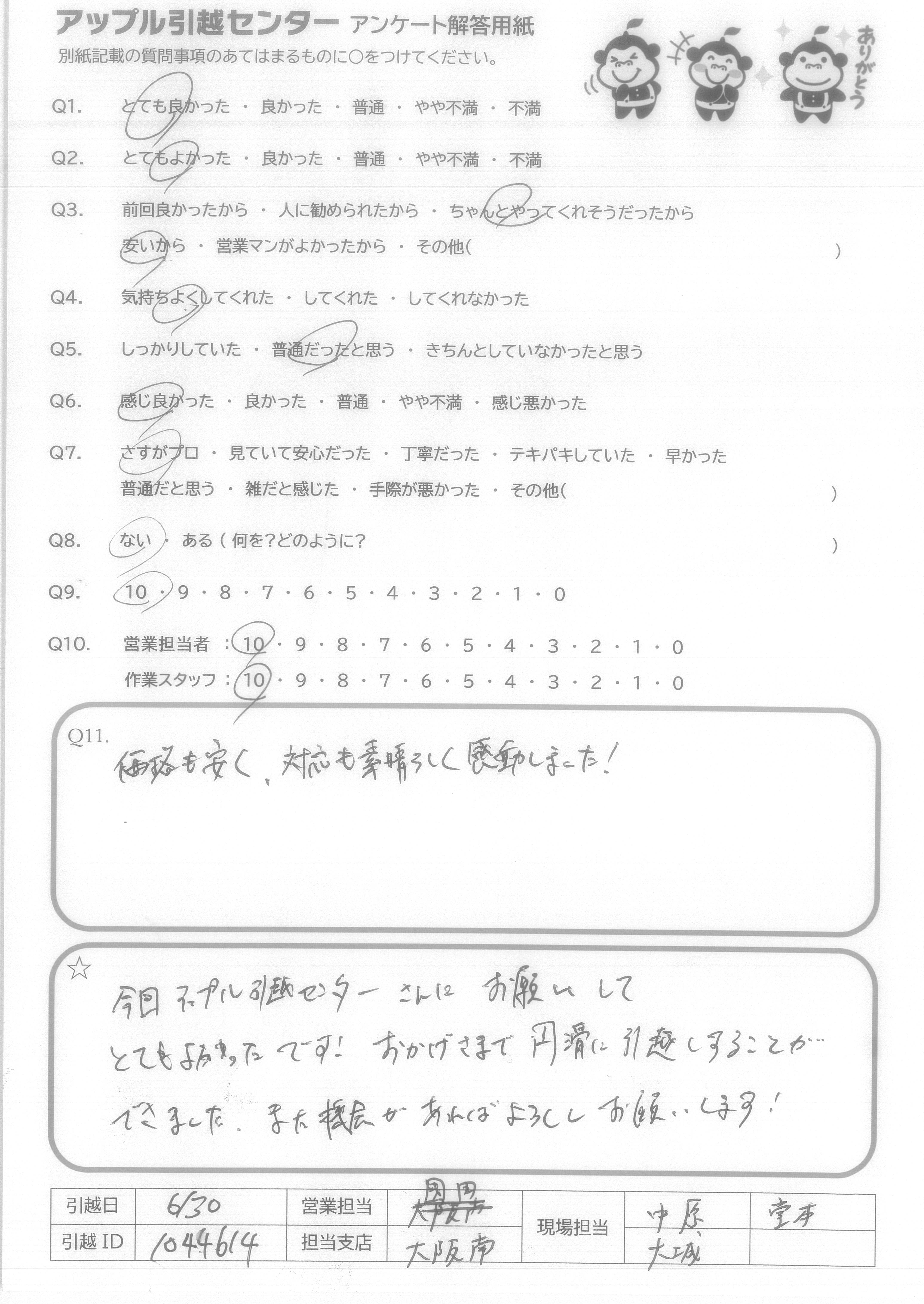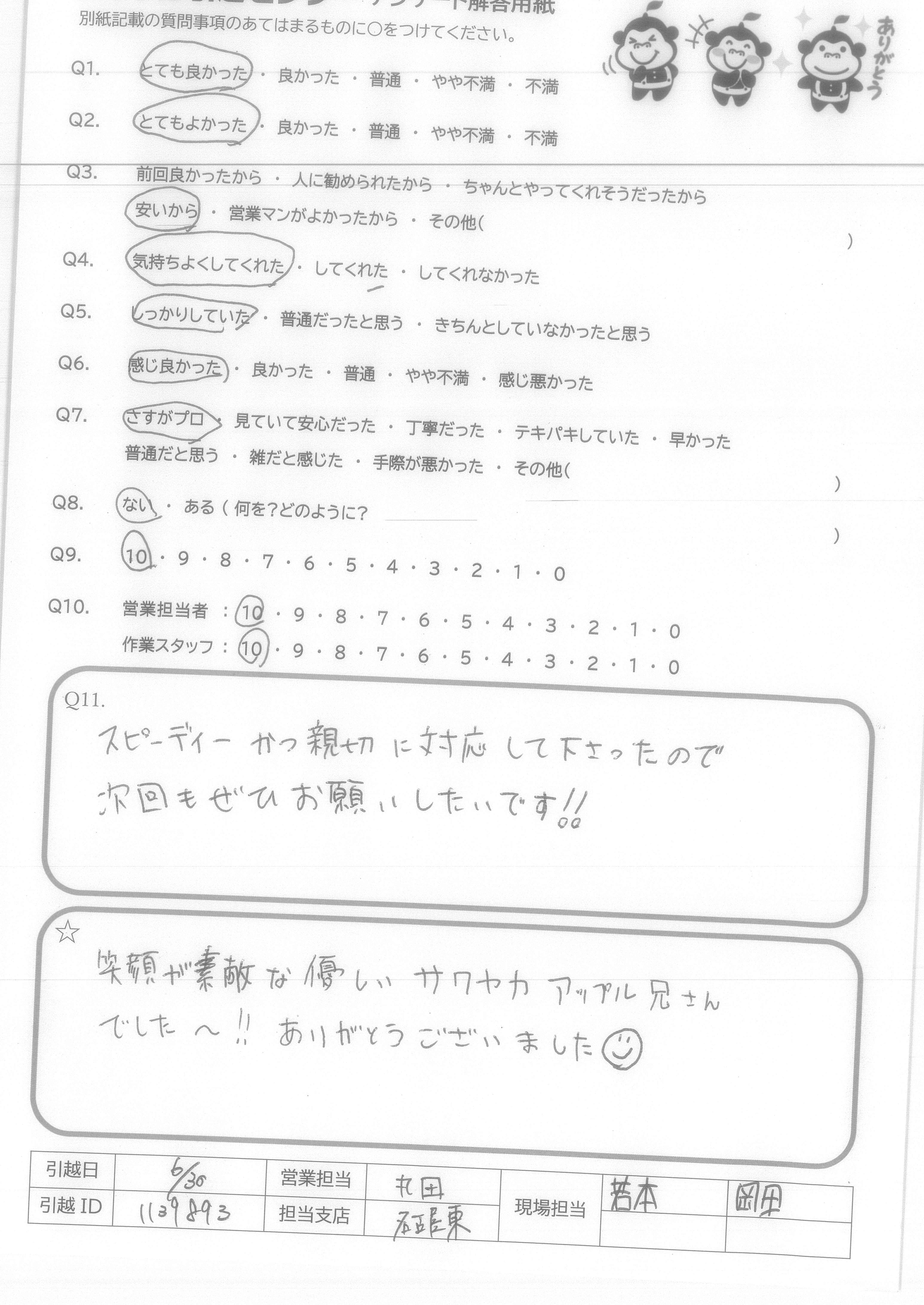 A.今回アップル引越センターさんにお願いしてとてもよかったです!おかげさまで円滑に引越しすることができました。また機会があればよろしくお願いします!
