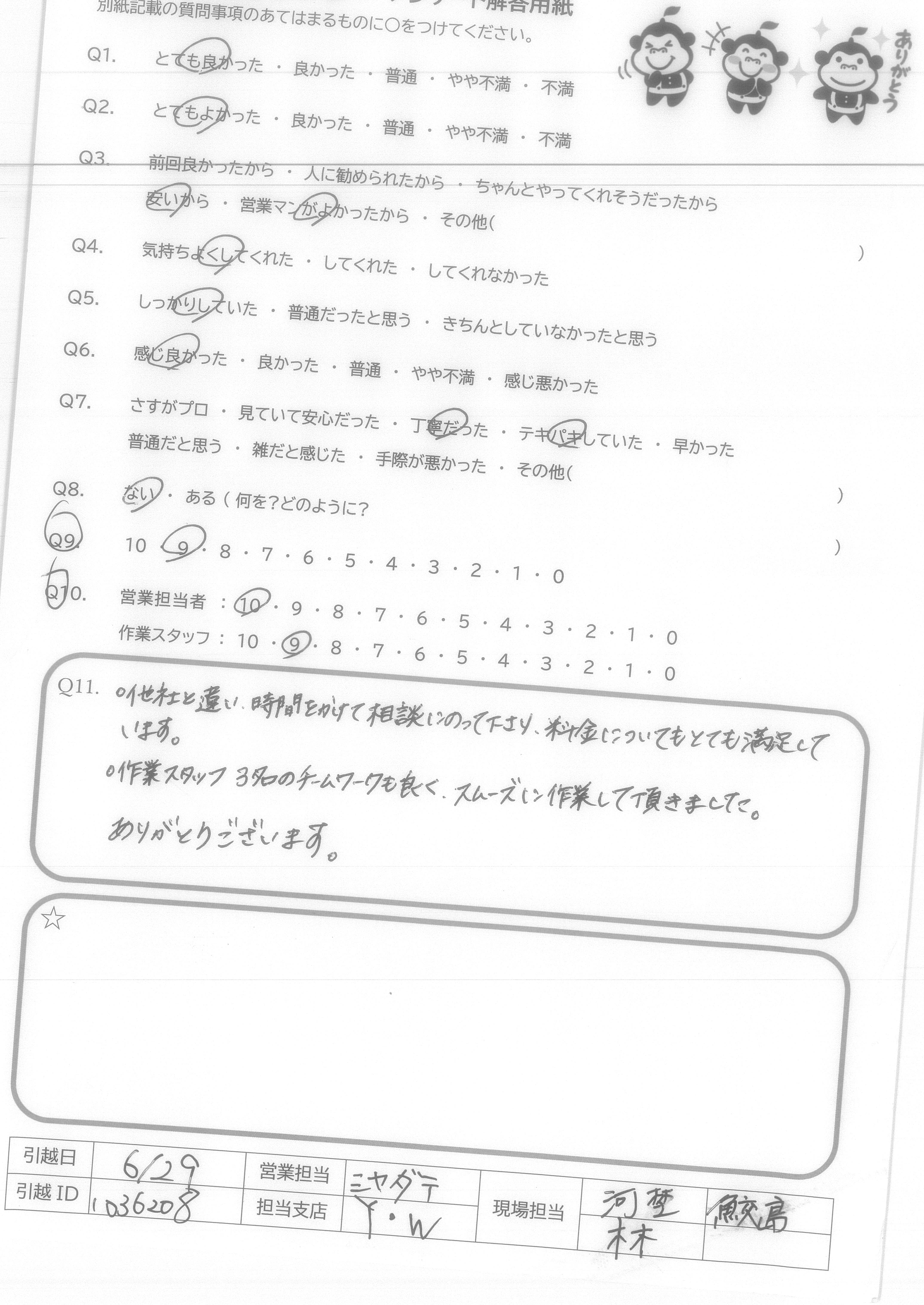 A.・他社と違い、時間をかけて相談にのって下さり、料金についてもとても満足しています。 ・作業スタッフ3名のチームワークも良く、スムーズに作業して頂きました。 ありがとうございます。