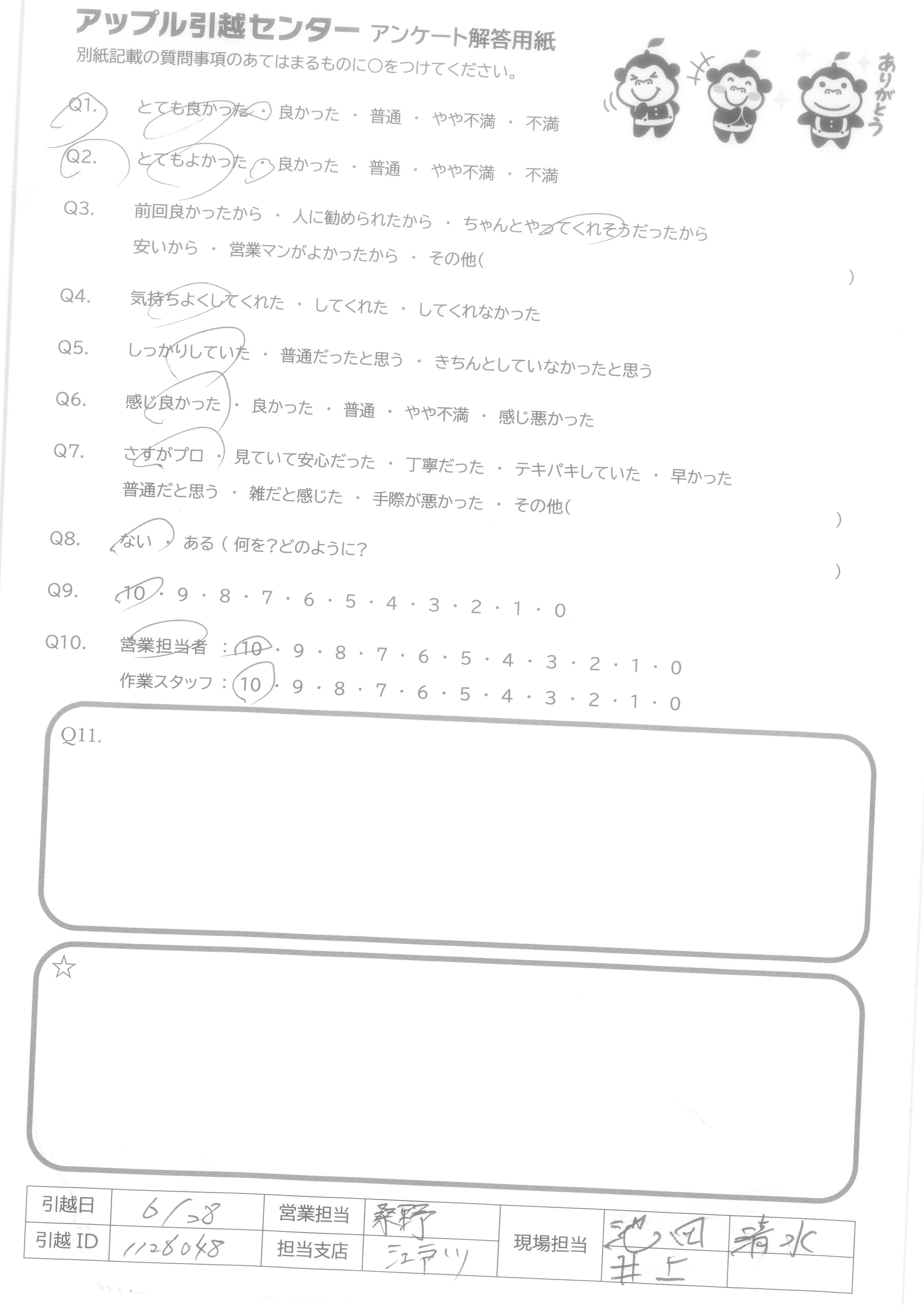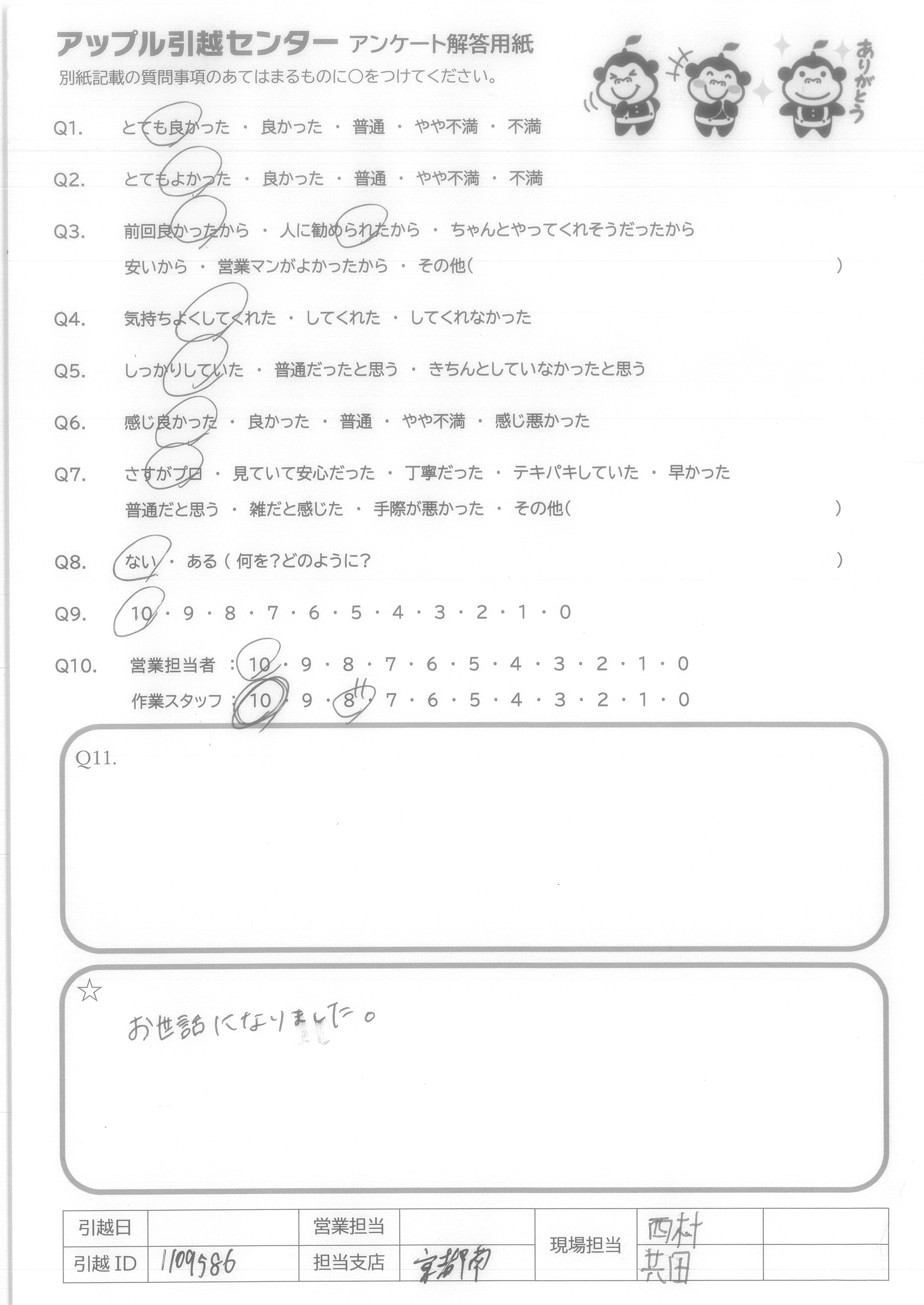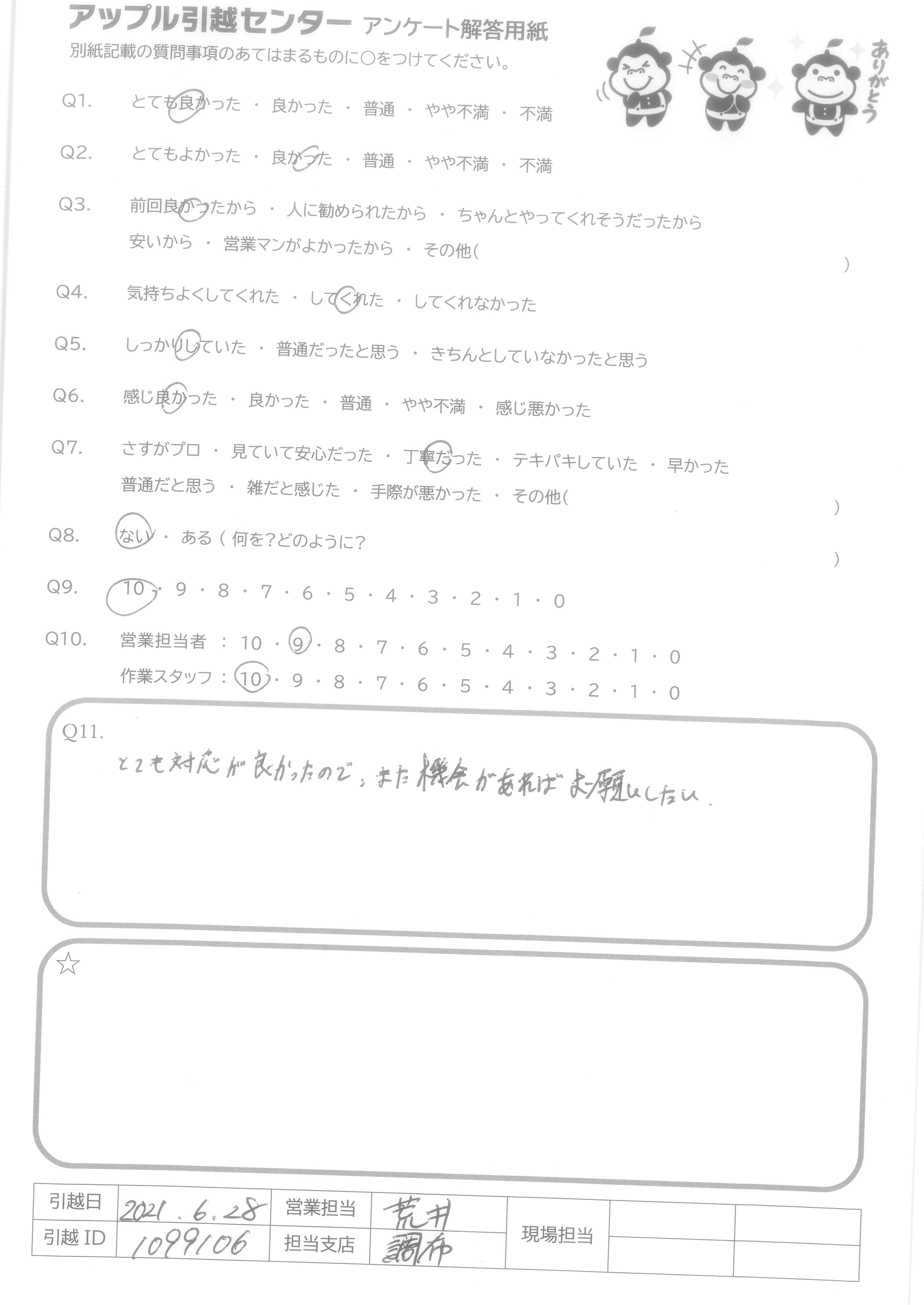 A.この度はありがとうございました! また引越しの際はお願いしたいです!!