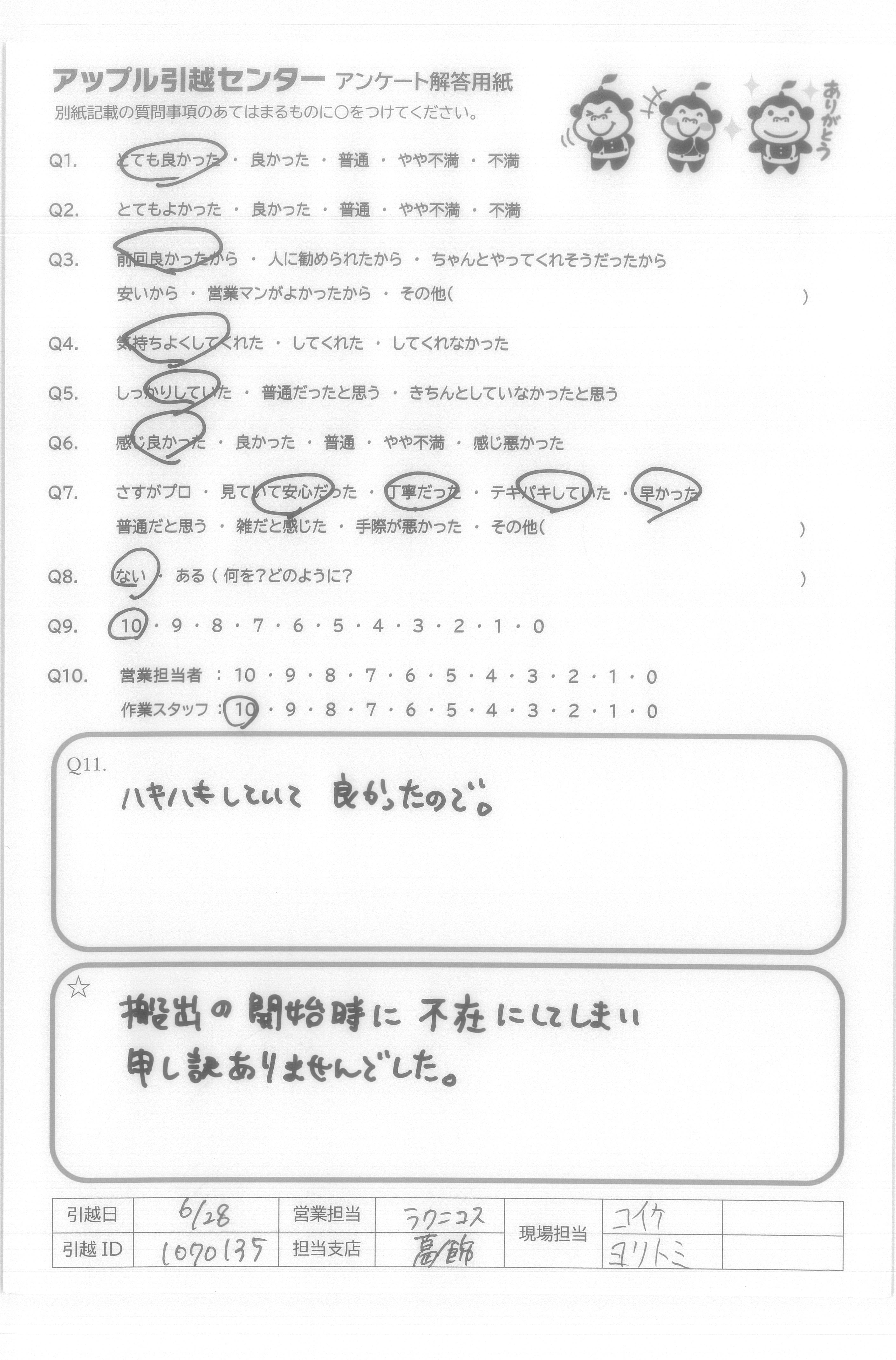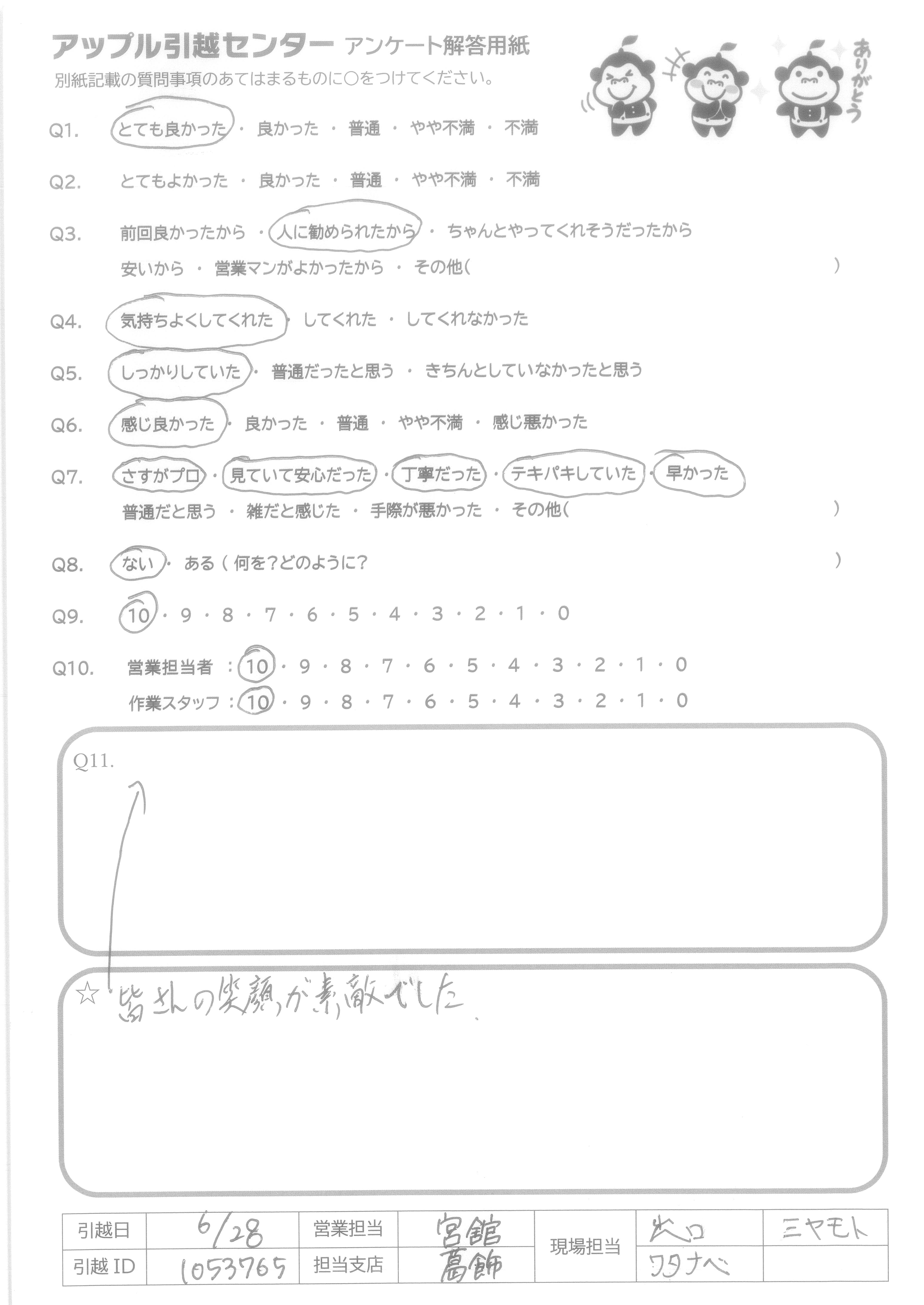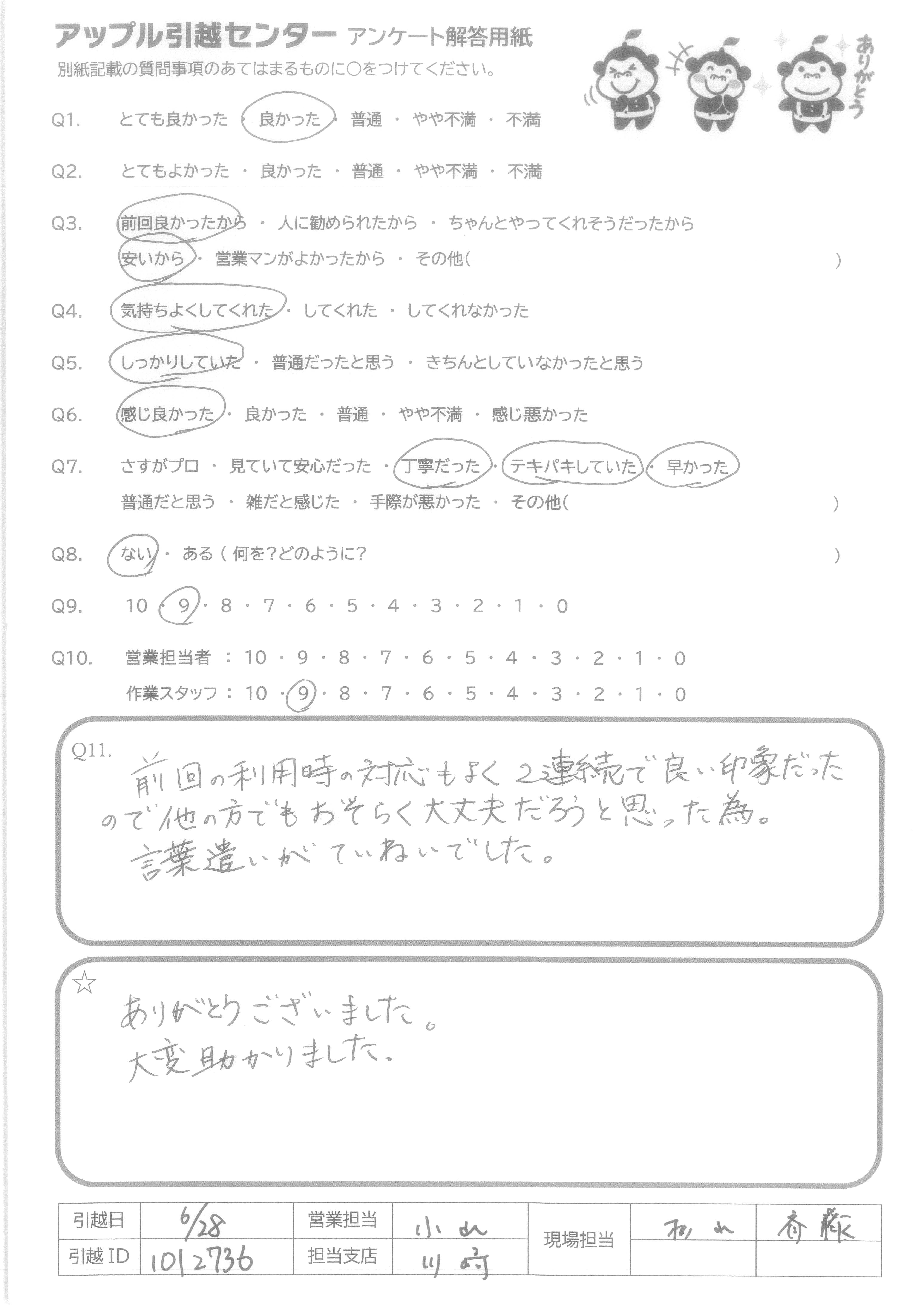 A.とても手際よく、笑顔で対応していただけて、大変気持ちよく引っ越しすることが出来ました。 家具や家電についてもちゃんと事前に内部破損についての説明もしてくださいましたし、安心してお任せできました。 暑い中で本当にありがとうございました。 また機会があれば是非お願いしたいと思います。