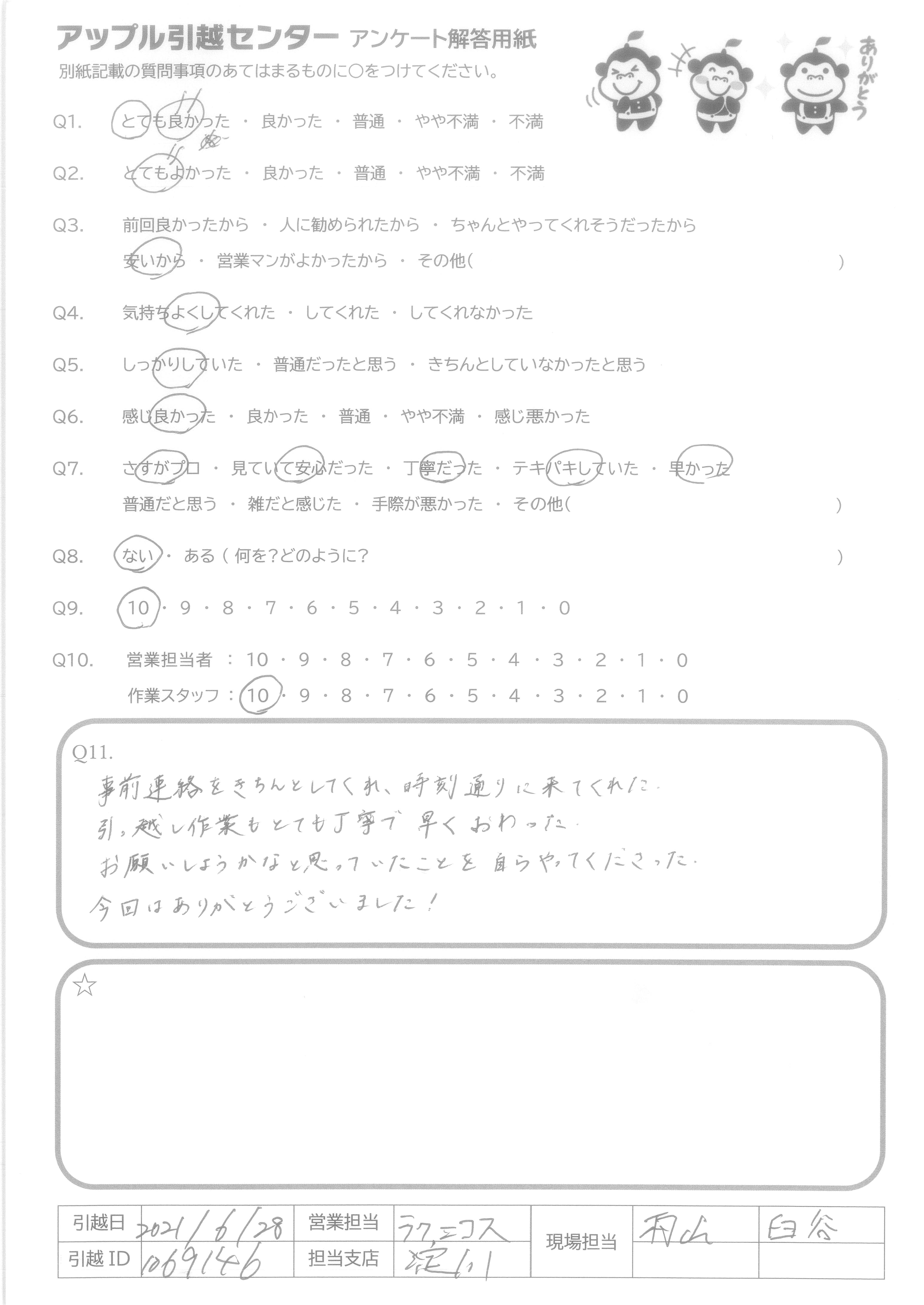 A.事前連絡をきちんとしてくれ、時刻通りに来てくれた。 引っ越し作業もとても丁寧で早くおわった。 お願いしようかなと思っていたことを自らやってくださった。 今回はありがとうございました!