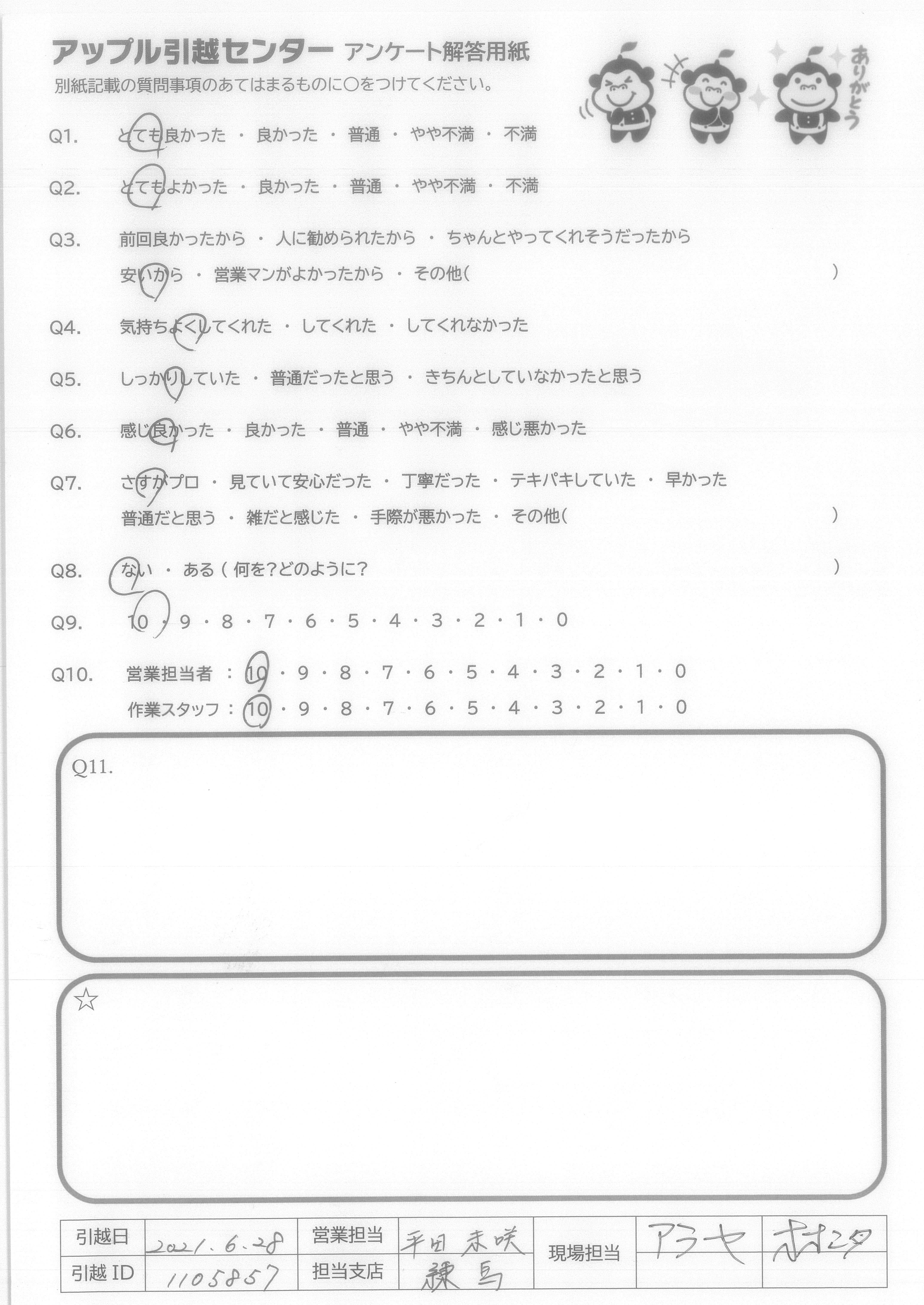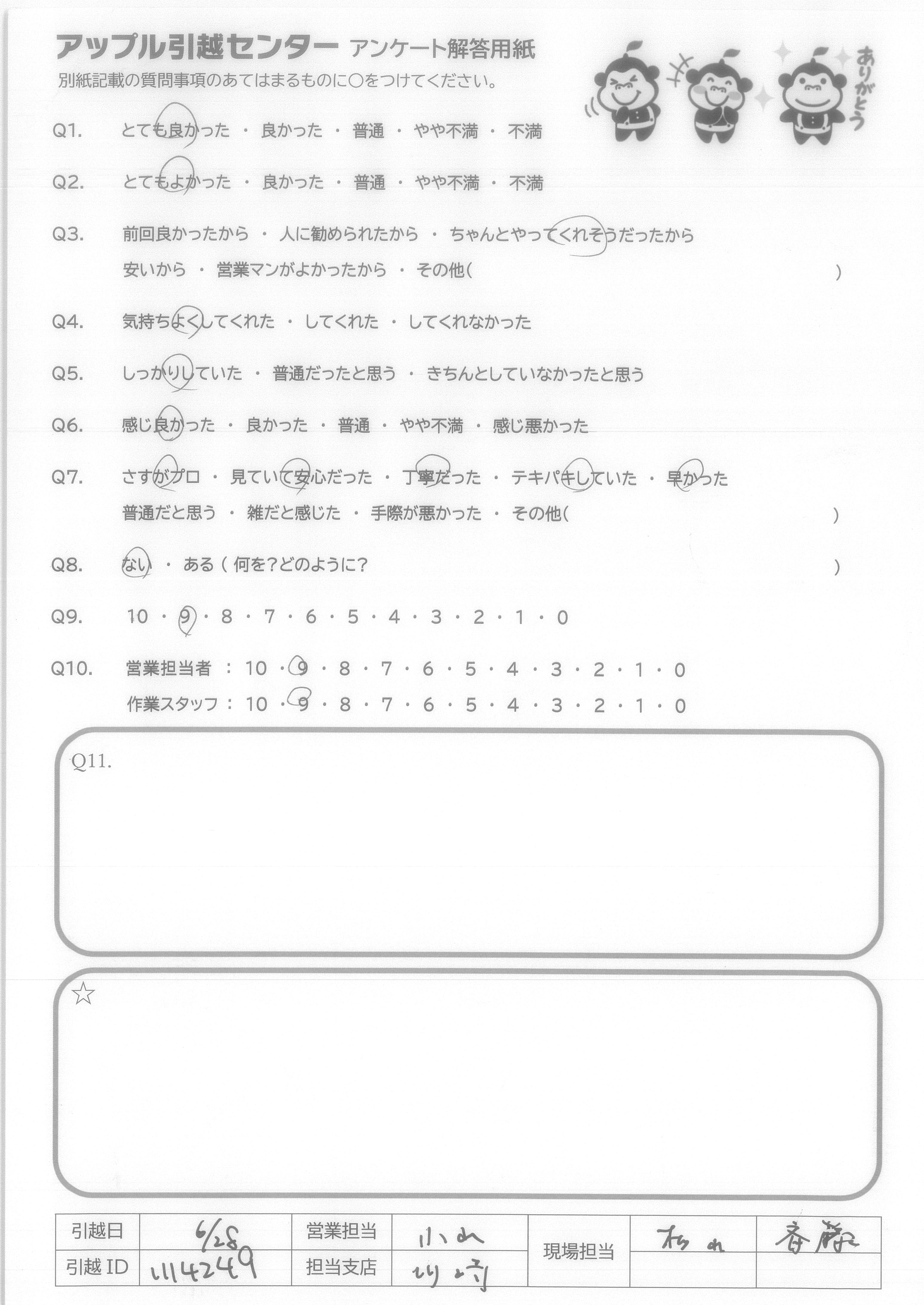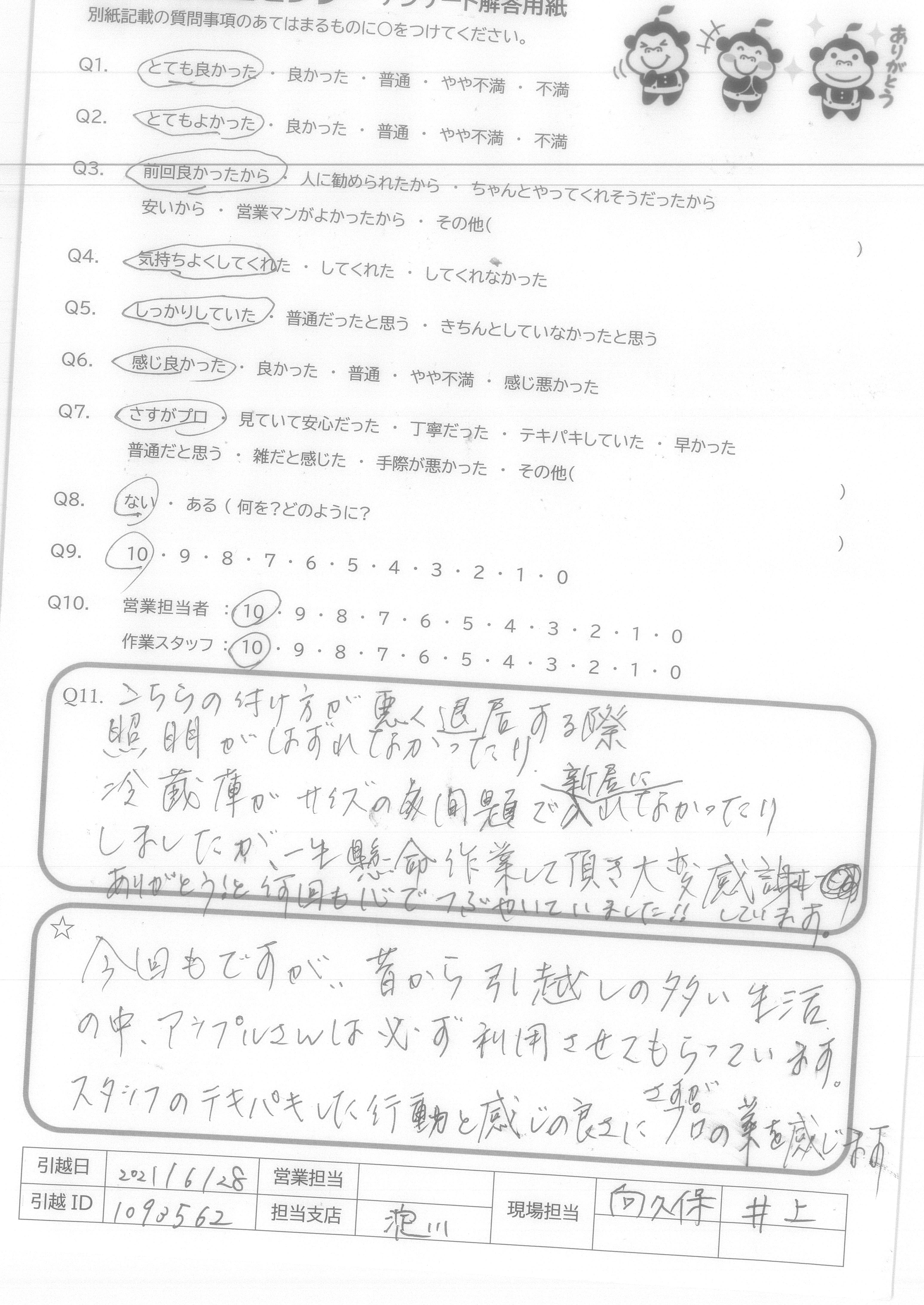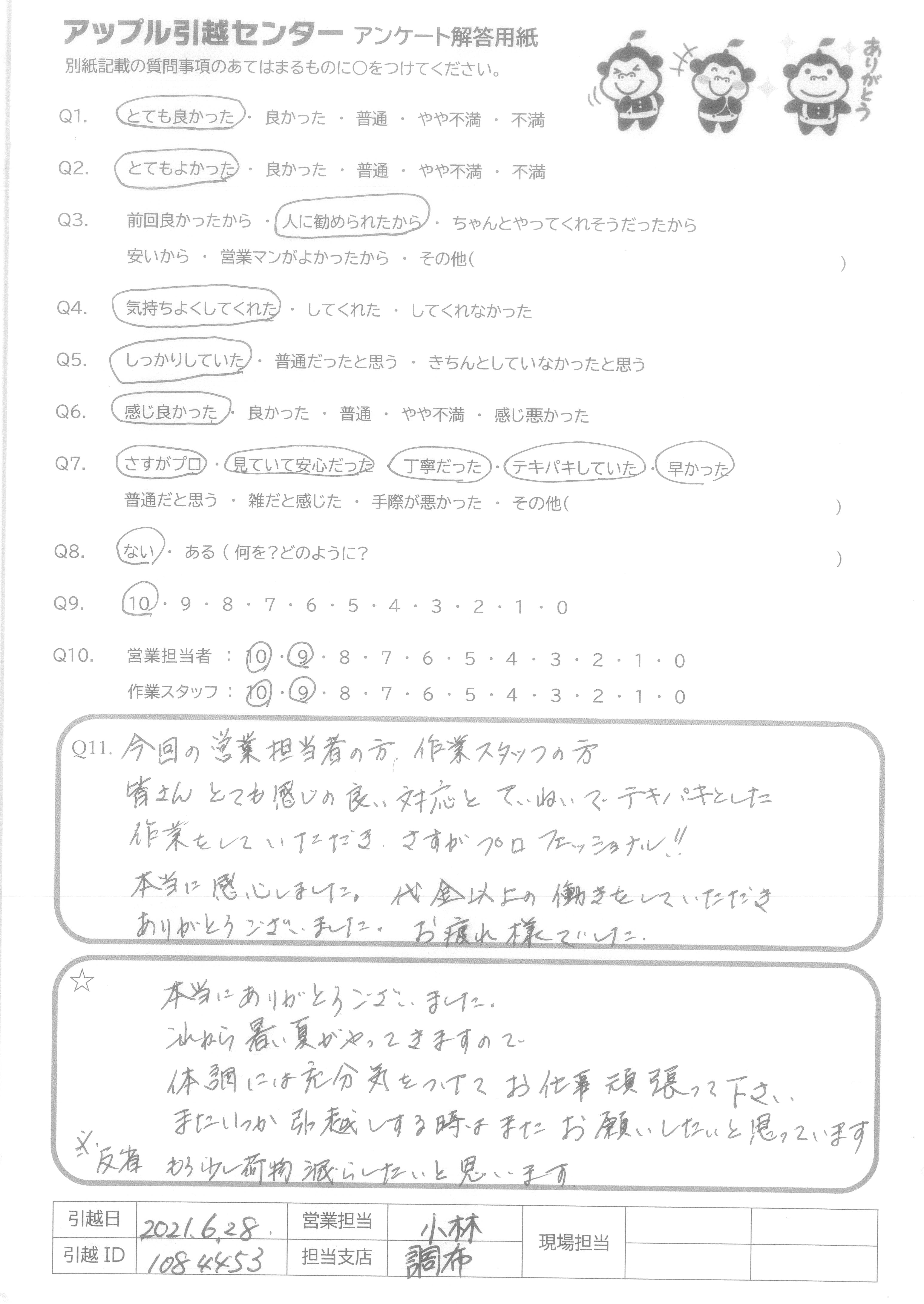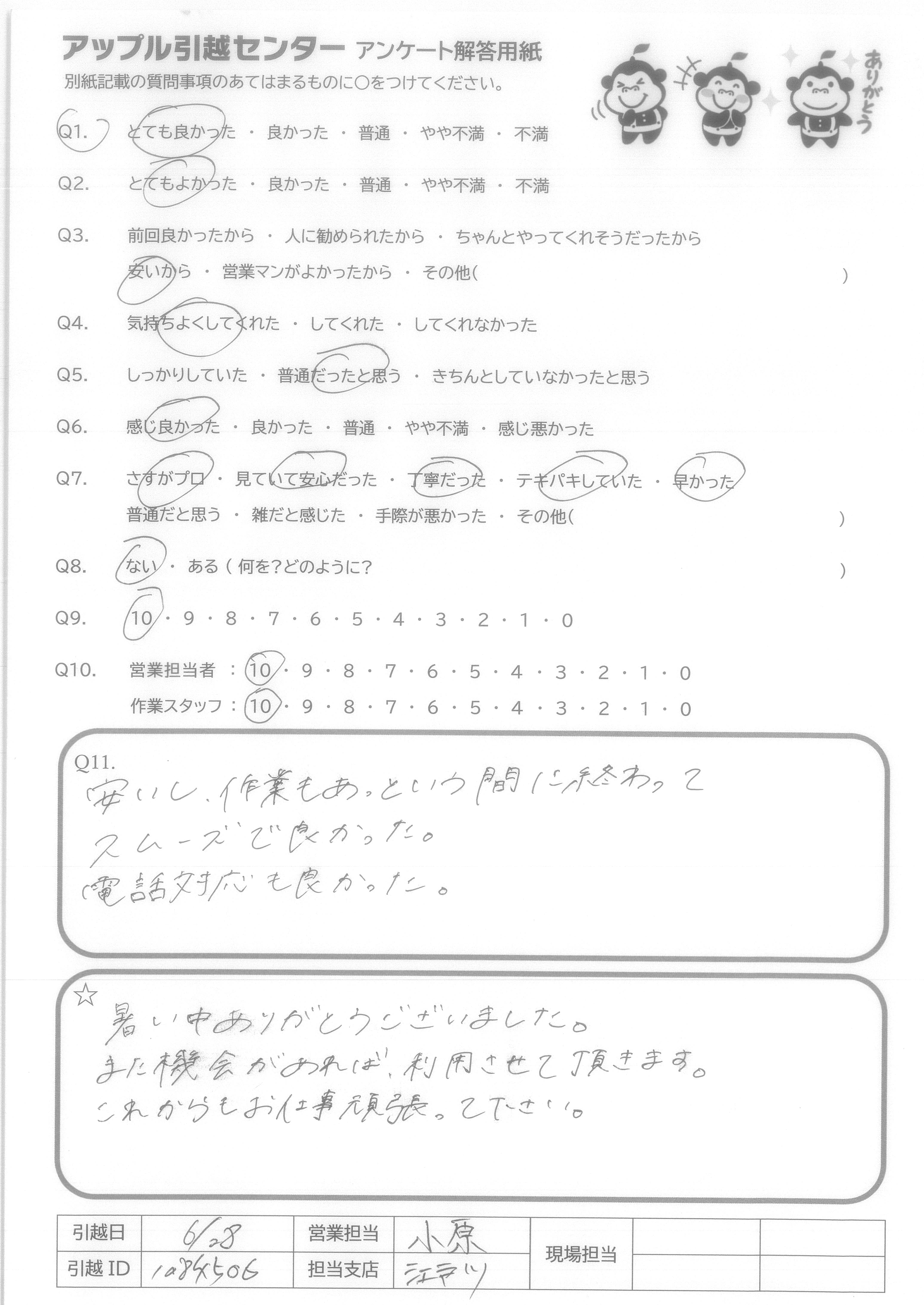 A.本当にありがとうございました。 これから暑い夏がやってきますので 体調には充分気をつけてお仕事頑張って下さい。 またいつか引っ越しする時はまたお願いしたいと思っています。 ※反省 もう少し荷物減らしたいと思います