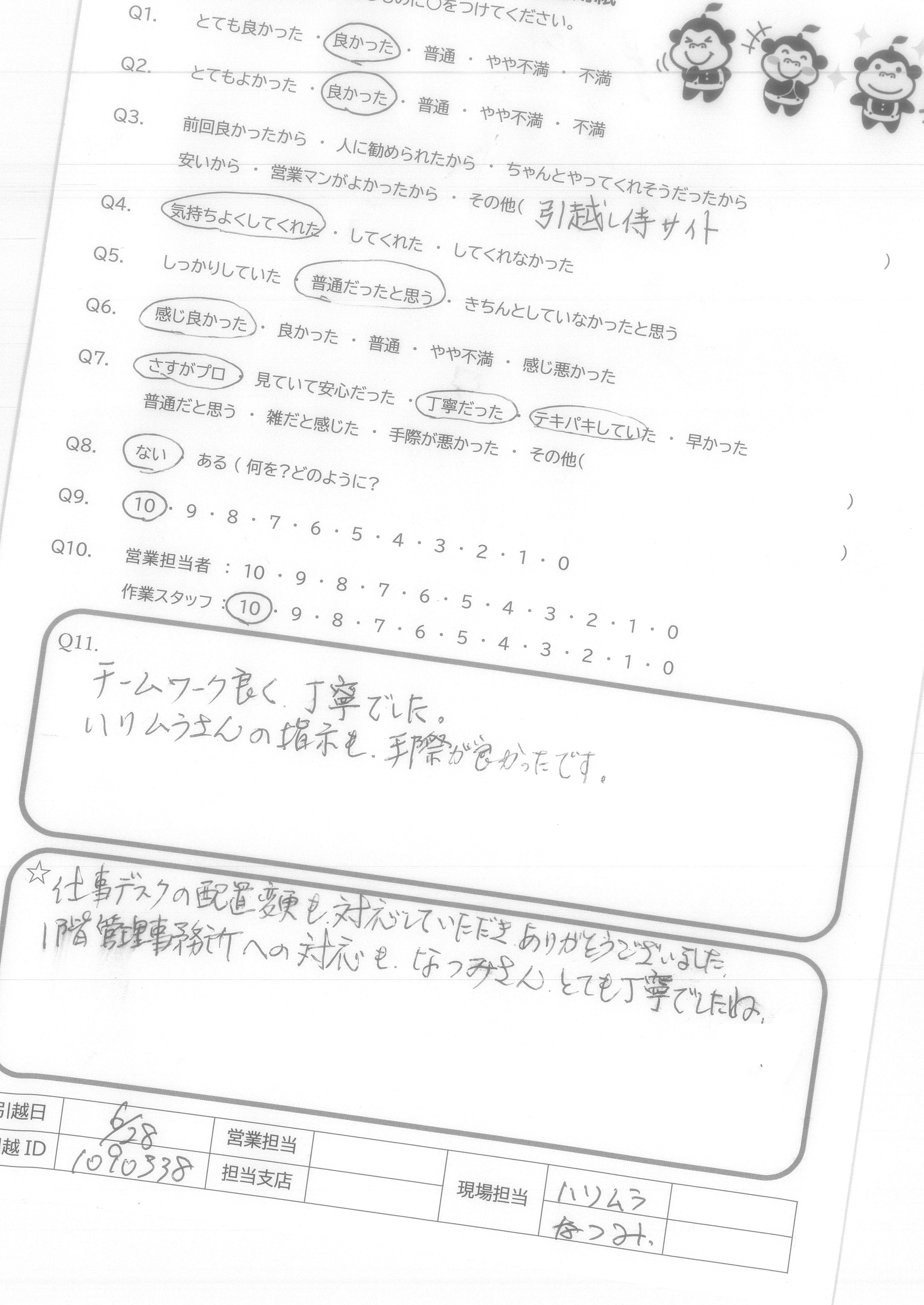 A.仕事デスクの配置変更も対応していただき、ありがとうございました。 1階管理事務所への対応もなつみさん、とても丁寧でしたね。