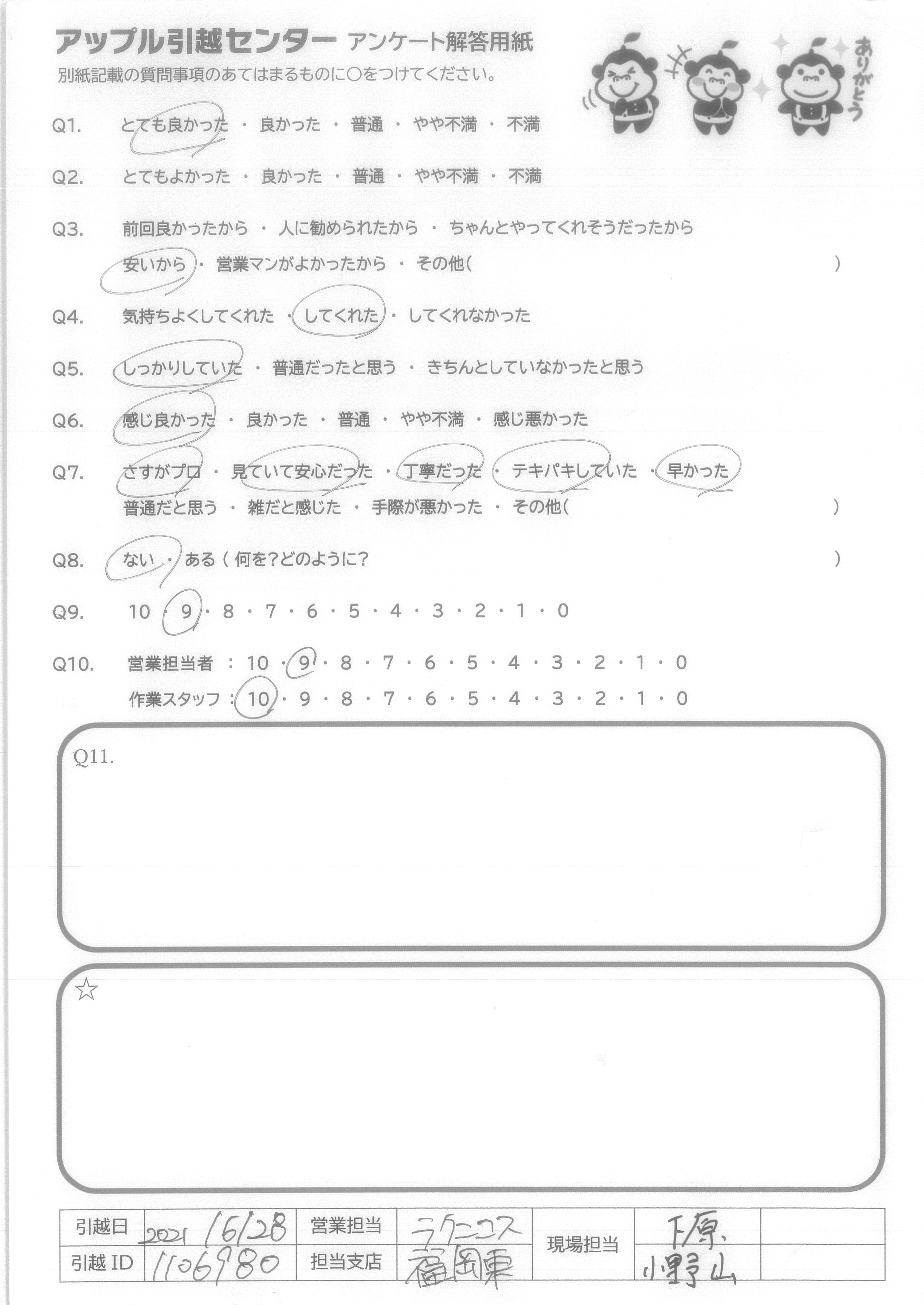 A.作業スタッフさんの感じがとても良く、かつ対応が素早かった。 とても感謝しています。また次の機会にもお願いしたい。