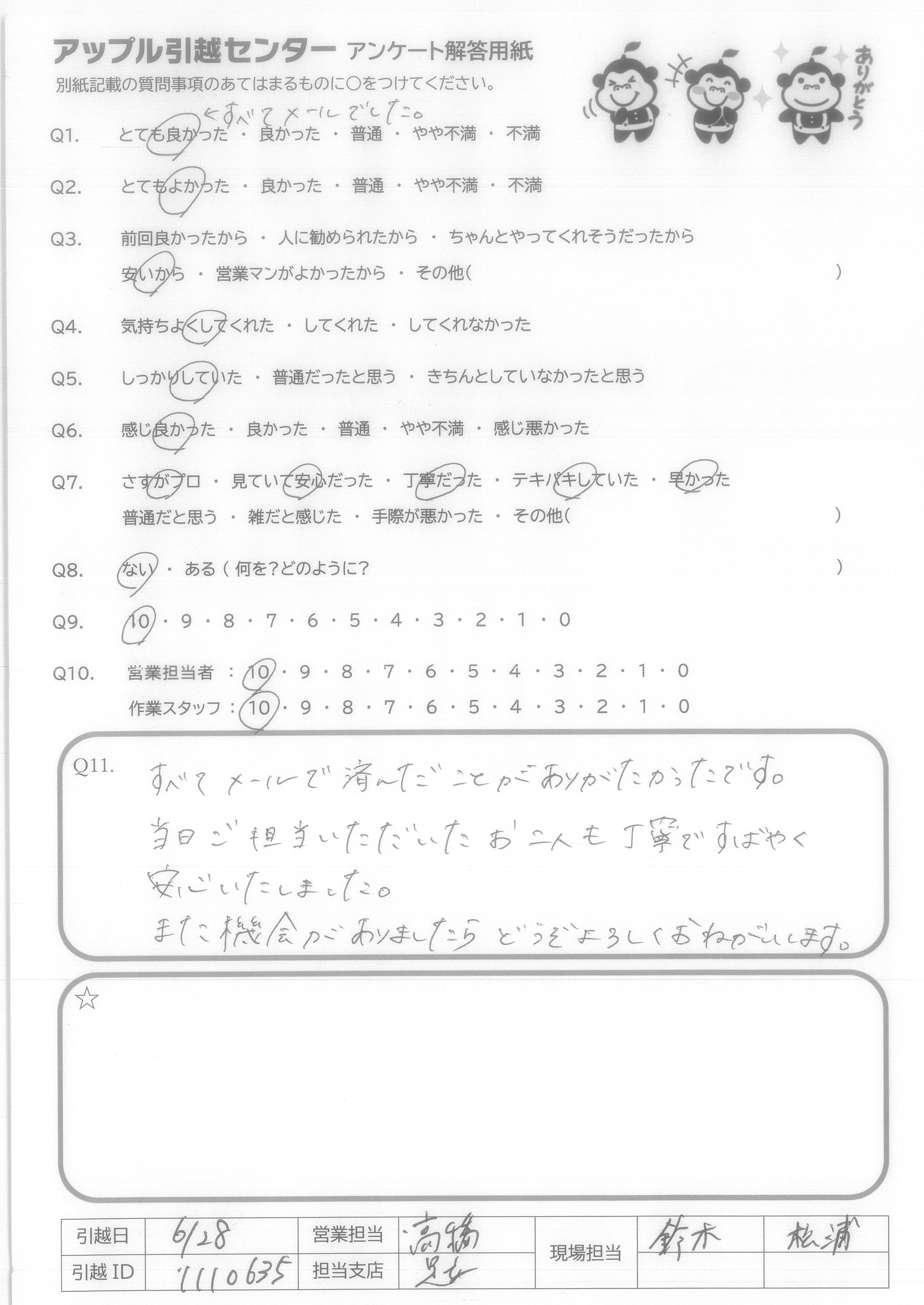 A.すべてメールで済んだことがありがたかったです。 当日ご担当いただいたお二人も丁寧ですばやく安心いたしました。 また機会がありましたらどうぞよろしくおねがいします。