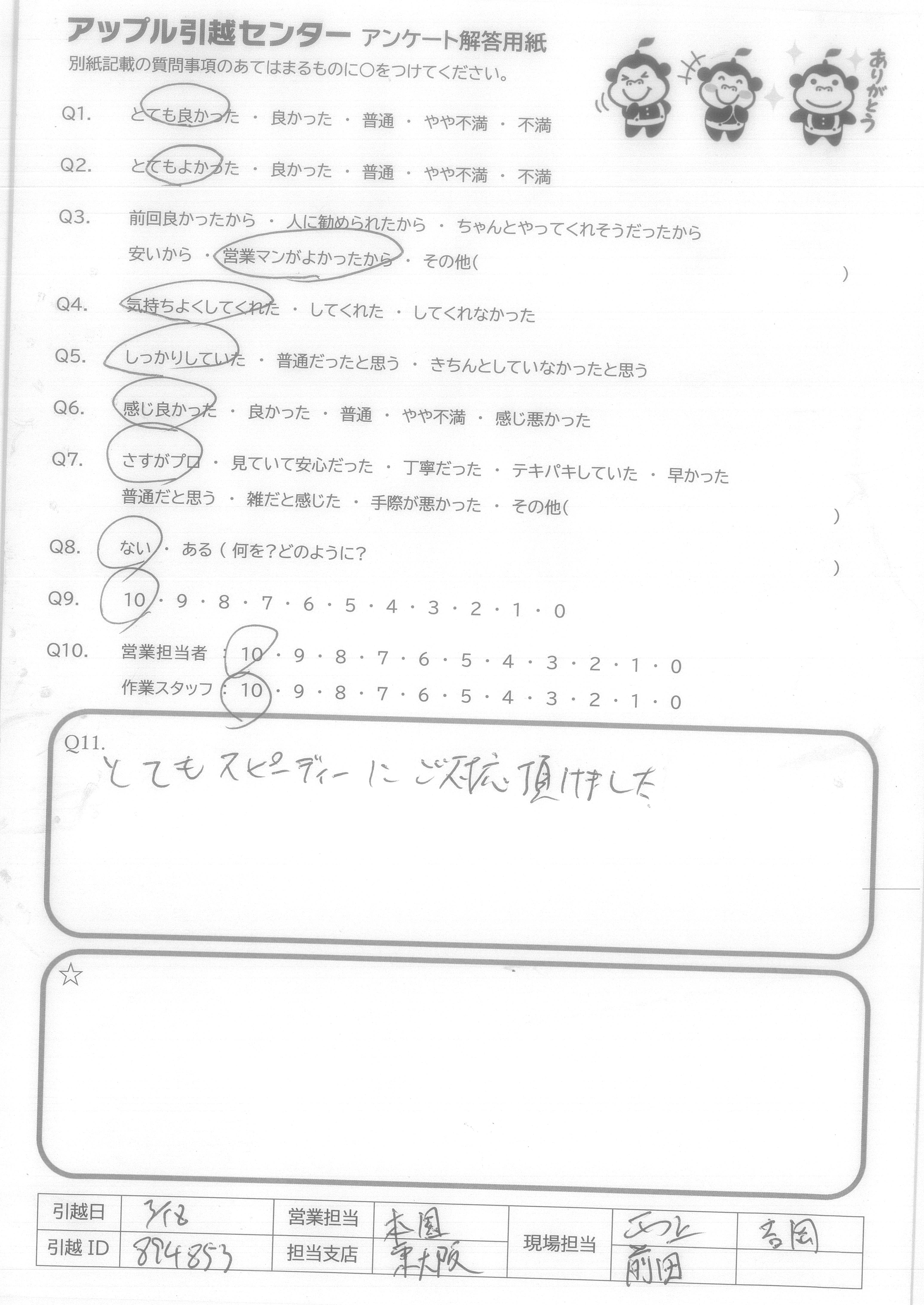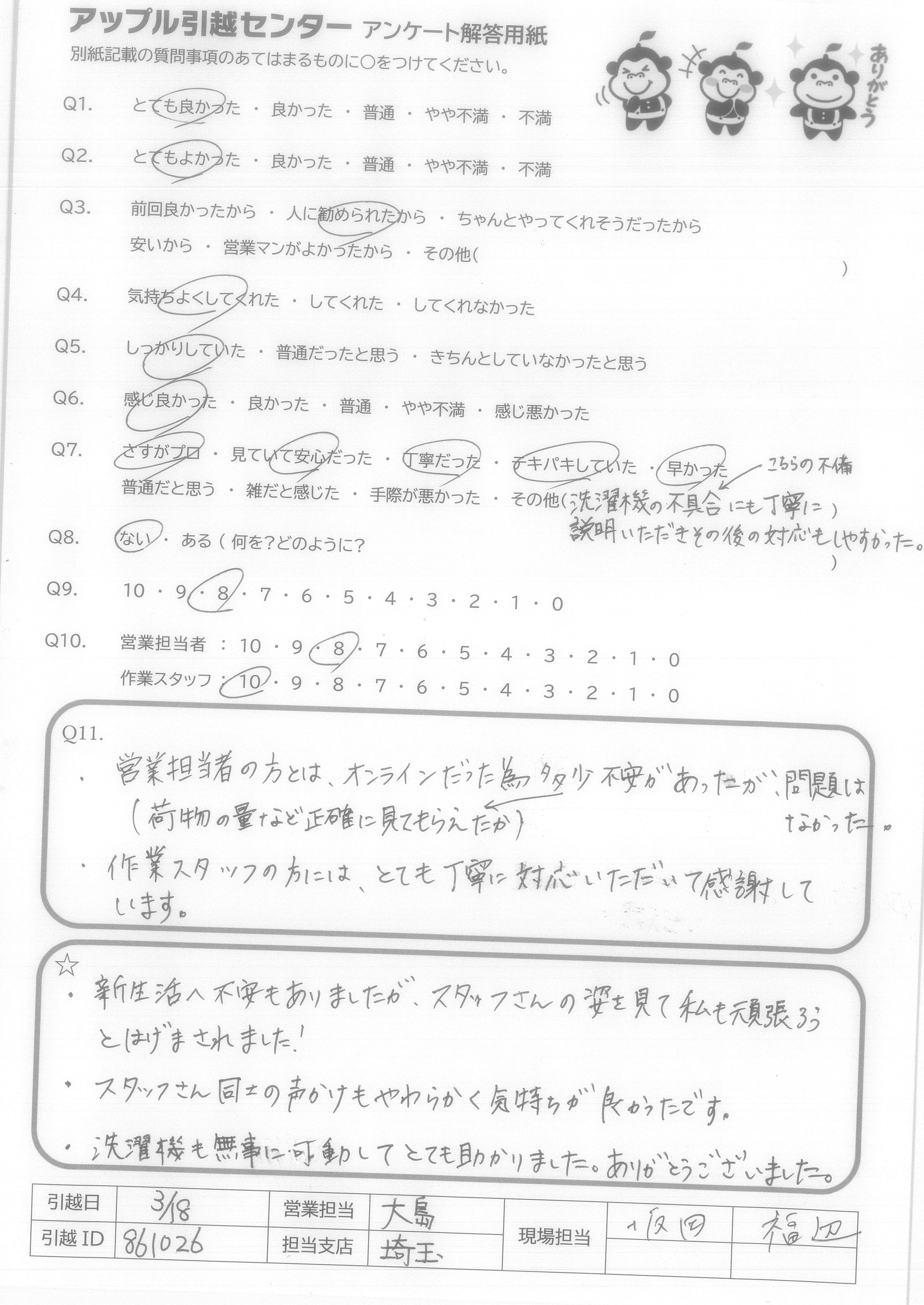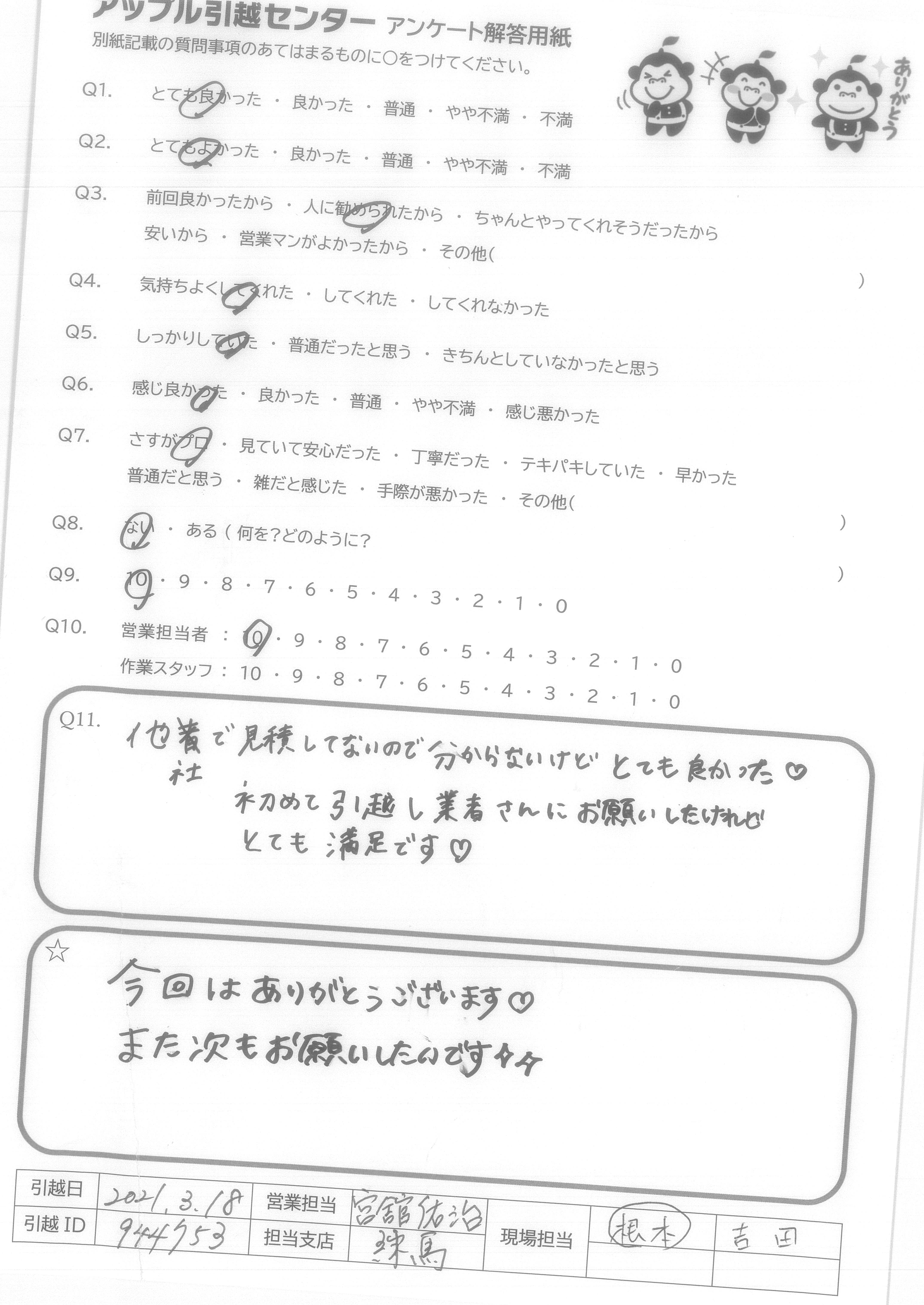 A.今回はありがとうございました。 安心して引っ越しをする事ができました。 作業もテキパキしていて、とても観ていて安心して任せる事ができました。 他社がかなり料金が高く、決めかねていたところ、アップル引越しセンターさんをネットで見かけ、料金も他社よりも安いのでお願いしましたが、値段以上の対応をしていただきました。 また引越しをする際は、ぜひお願いしたいです。