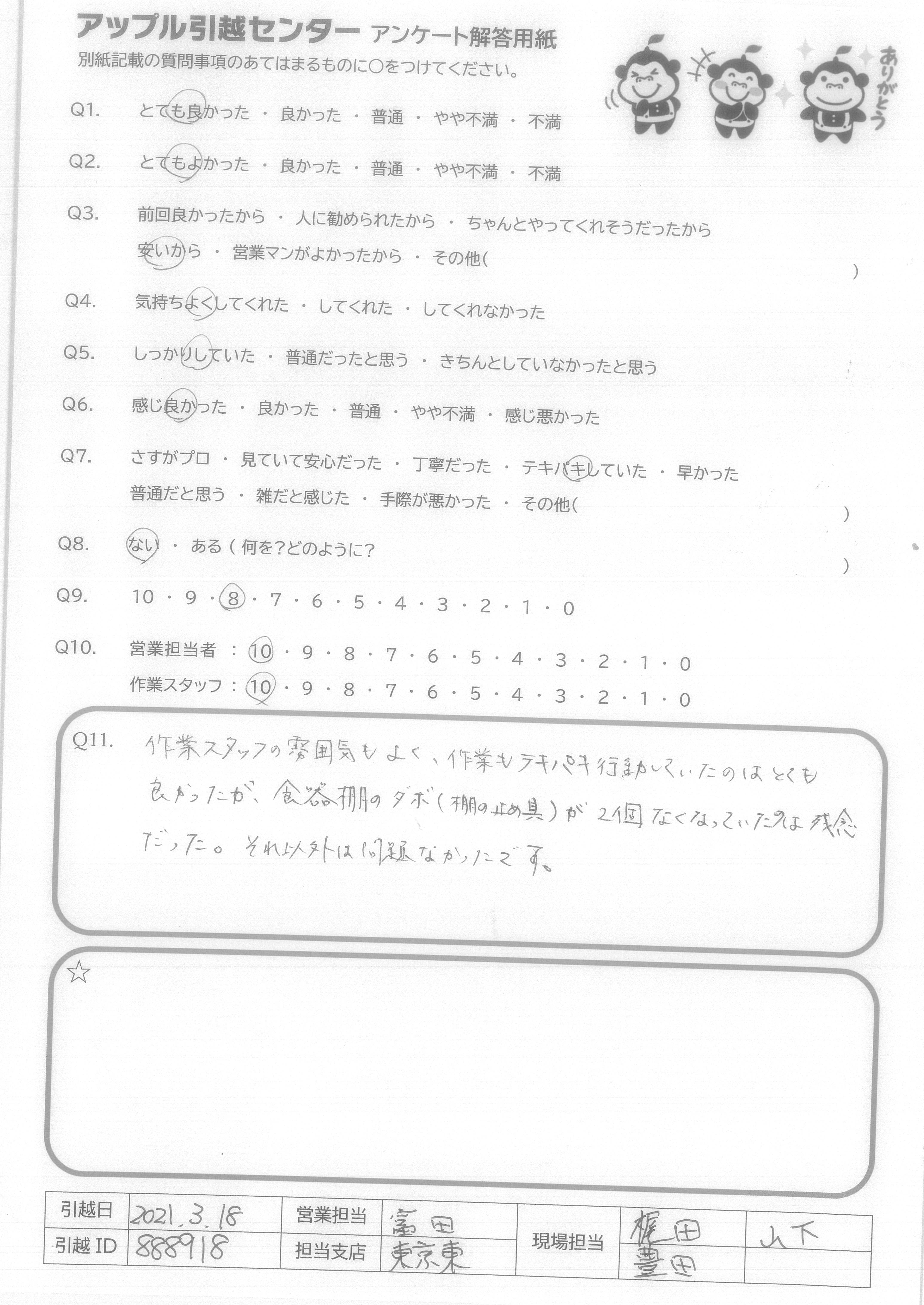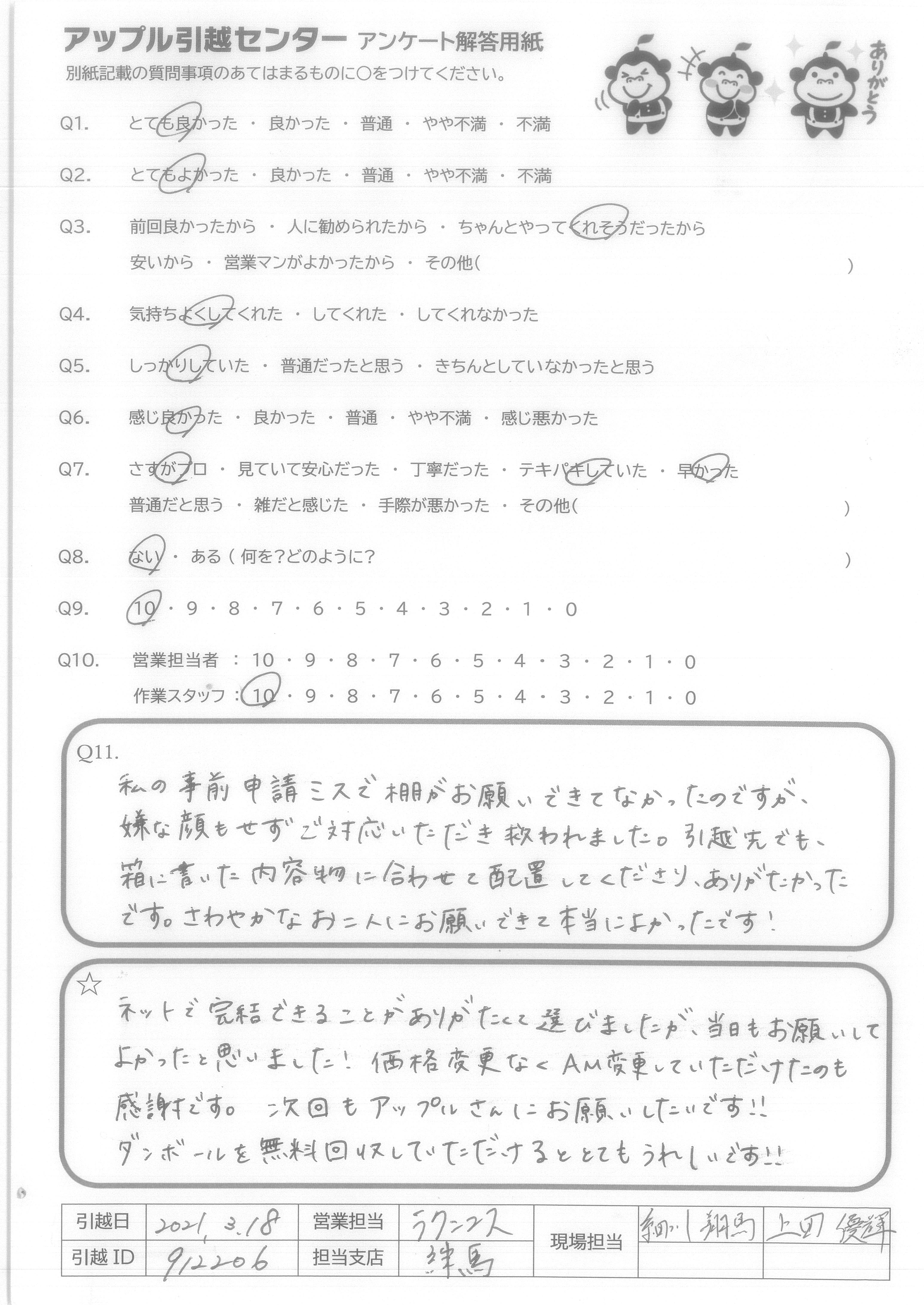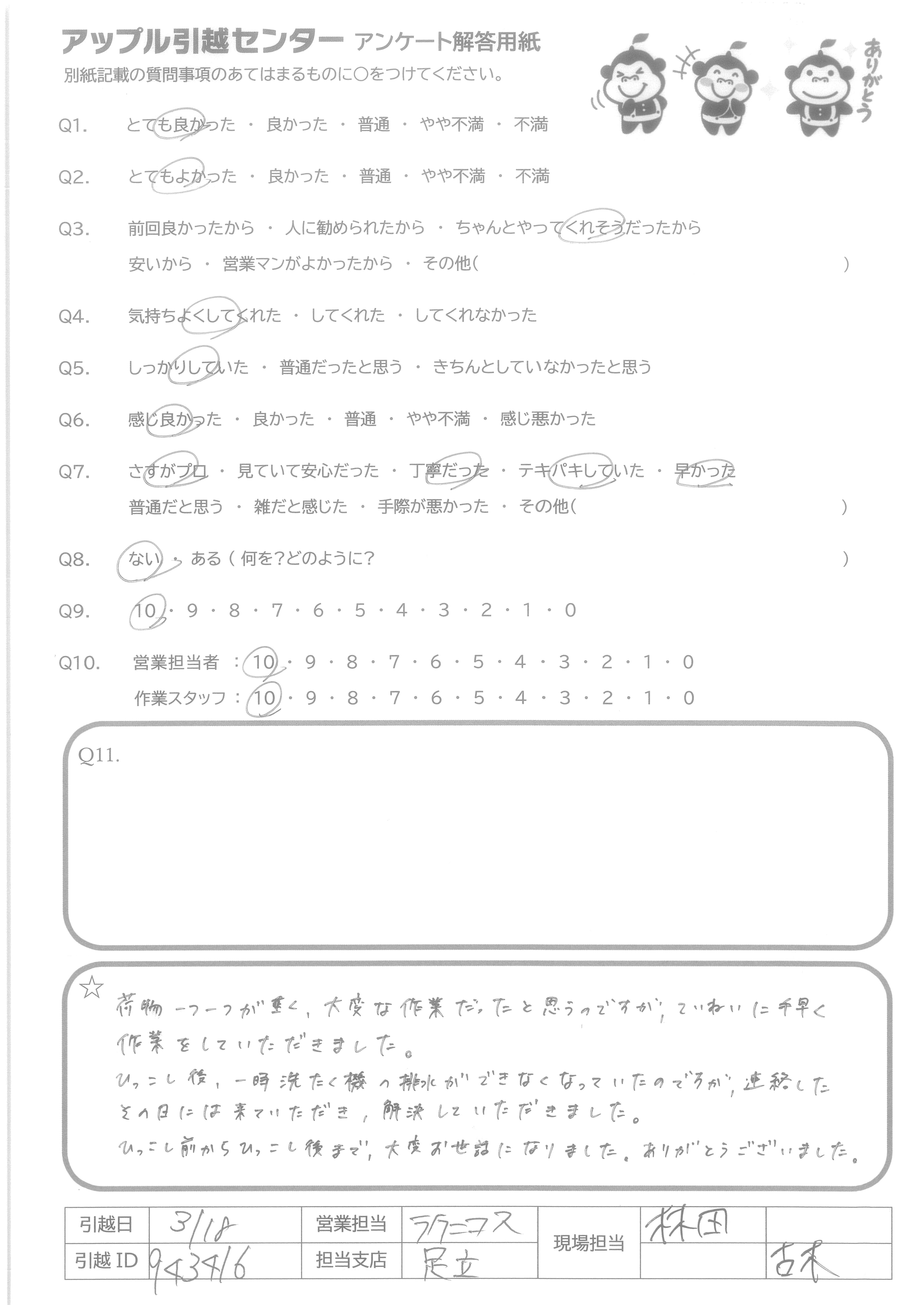 A.安いので品質が心配でしたが、みつもりから当日作業まで担当していただいた中村さんが、質問にもていねいに答えて下さり、作業もとてもていねいで安心しました。他の作業員の方も感じよく、いっしょうけんめいはこんでくれました。コールセンターのタケザワさんもとても親切に対応してくれました。引越はもう6回もしていますが、アップルさんが一番、