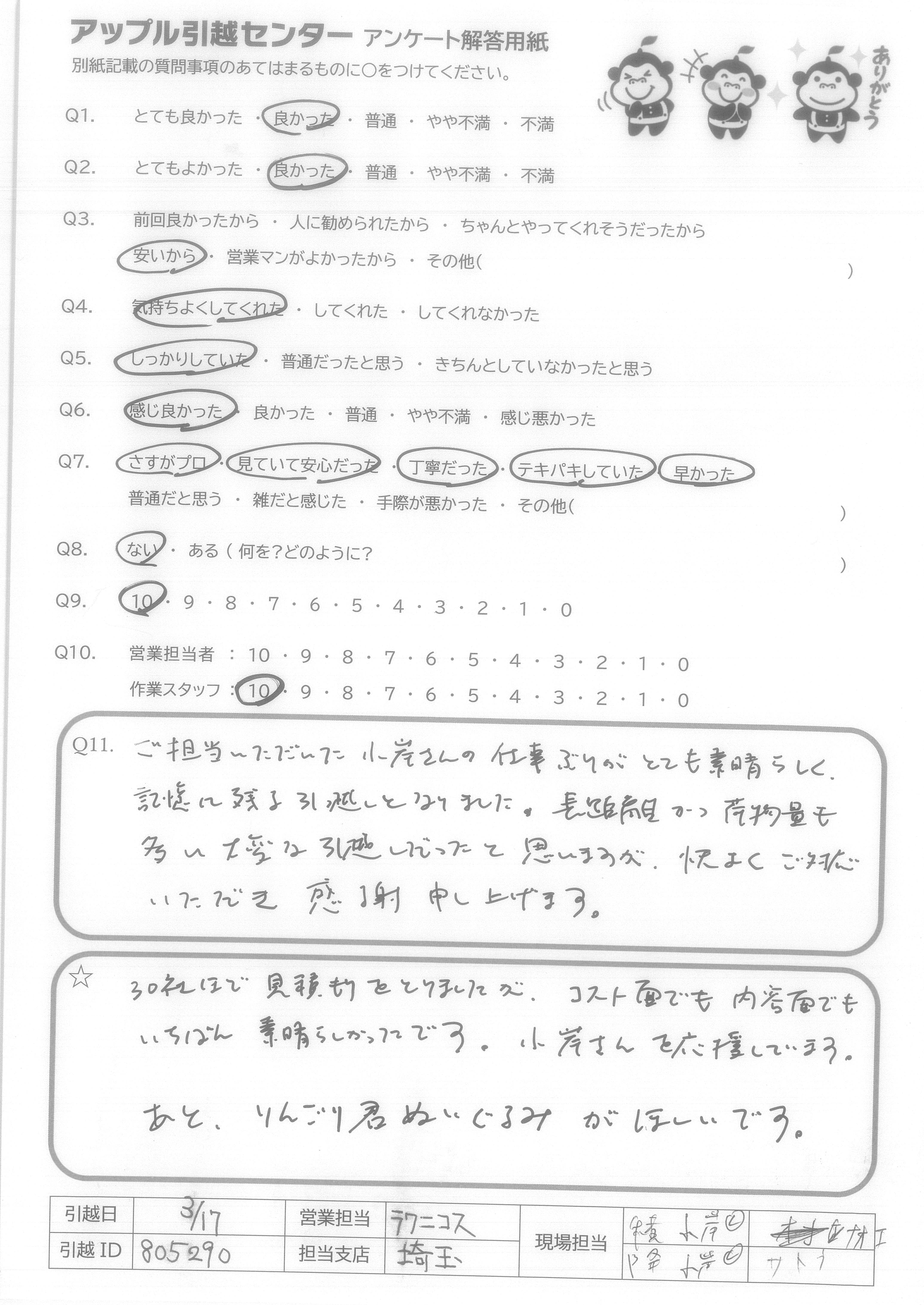 A.ご担当いただいた小岸さんの仕事ぶりがとても素晴らしく、記憶に残る引っ越しとなりました。長距離かつ荷物量も多い大変な引越しだったと思いますが、快くご対応いただき感謝申し上げます。