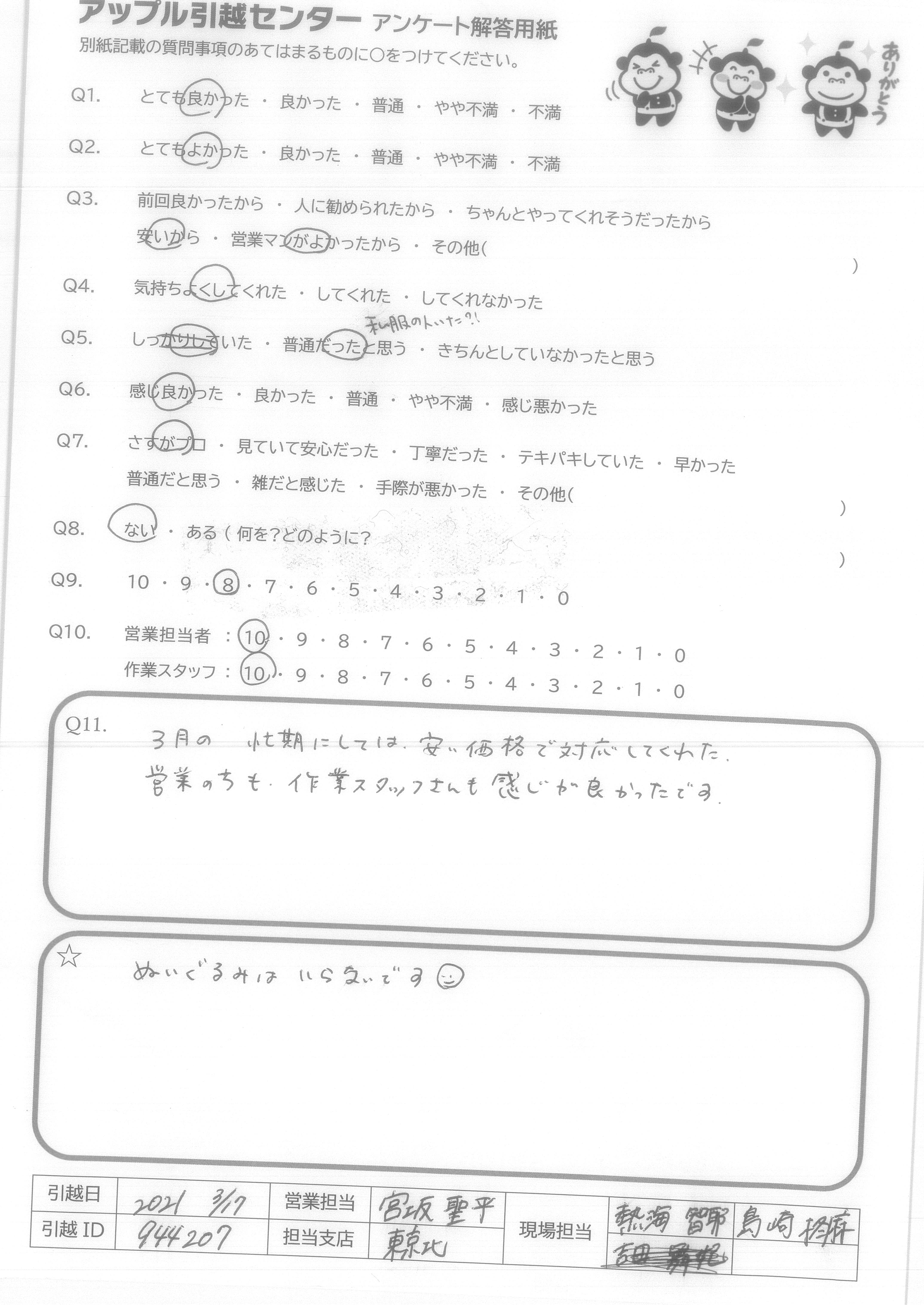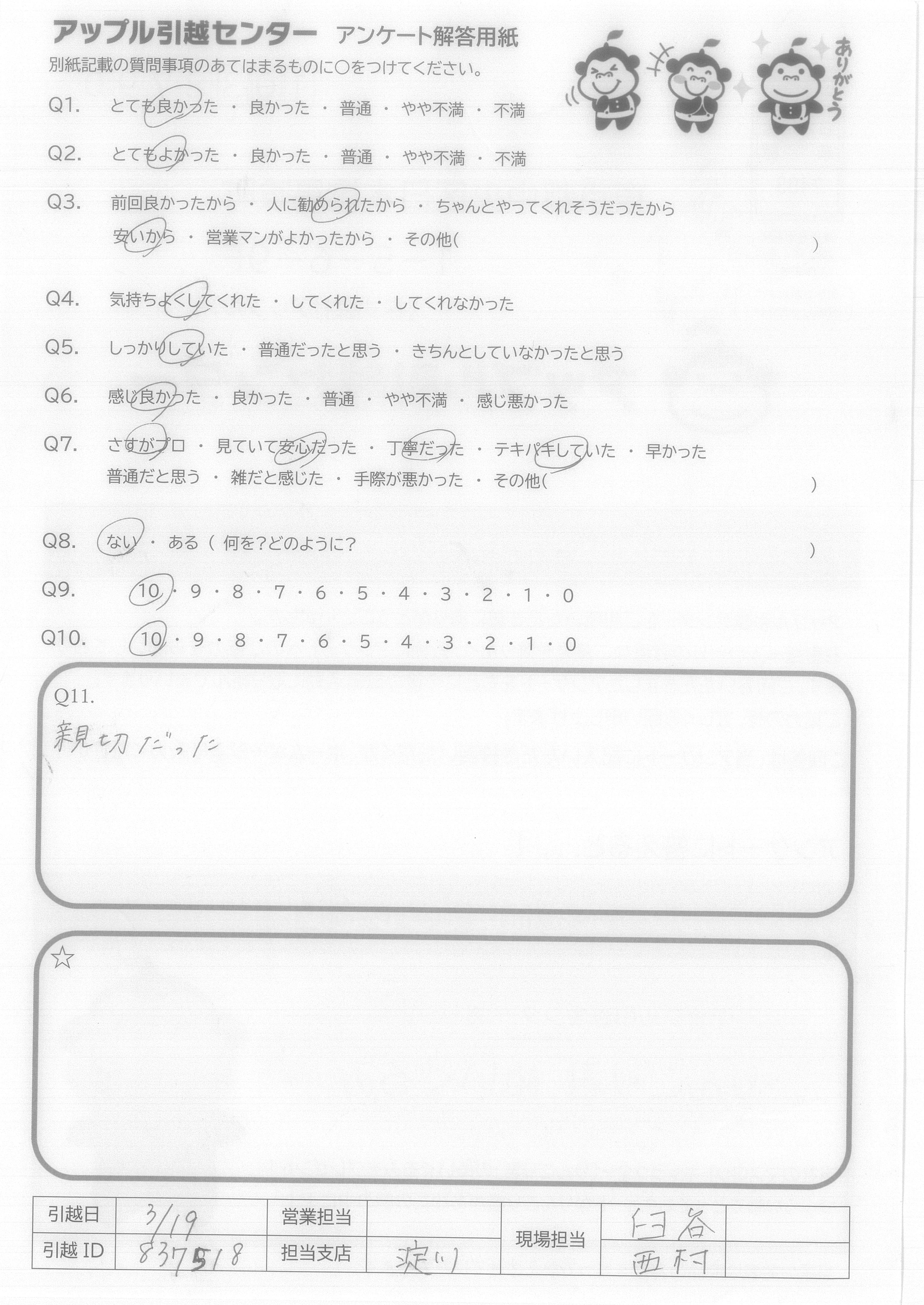 A.3月の忙期にしては、安い価格で対応してくれた。 営業の方も、作業スタッフさんも感じが良かったです。