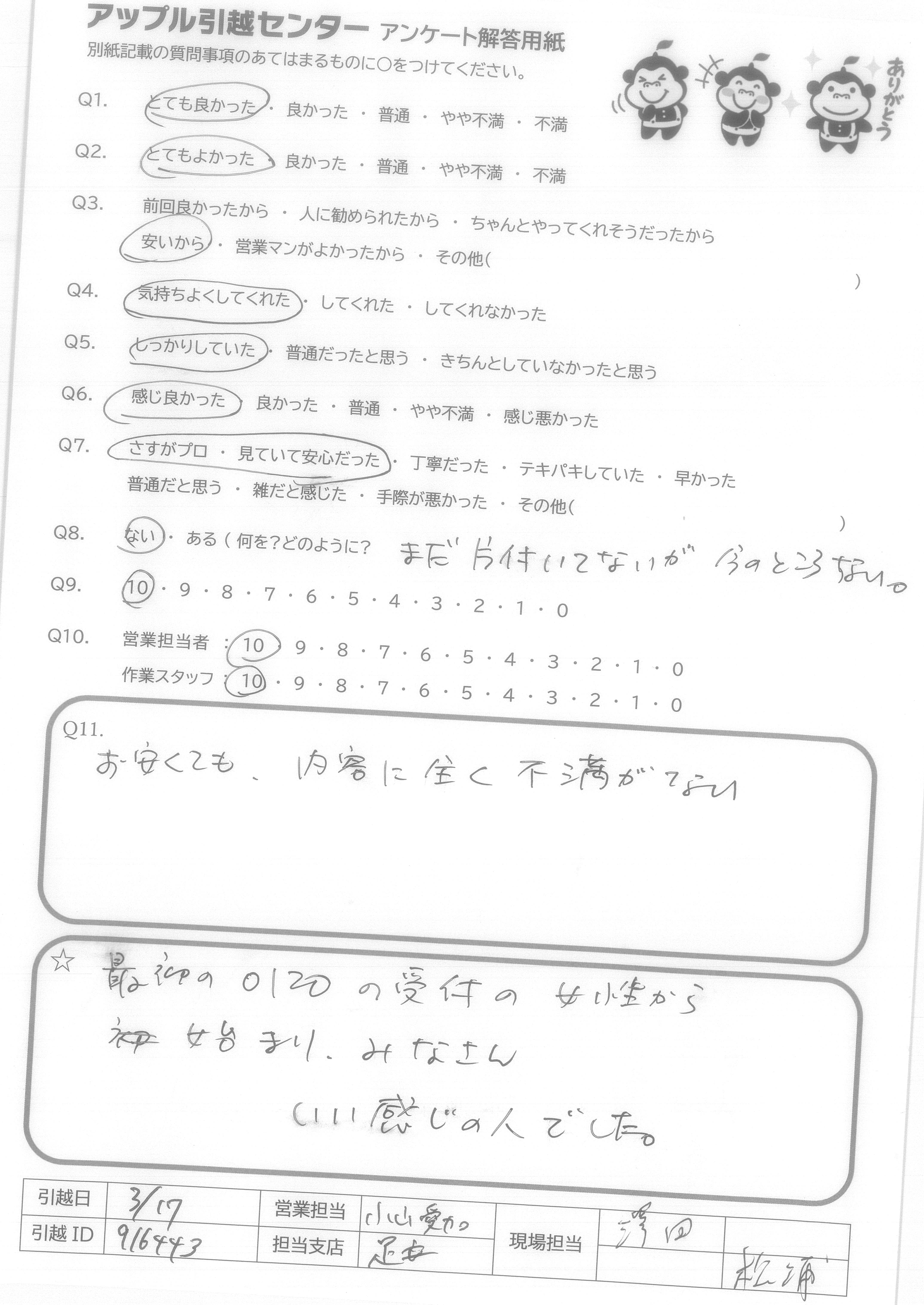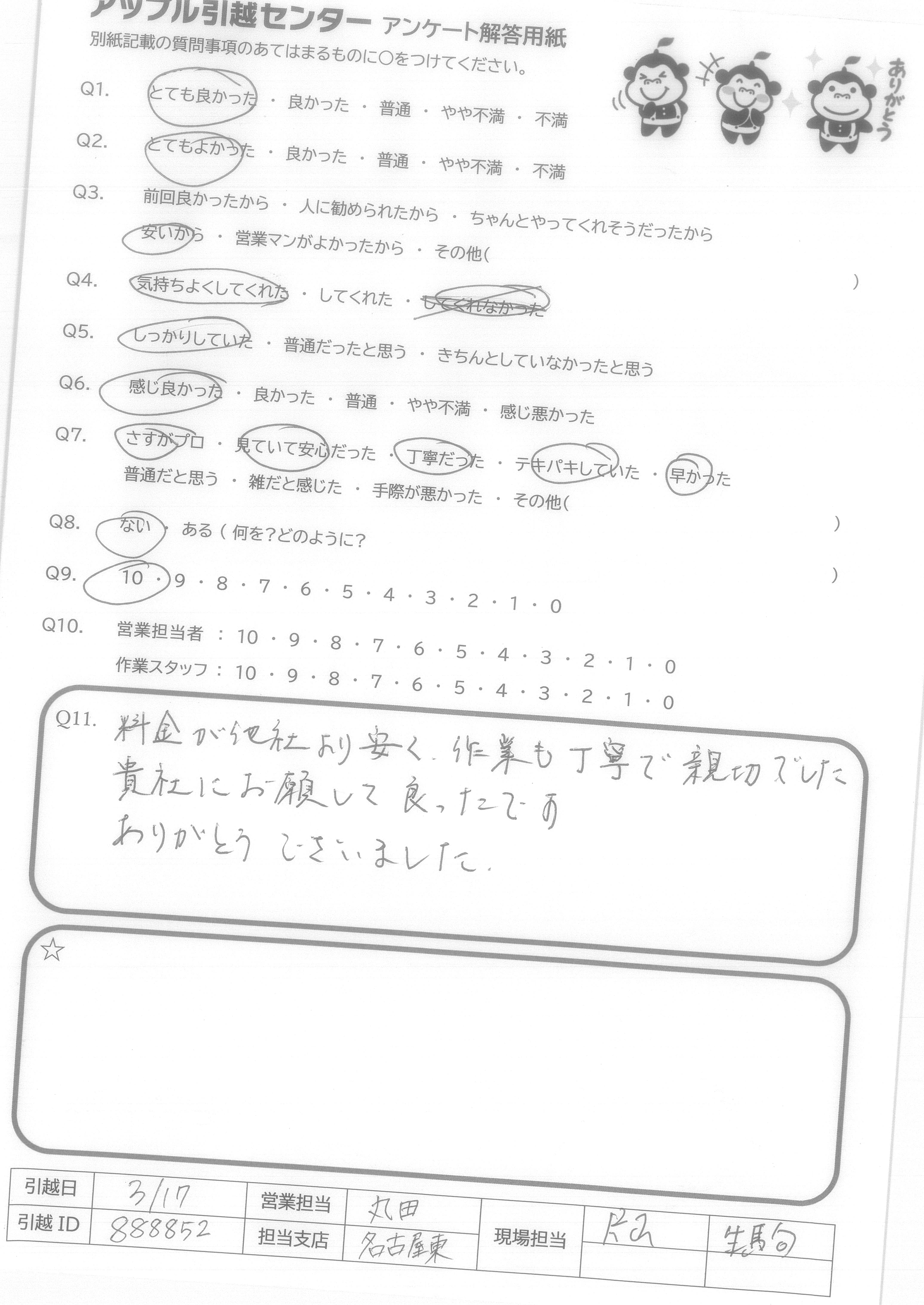 A.他社に比べ、金額も、とても安くて満足です。(他社から変更しました!!) 私は、引越元で対応していただきましたが、引越先で荷物を受け取った、祖母も、とても対応が良く、スタッフさんがすばらしい!!と話していました。 大変、お世話になりました。ありがとうございました。