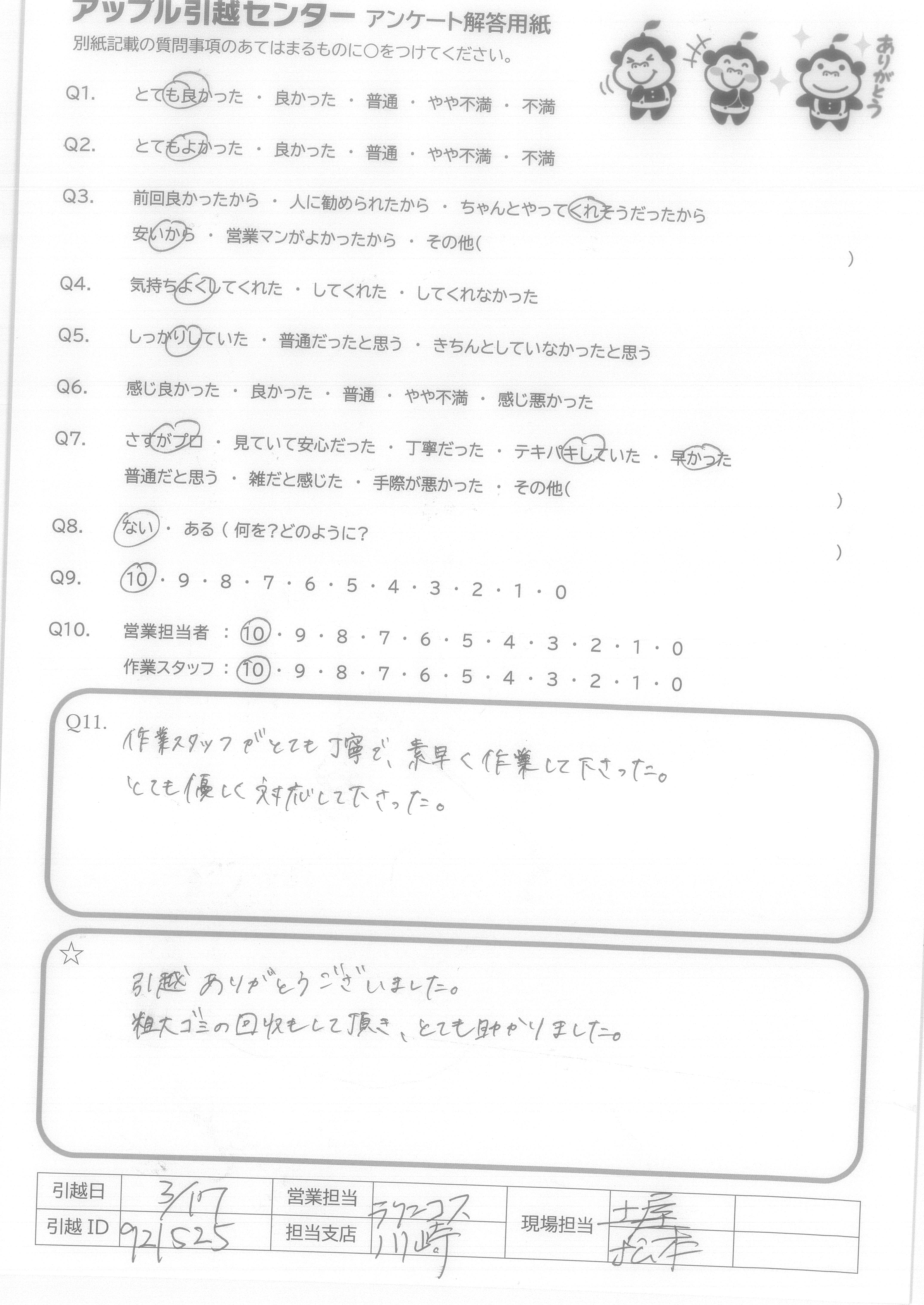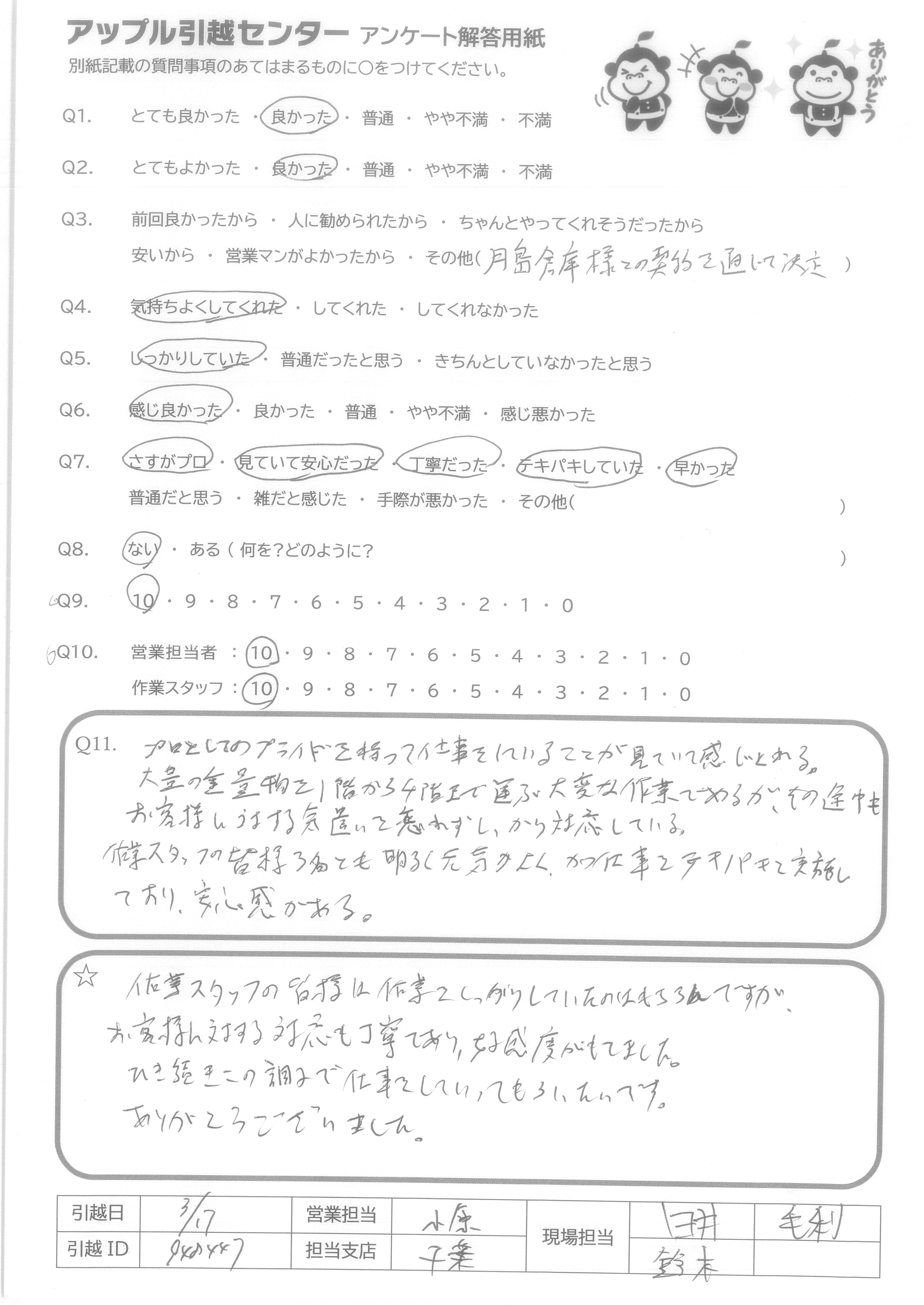 A.作業スタッフの皆様は作業をしっかりしていたのはもちろんですが、お客様に対する対応も丁寧であり、好感度がもてました。ひき続きこの調子で仕事をしていってもらいたいです。 ありがとうございました。