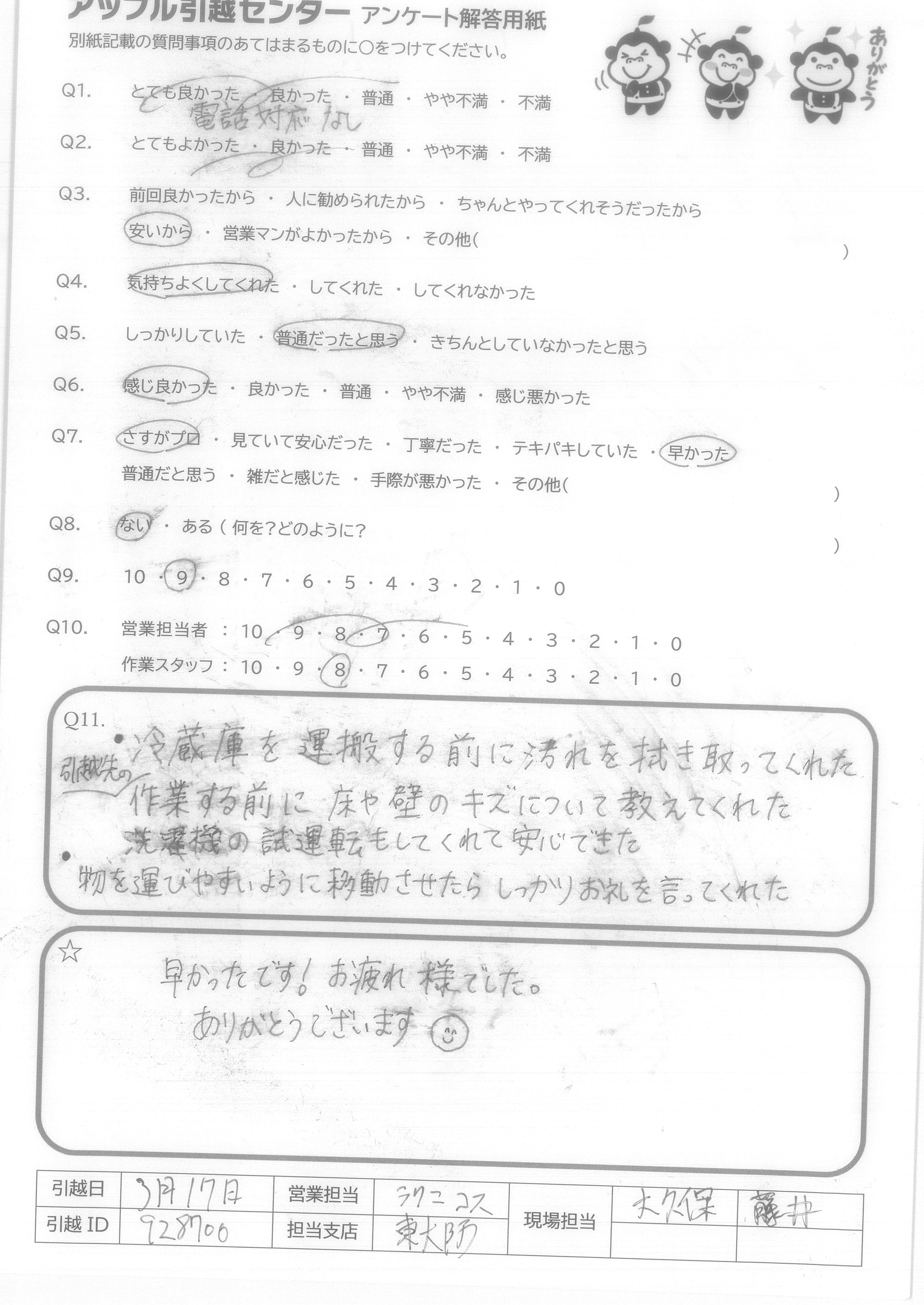 A.営業の河村さんは、親身になって引越しの相談に乗っていただいたものの、こちらの引越しの条件(日つけなど)を勘違いしていたり、連絡がなかったりなど、対応に若干問題がありました。