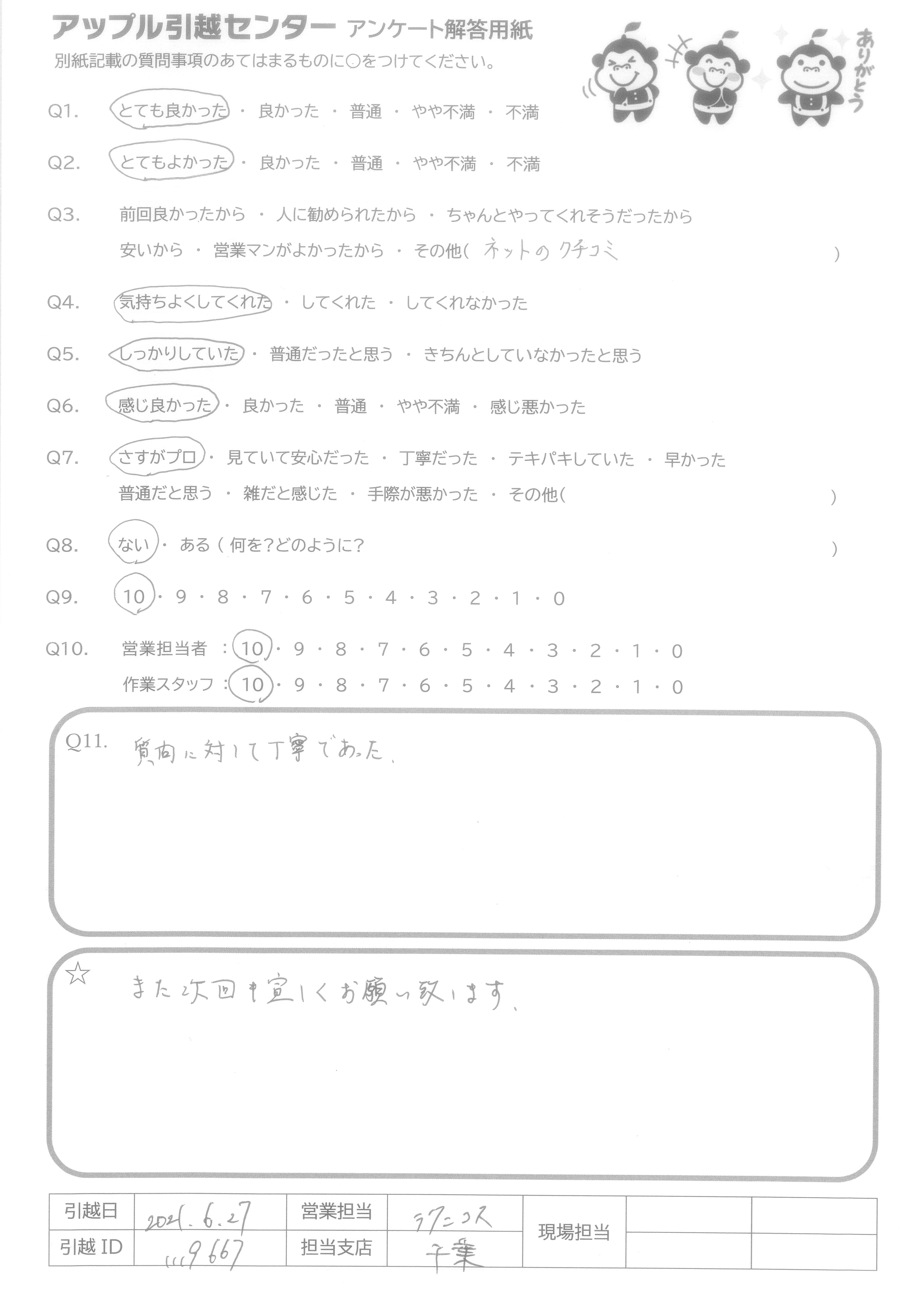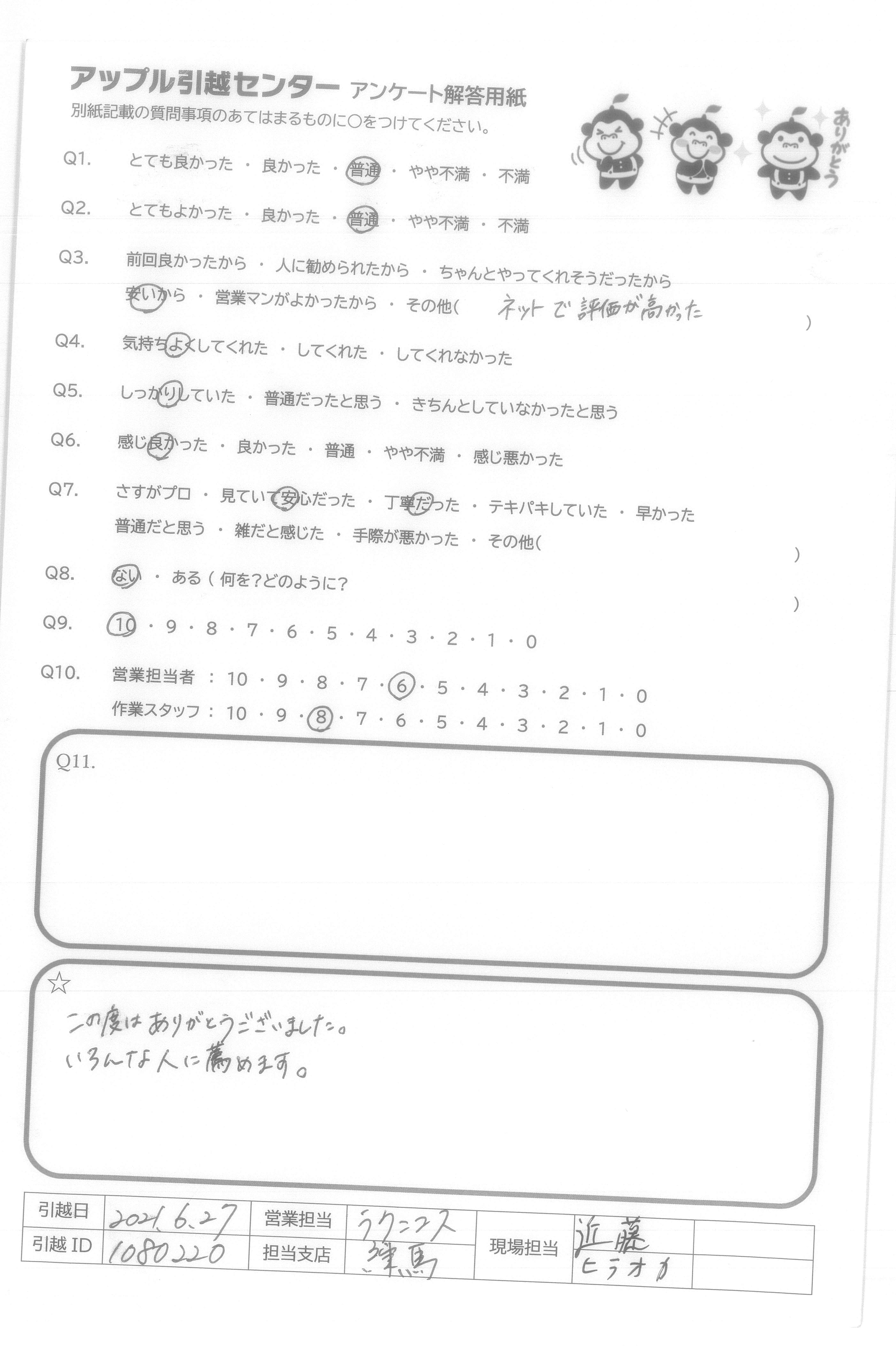 A.御社については、今後大いに期待しています。不要品の回収サービスを広範囲ですし、HP上で細かく引越し情報を入力すれば、申込と料金計算できるのは私にとって非常に良いサービスで、他社とは一線を画すと思います。今後も御社を引越し時利用したいと思いますので、御社にはさらなる会社発展を成し遂げていただき、引越し業界のNo1になってください。また、発展に伴い、新たな他社には良いサービスを期待しております。