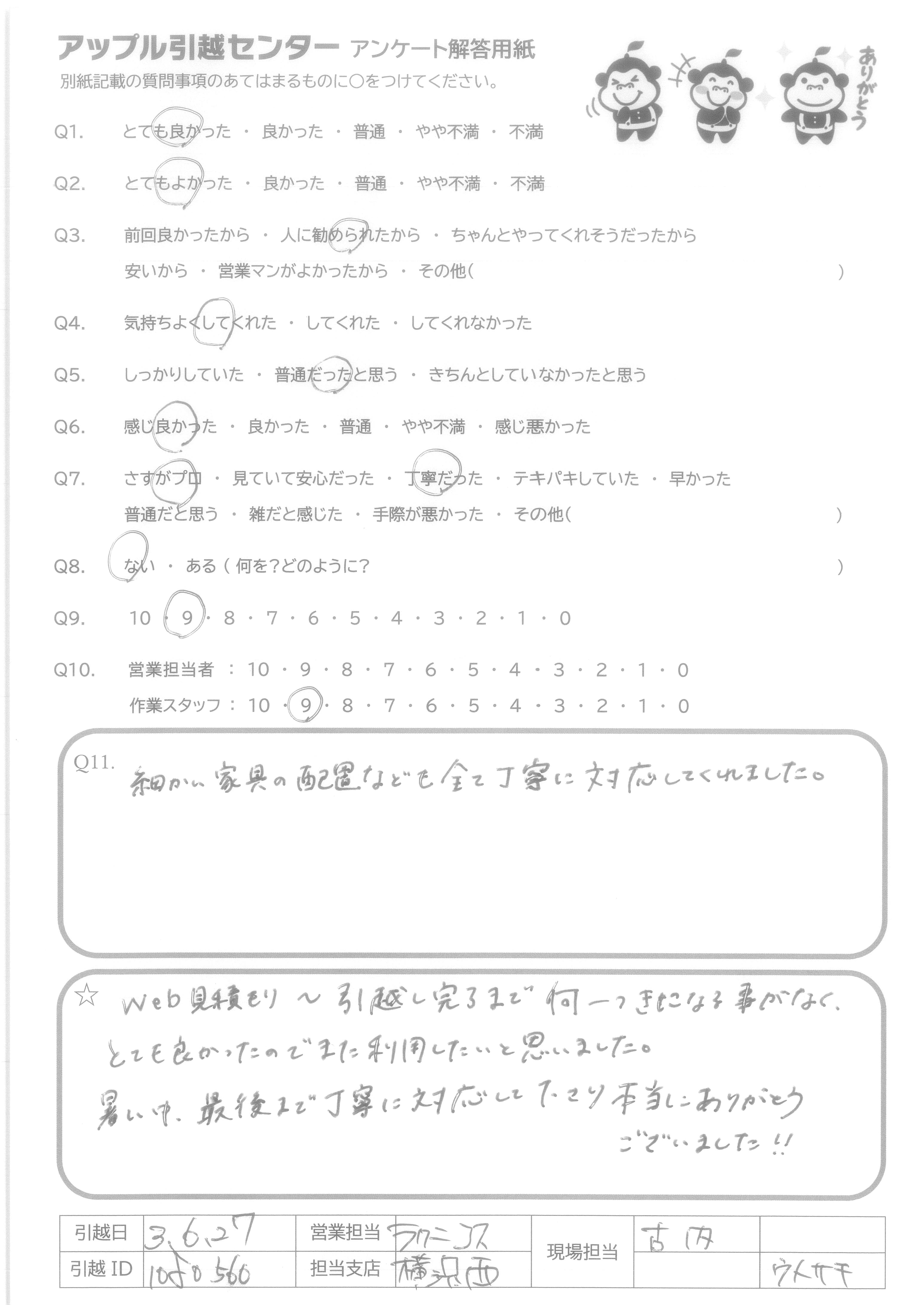 A.ひと通りの対応が良く、家具の配置を私に聞いて丁寧に置いてくれたから