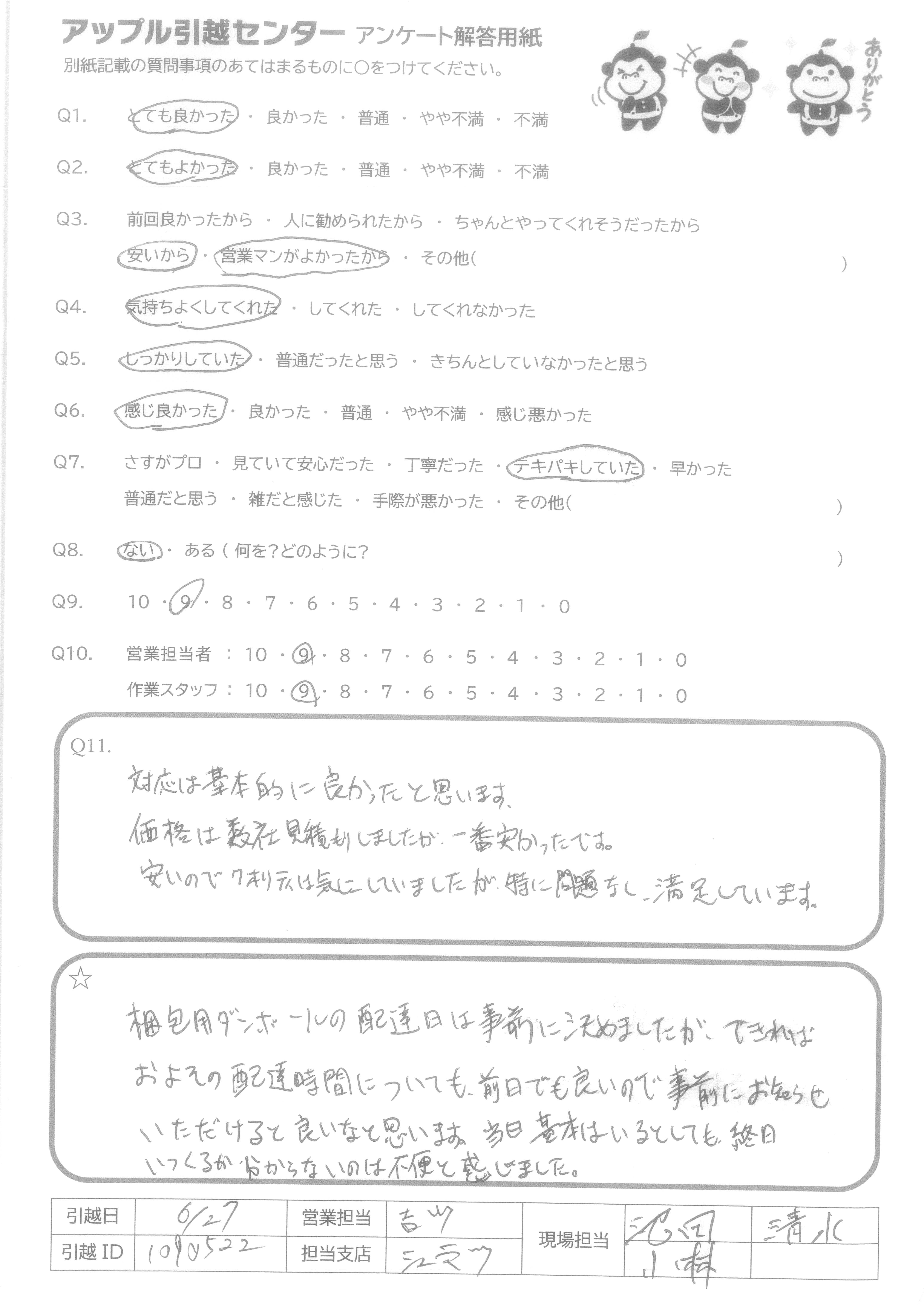 A.1度電話問い合わせした際に対応してくださった方も、 特に作業スタッフの方は感じが良く、とてもスムーズに、丁寧に仕事をしてくださり、大満足でした。もしまた引越す機会があれば、ぜひまたアップル引越センターの、今回対応してくださったスタッフの方にお願いしたいな、と強く思いました。ありがとうございました。