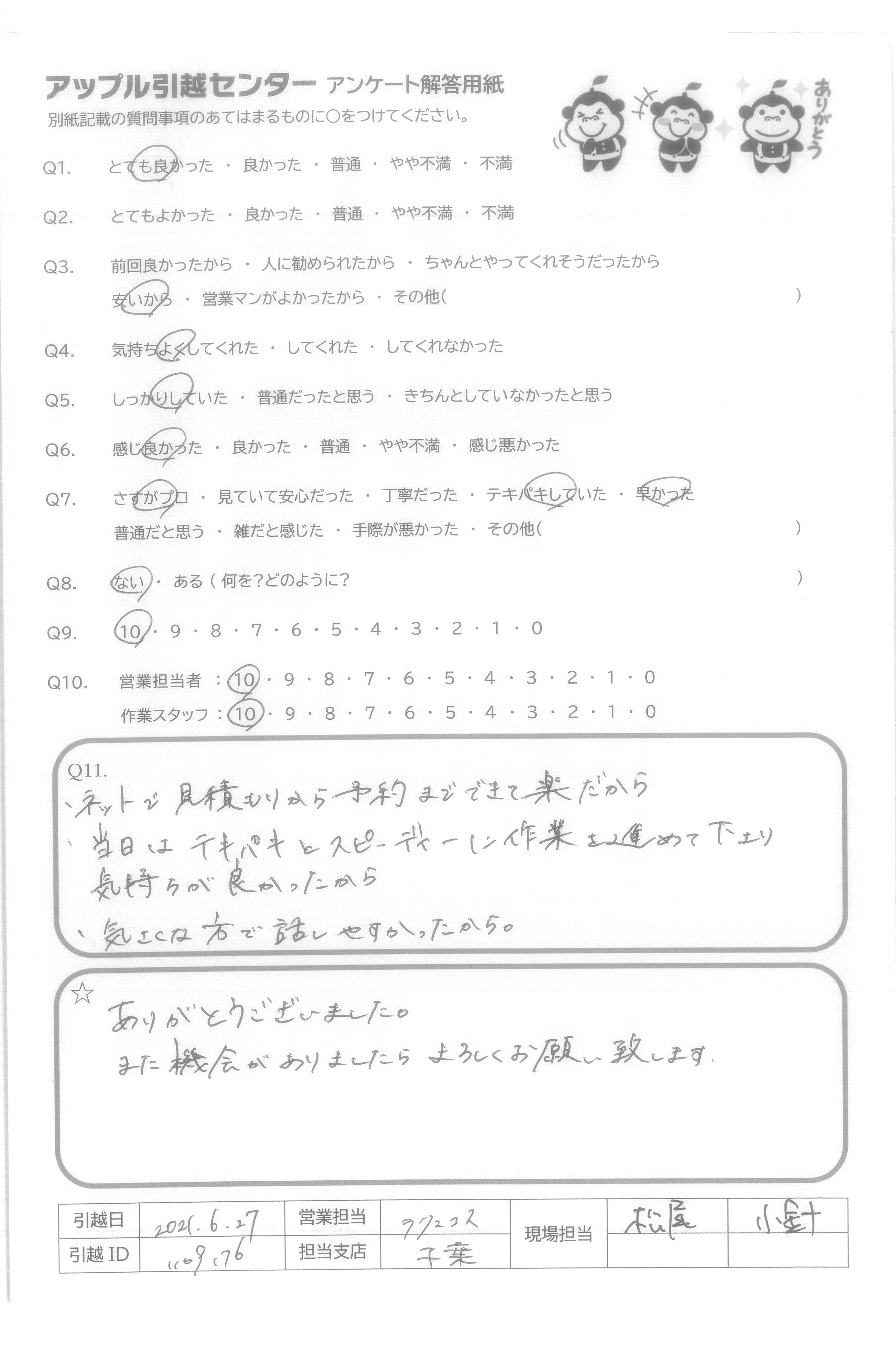 引越し日:2021年06月27日 エリア:千葉県市川市